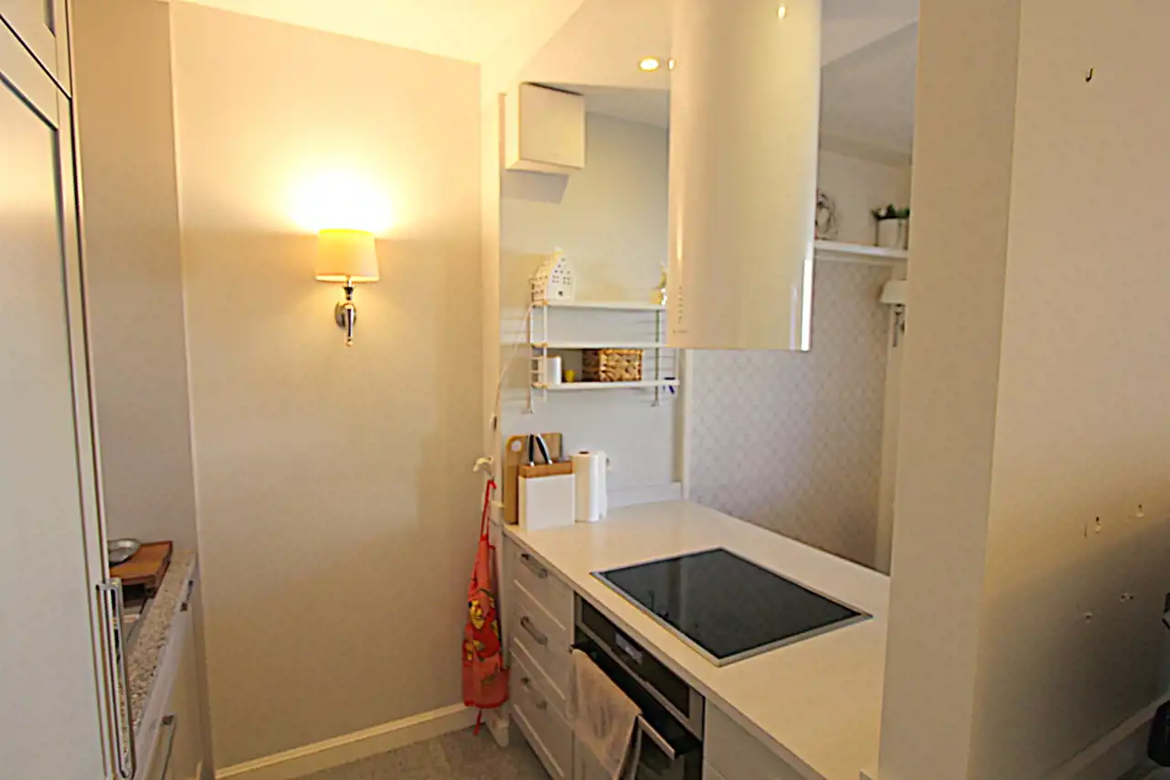 Kuchnia wyposażona jest w zabudowy stałe, sprzęt AGD (zmywarka, piekarnik, kuchenka indukcyjna, lodówka, okap).
