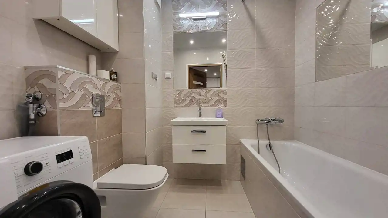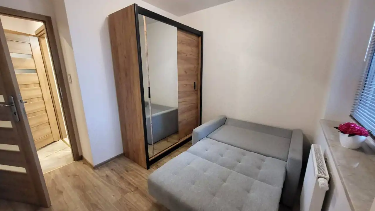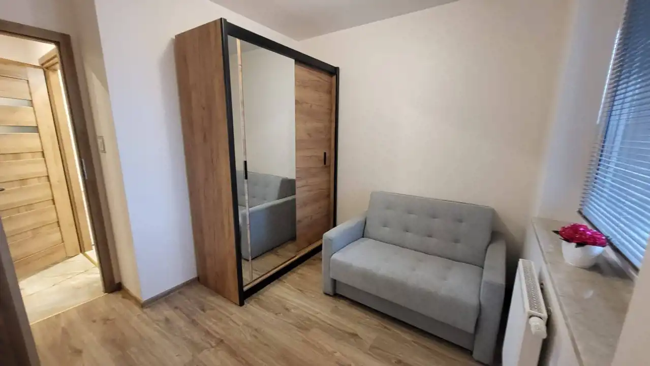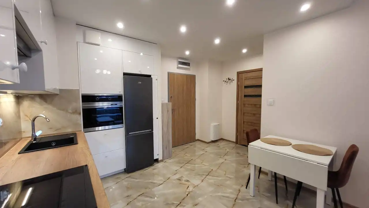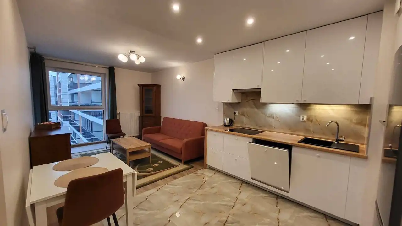 Lokal składa się z: sypialni, salonu z którego jest wyjście na duży, taras o pow. ok. 7m2, aneksu kuchennego, przestronnej łazienki z wc oraz przedpokoju. Mieszkanie zostało wykończone według najnowszych trendów, jest zadbane i gotowe do zamieszkania. W mieszkaniu znajduje się zabudowa kuchni, wraz ze sprzętem AGD: zmywarka, lodówko-zamrażarka, płyta indukcyjna, piekarnik, pralka automatyczna, sypialnia została wyposażona w następujące meble: podwójne łóżko, szafa.