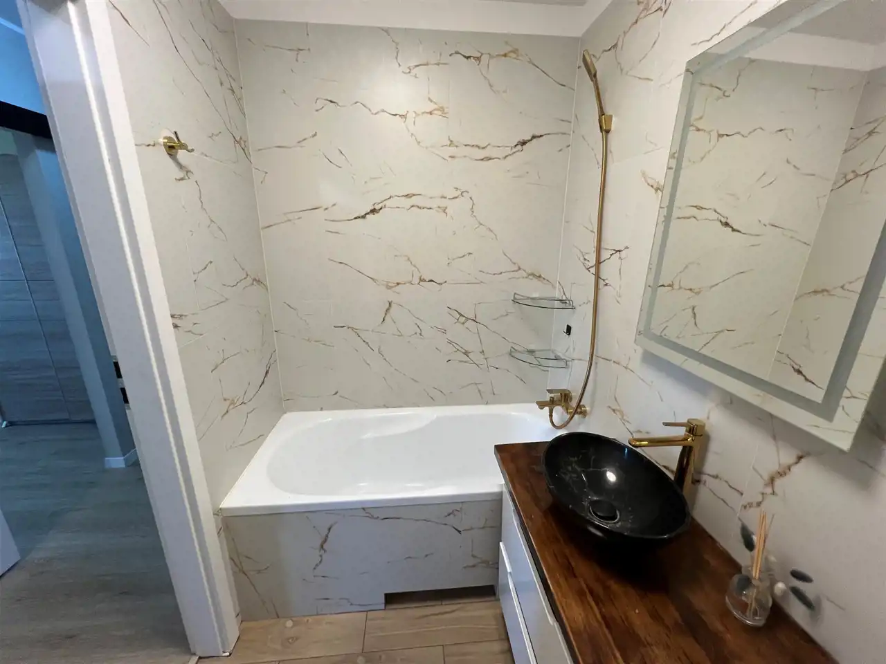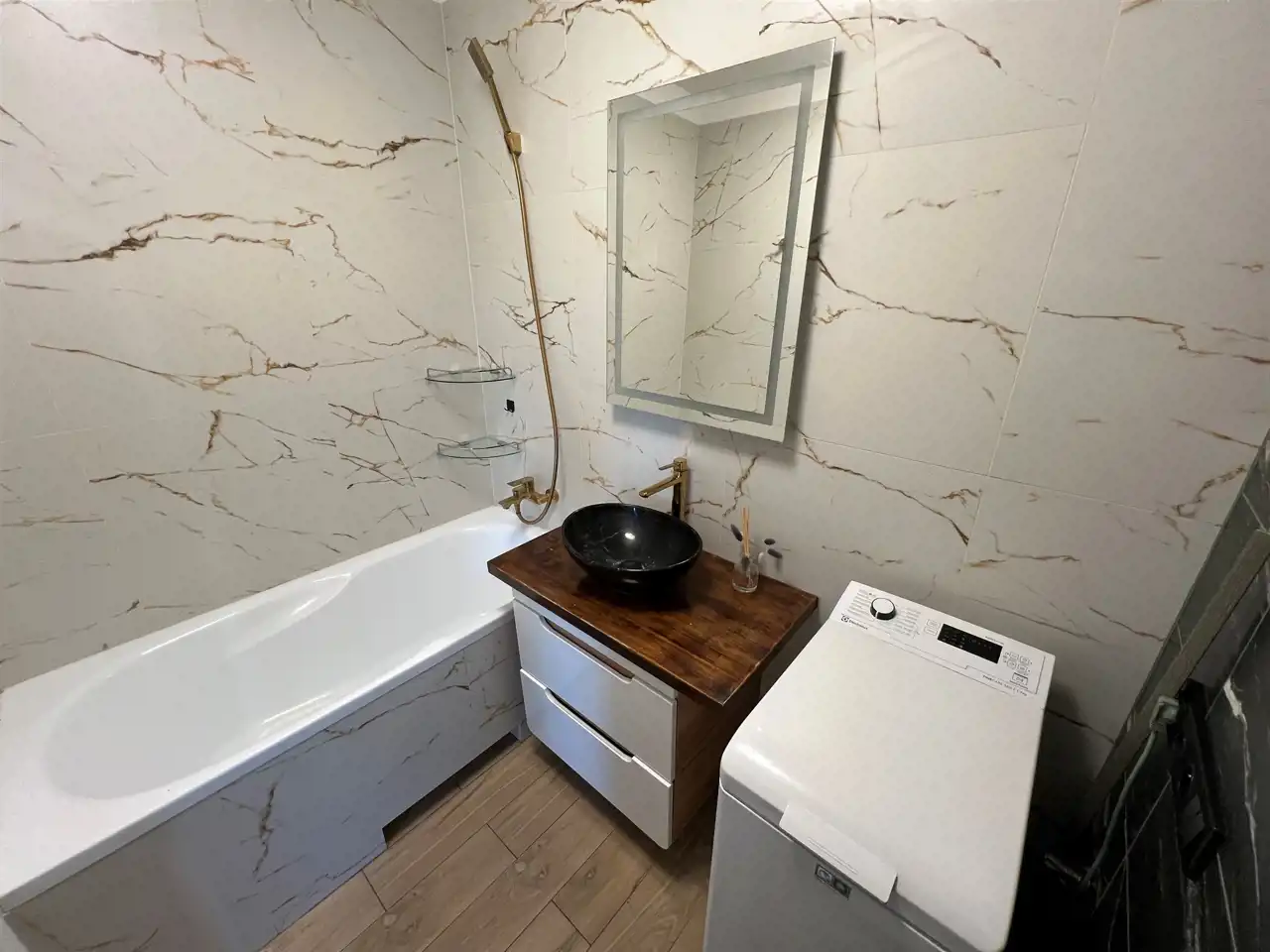 W łazience znajduje się wanna i pralka, w kuchni zabudowa oraz sprzęty AGD. Pokoje również gotowe są do zamieszkania.