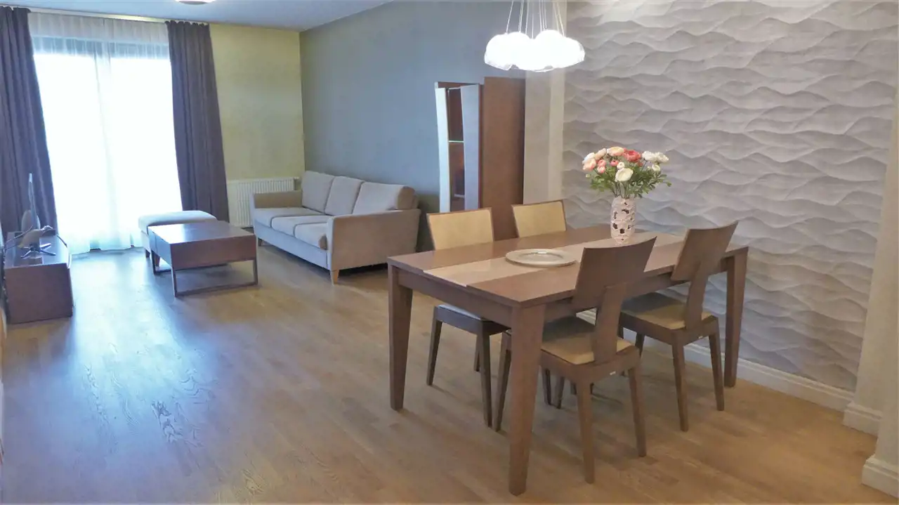 Mieszkanie - o powierzchni ponad 60 m2 składające się z kuchni połączonej z salonem, salonu z wyjściem na taras, sypialni z wyjściem na taras, gabinetu, łazienki i przedpokoju. Wnętrze zostało zaaranżowane przez architekta wnętrz i wykończone materiałami wysokiej jakości. Lokal jest całkowicie umeblowany i wyposażony we wszystkie sprzęty użytku domowego oraz utrzymany w ekologicznej kolorystyce.