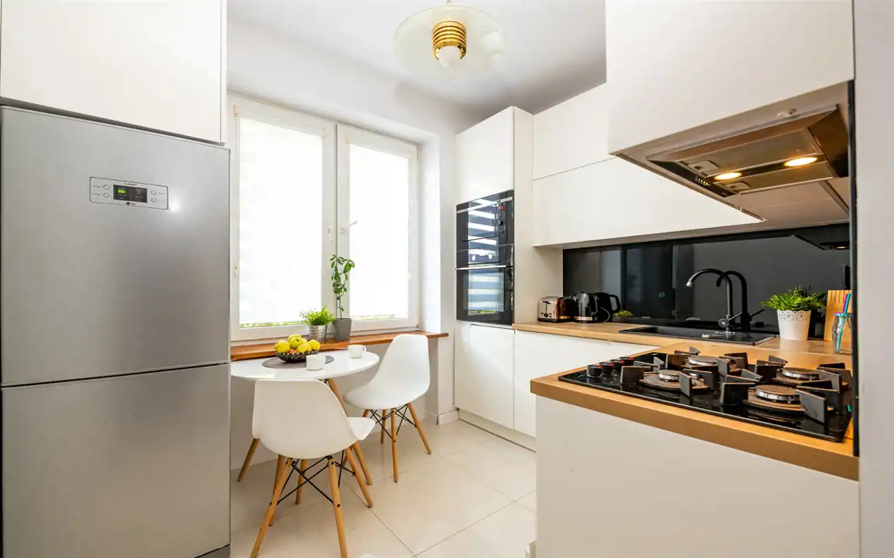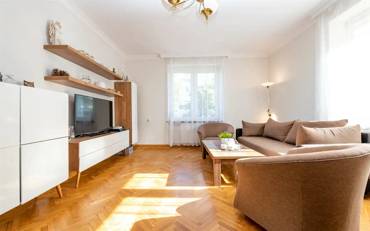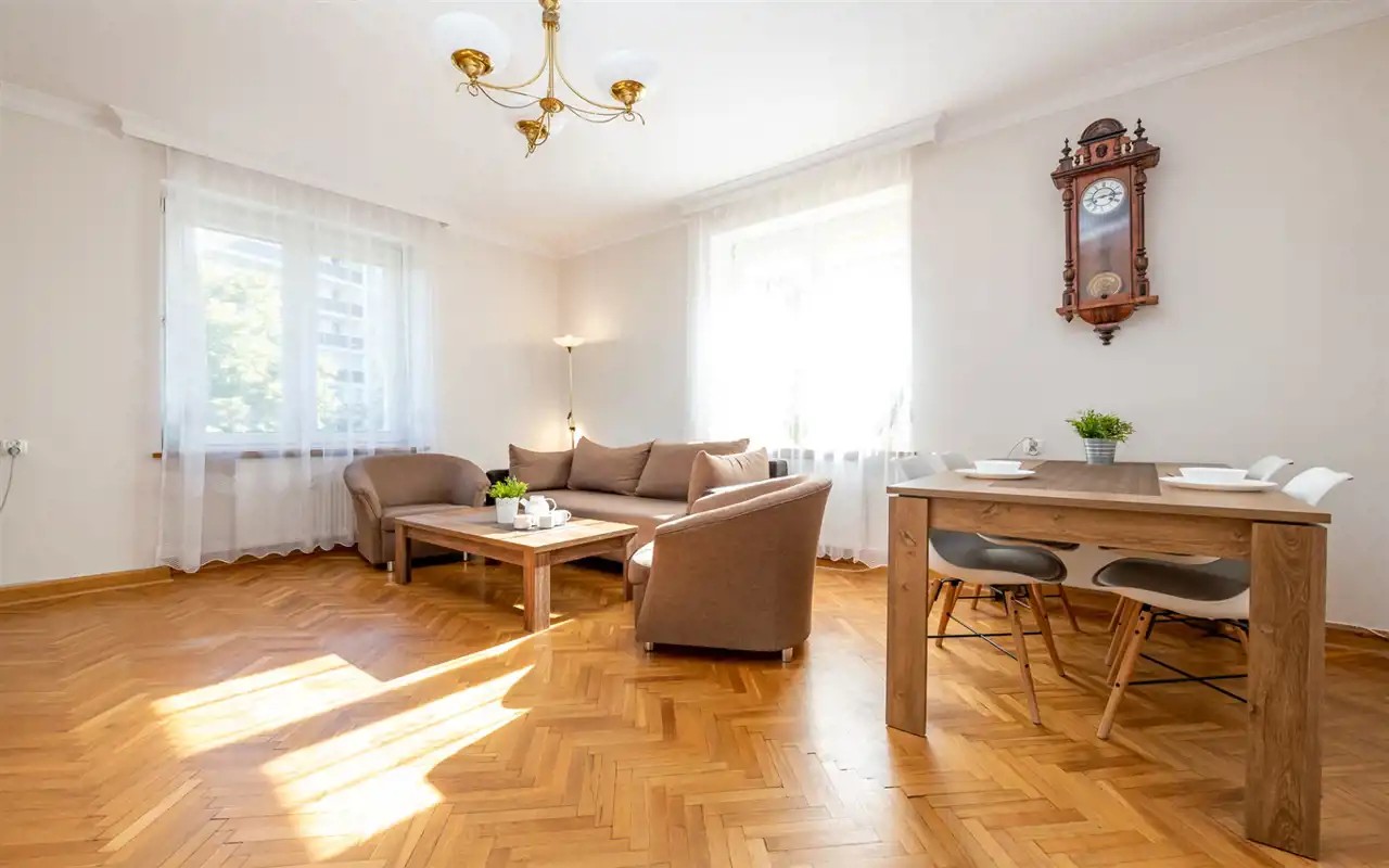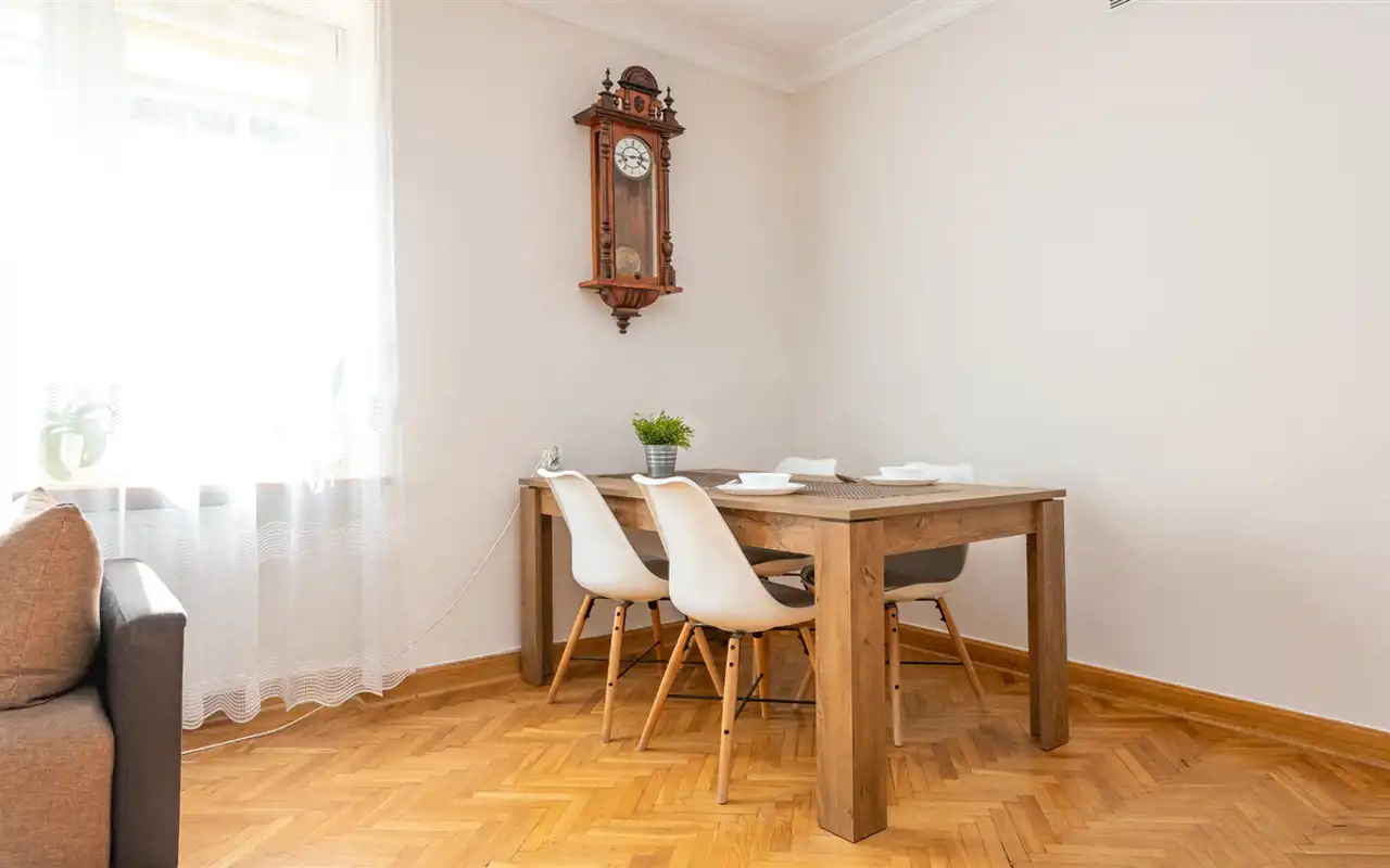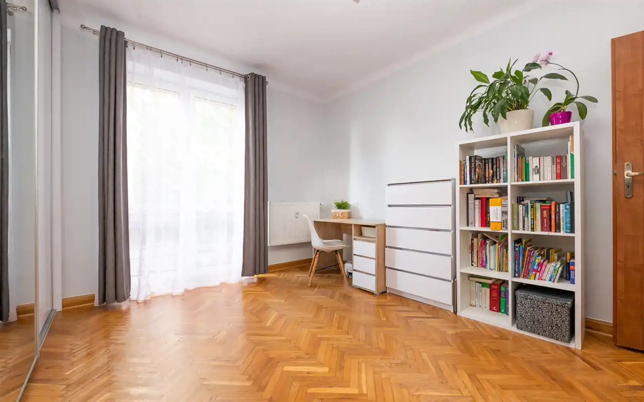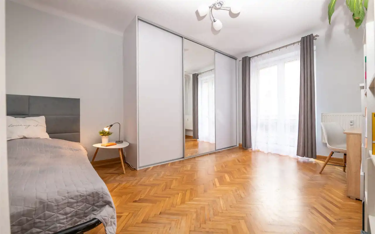 Dodatkowym atutem jest balkon oraz duża piwnica – idealna na rowery lub dodatkowe przechowywanie. Mieszkanie jest w pełni umeblowane i wyposażone, a niestandardowa wysokość pomieszczeń zapewnia poczucie przestrzeni i komfortu. W kuchni znajduje się komplet niezbędnego sprzętu AGD, w tym zmywarka. W salonie wygodna duża sofa, fotele oraz stół z krzesłami – idealne miejsce do nauki i spotkań. W sypialni m.in. szafa w zabudowie oraz komfortowe łóżko.