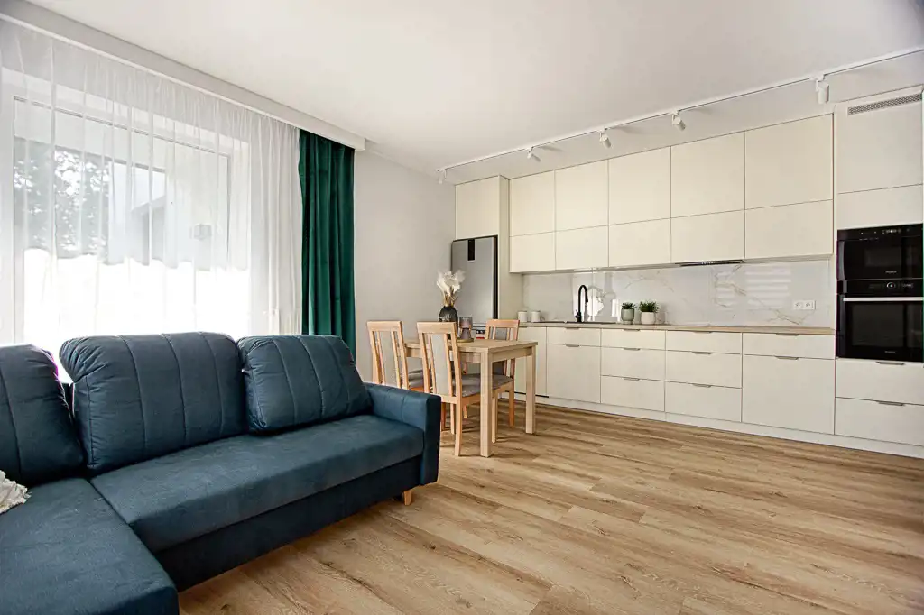 Wnętrza zaprojektowane w spójnym i ponadczasowym stylu widocznym od samego wejścia. Dodatkowym atutem są wysokie okna zapewniające optymalny dostęp światła dziennego.