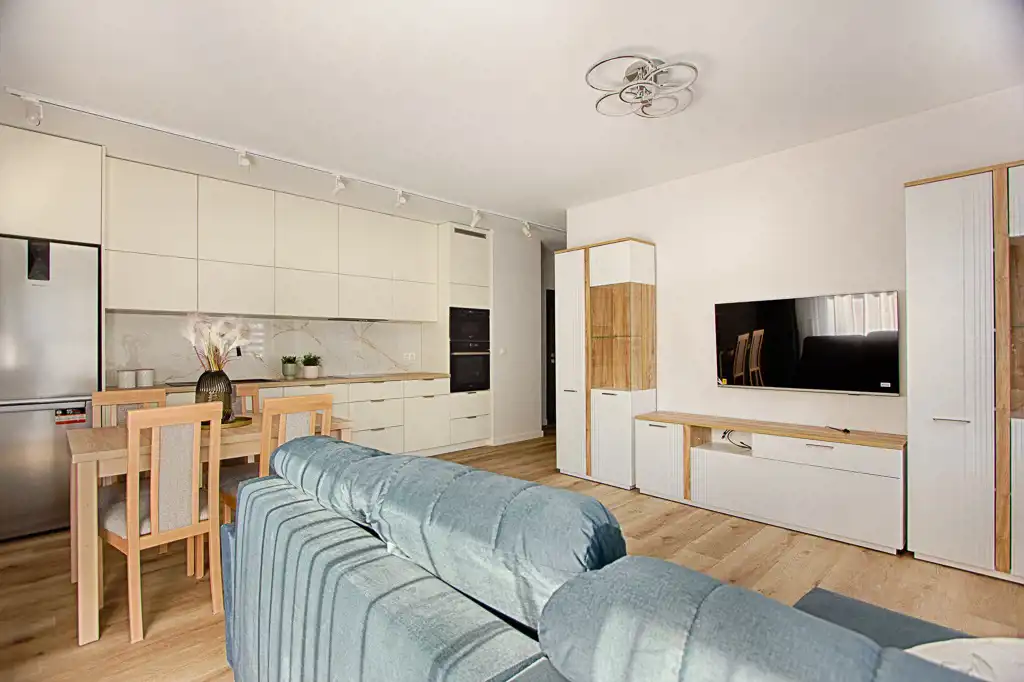 - salon z aneksem kuchennym oraz jadalnią z wyjściem na balkon