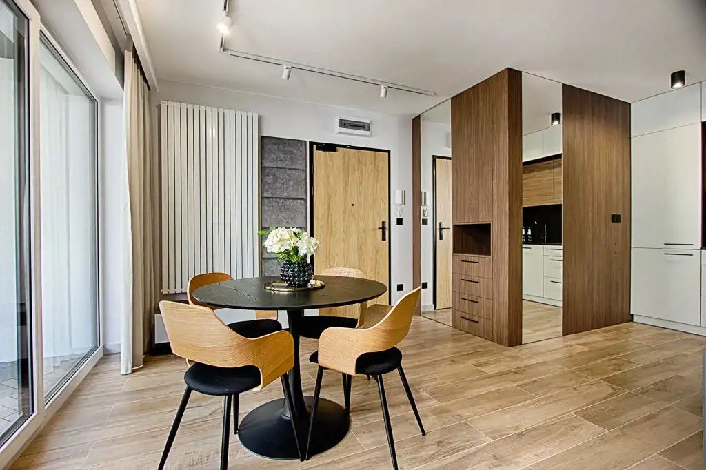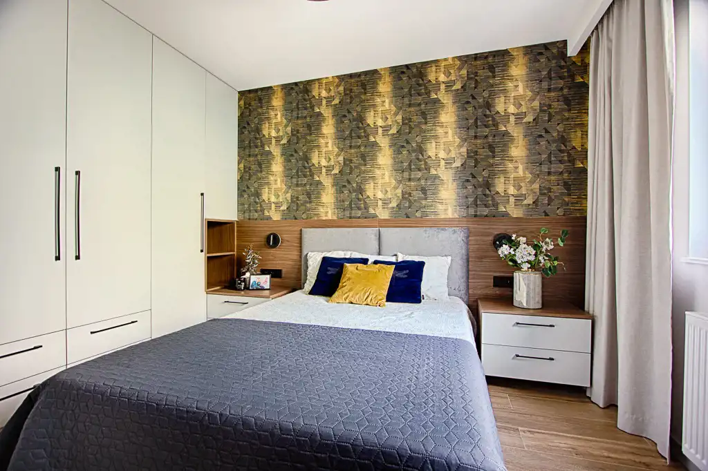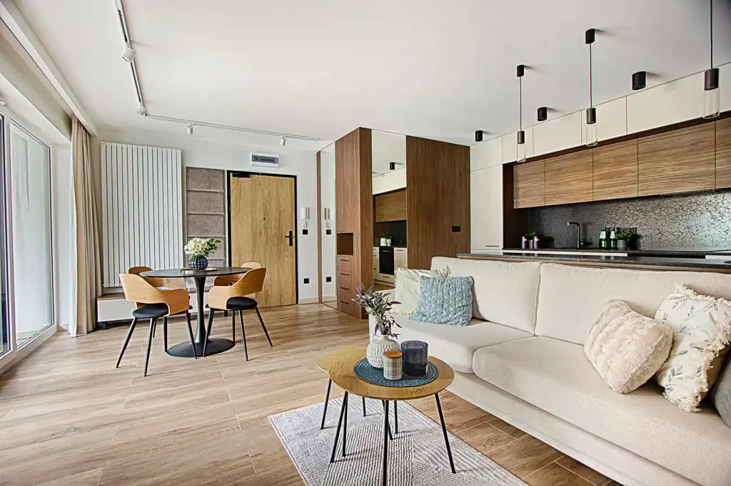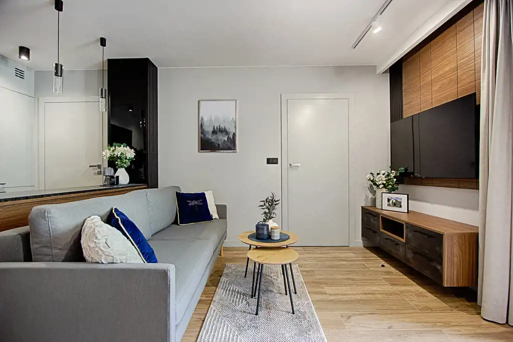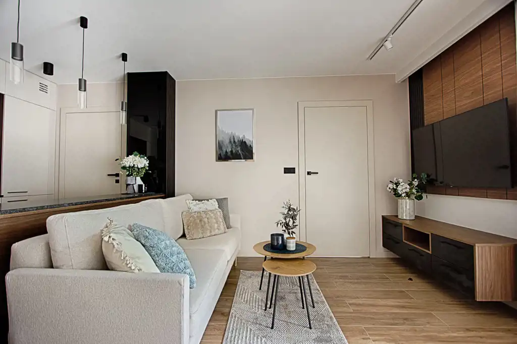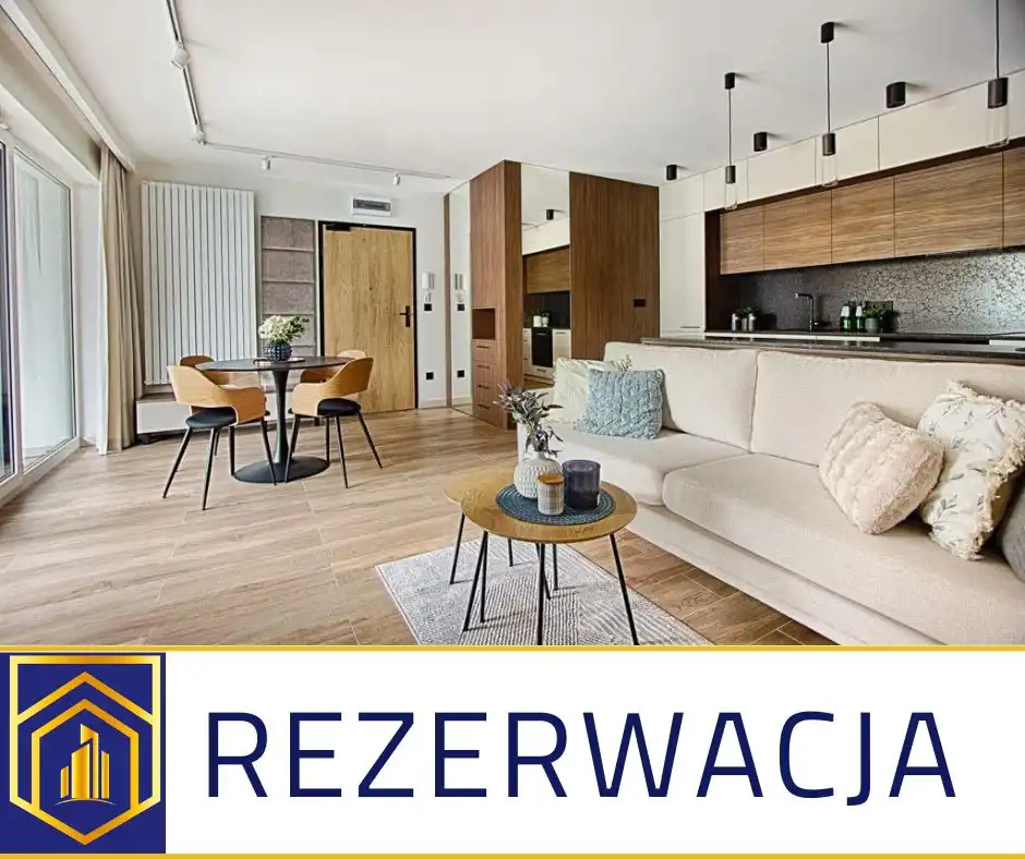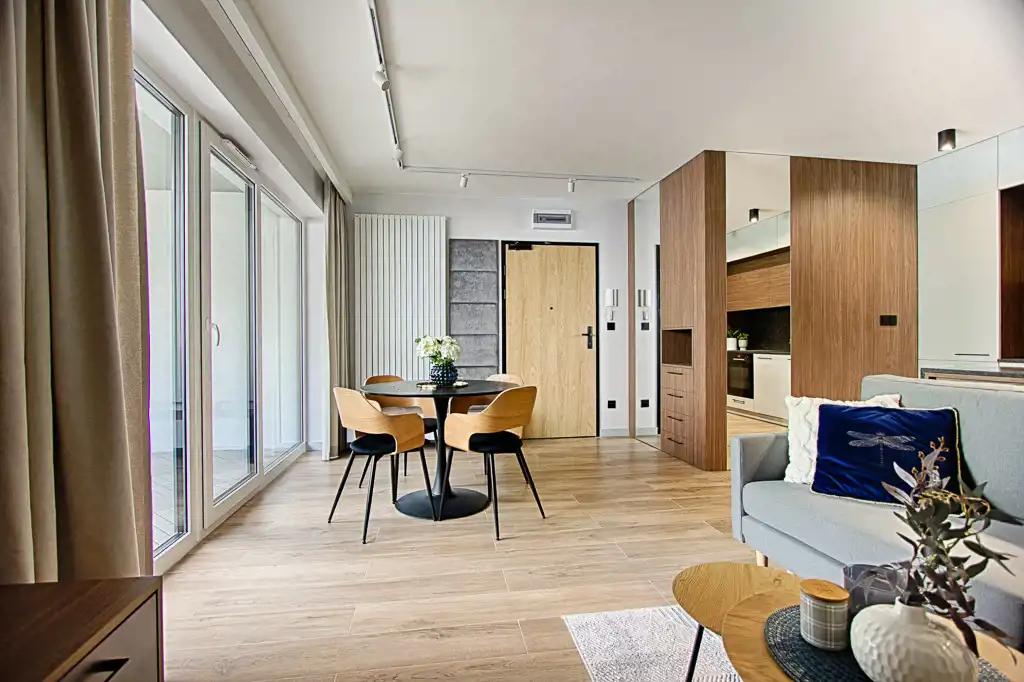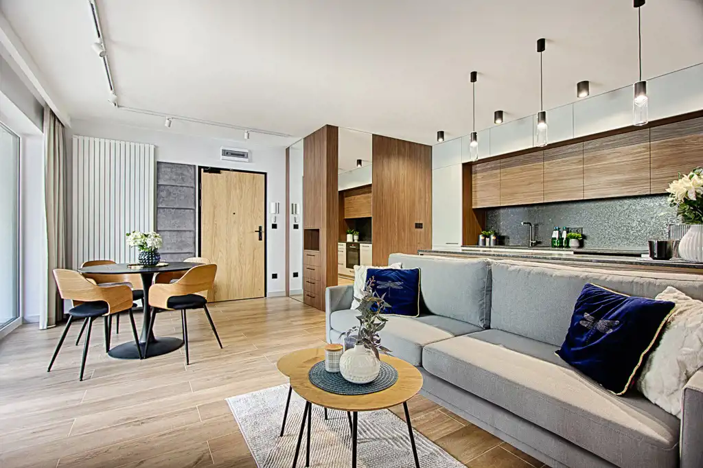 Na powierzchnię 45,74 m2 składa się przestronny aneks kuchenny z salonem i wyjściem na balkon, sypialnia oraz łazienka. Wnętrze wykończone w nowoczesnym i funkcjonalnym stylu. Kuchnia doskonale wyposażona, znajduje się w niej zmywarka, płyta indukcyjna, piekarnik, okap, oraz lodówka. Jasny salon z wygodną kanapą, telewizorem oraz z miejscem na strefę śniadaniową Sypialnia z łóżkiem i komodą. Łazienka z wc oraz kabiną typu walk-in, zaś w przedpokoju funkcjonalna zabudowa oraz garderoba.