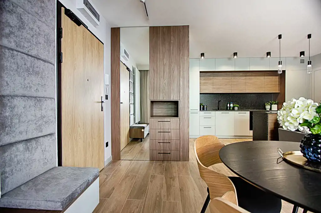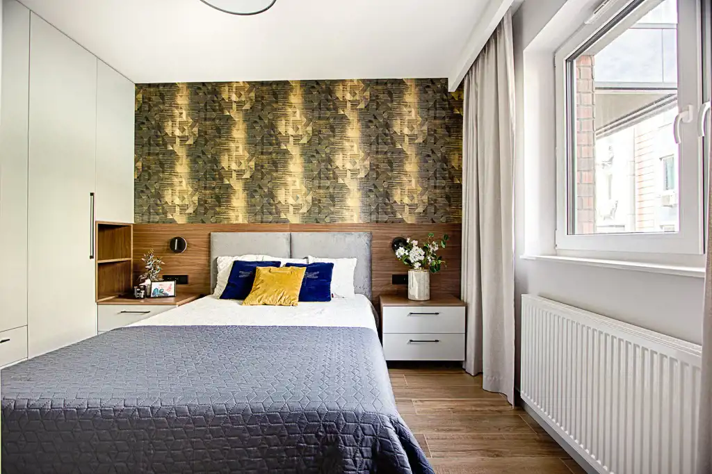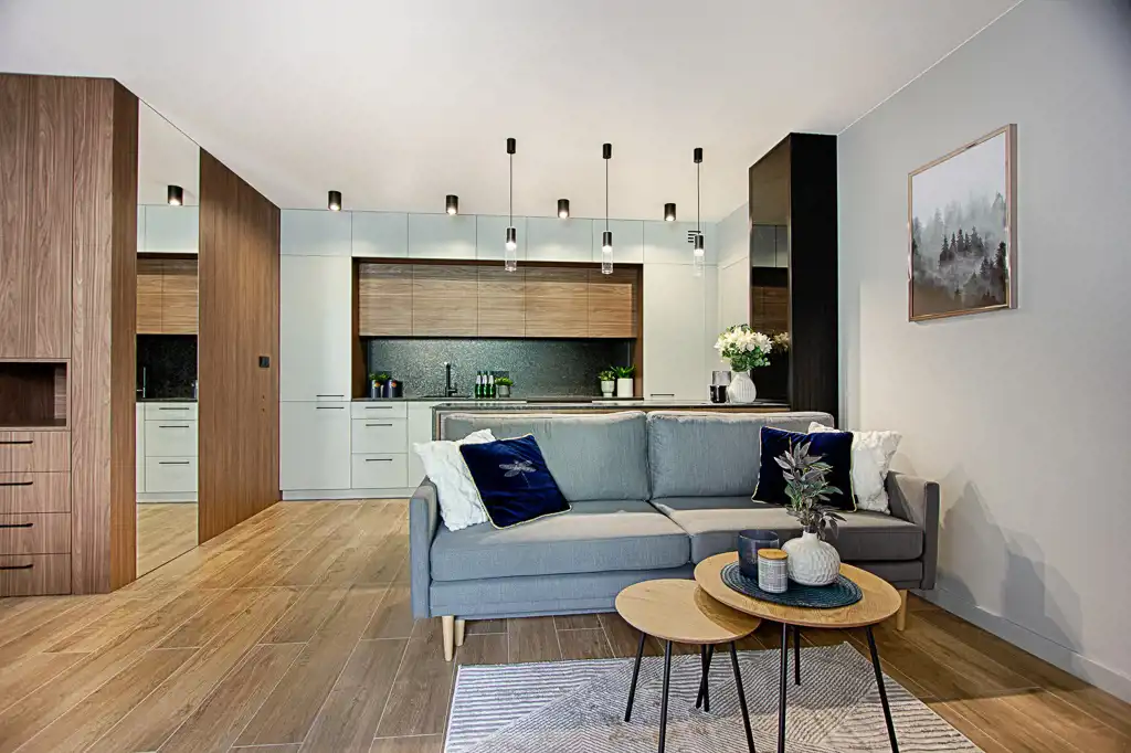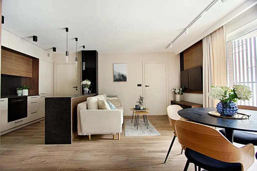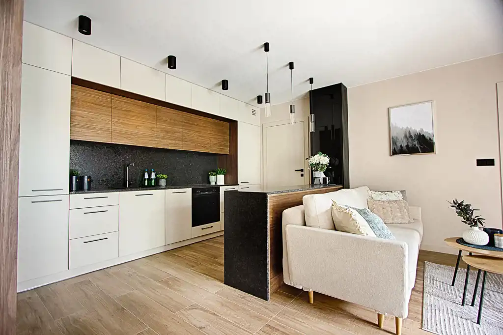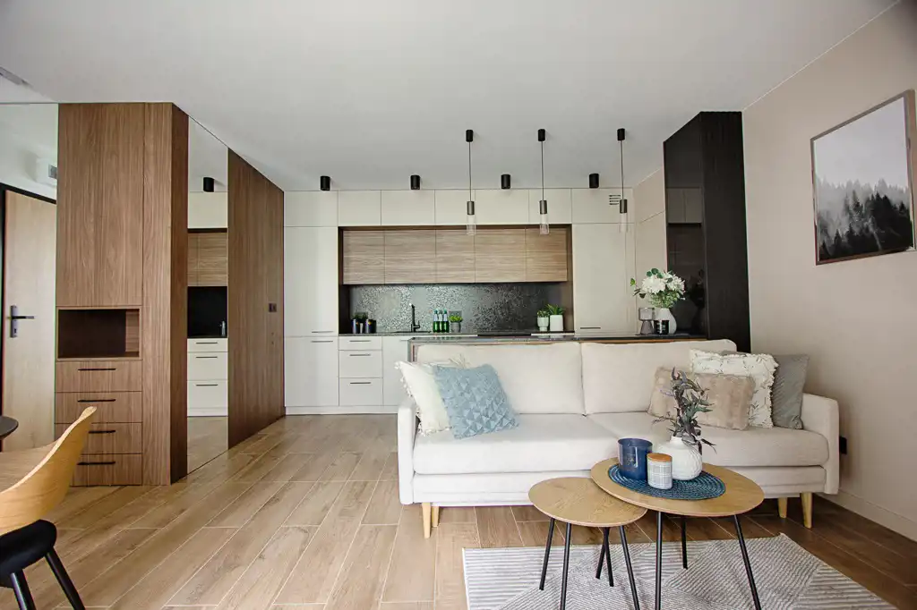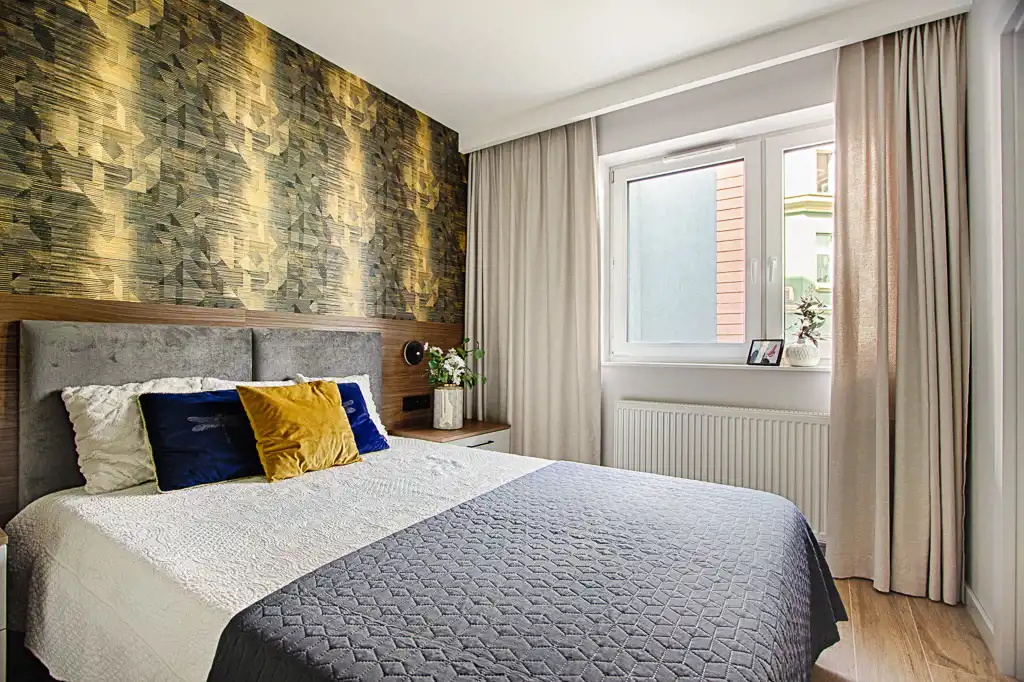 Na powierzchnię 45,74 m2 składa się przestronny aneks kuchenny z salonem i wyjściem na balkon, sypialnia oraz łazienka. Wnętrze wykończone w nowoczesnym i funkcjonalnym stylu. Kuchnia doskonale wyposażona, znajduje się w niej zmywarka, płyta indukcyjna, piekarnik, okap, oraz lodówka. Jasny salon z wygodną kanapą, telewizorem oraz z miejscem na strefę śniadaniową Sypialnia z łóżkiem i komodą. Łazienka z wc oraz kabiną typu walk-in, zaś w przedpokoju funkcjonalna zabudowa oraz garderoba.