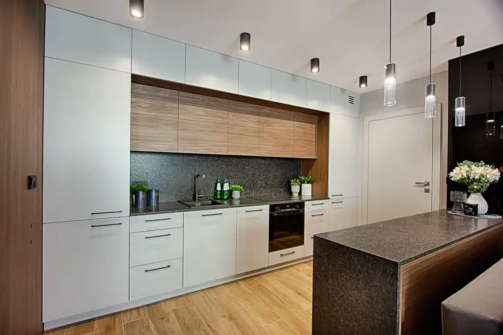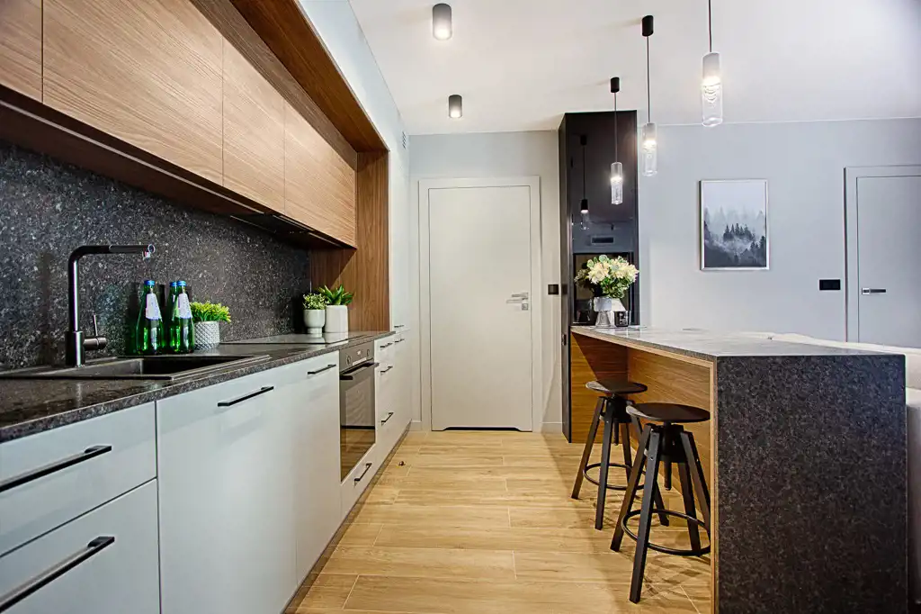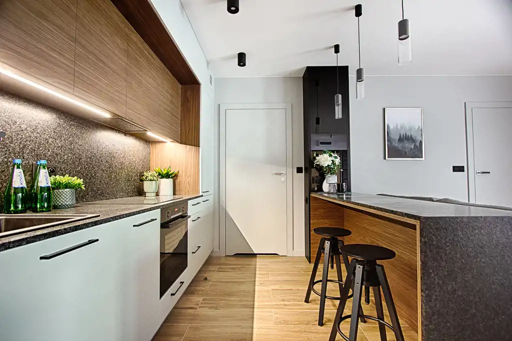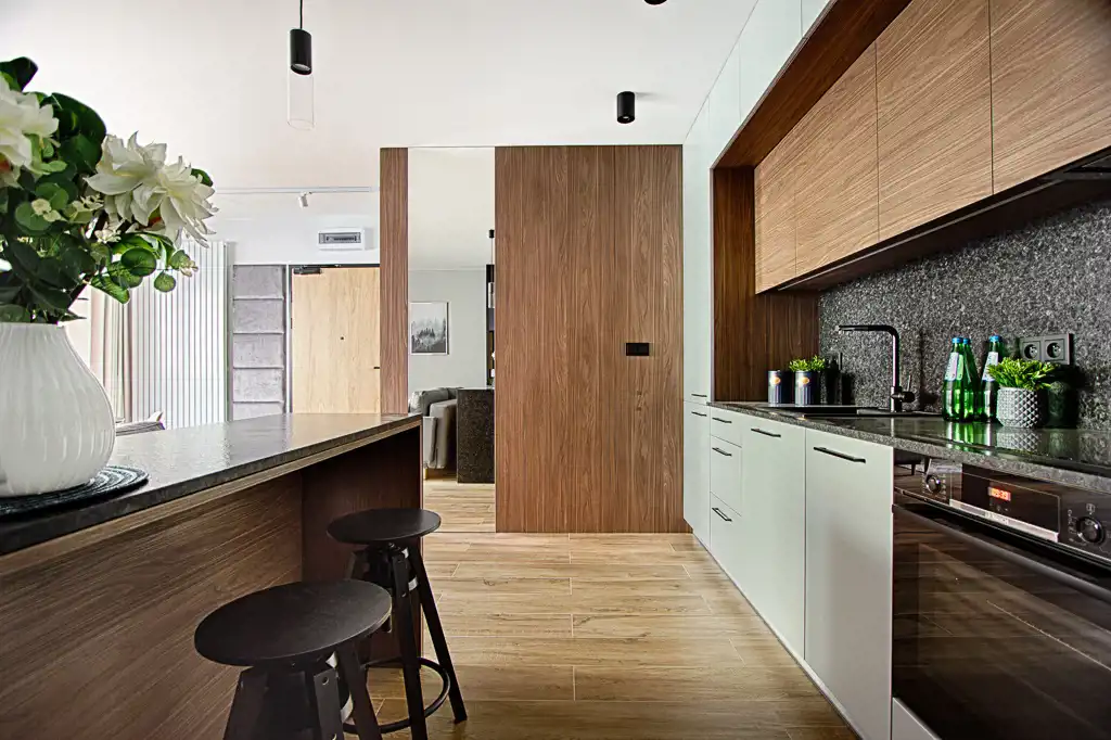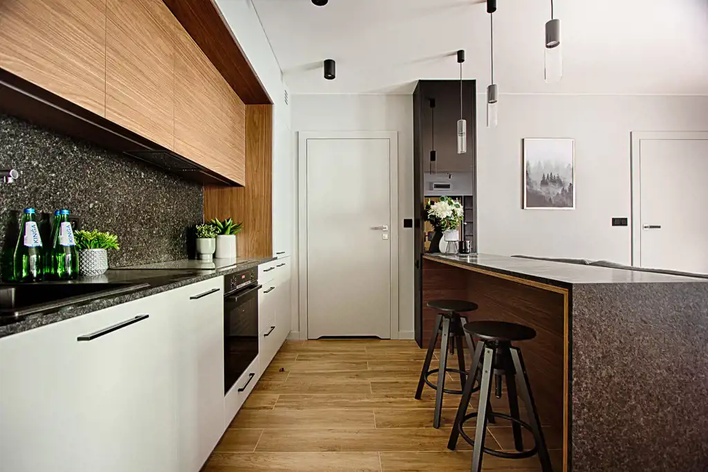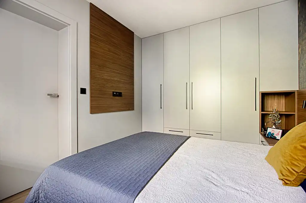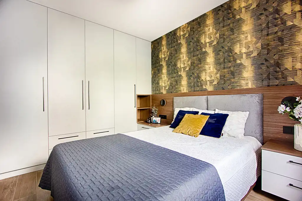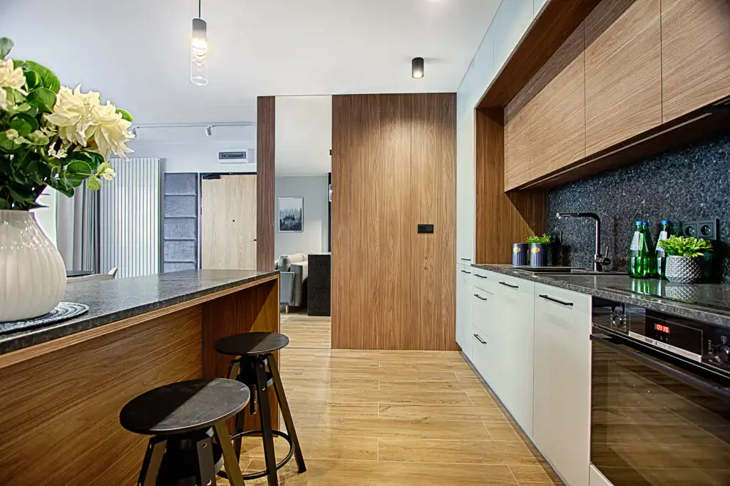 Na powierzchnię 45,74 m2 składa się przestronny aneks kuchenny z salonem i wyjściem na balkon, sypialnia oraz łazienka. Wnętrze wykończone w nowoczesnym i funkcjonalnym stylu. Kuchnia doskonale wyposażona, znajduje się w niej zmywarka, płyta indukcyjna, piekarnik, okap, oraz lodówka. Jasny salon z wygodną kanapą, telewizorem oraz z miejscem na strefę śniadaniową Sypialnia z łóżkiem i komodą. Łazienka z wc oraz kabiną typu walk-in, zaś w przedpokoju funkcjonalna zabudowa oraz garderoba.
