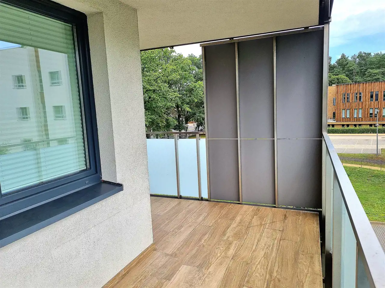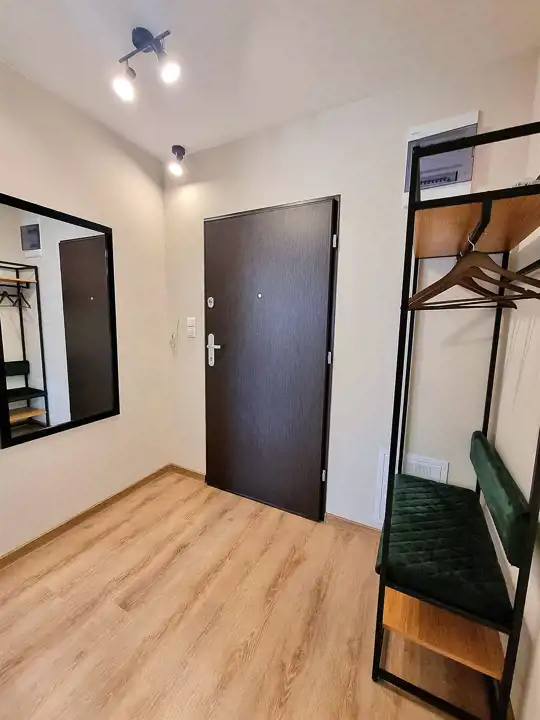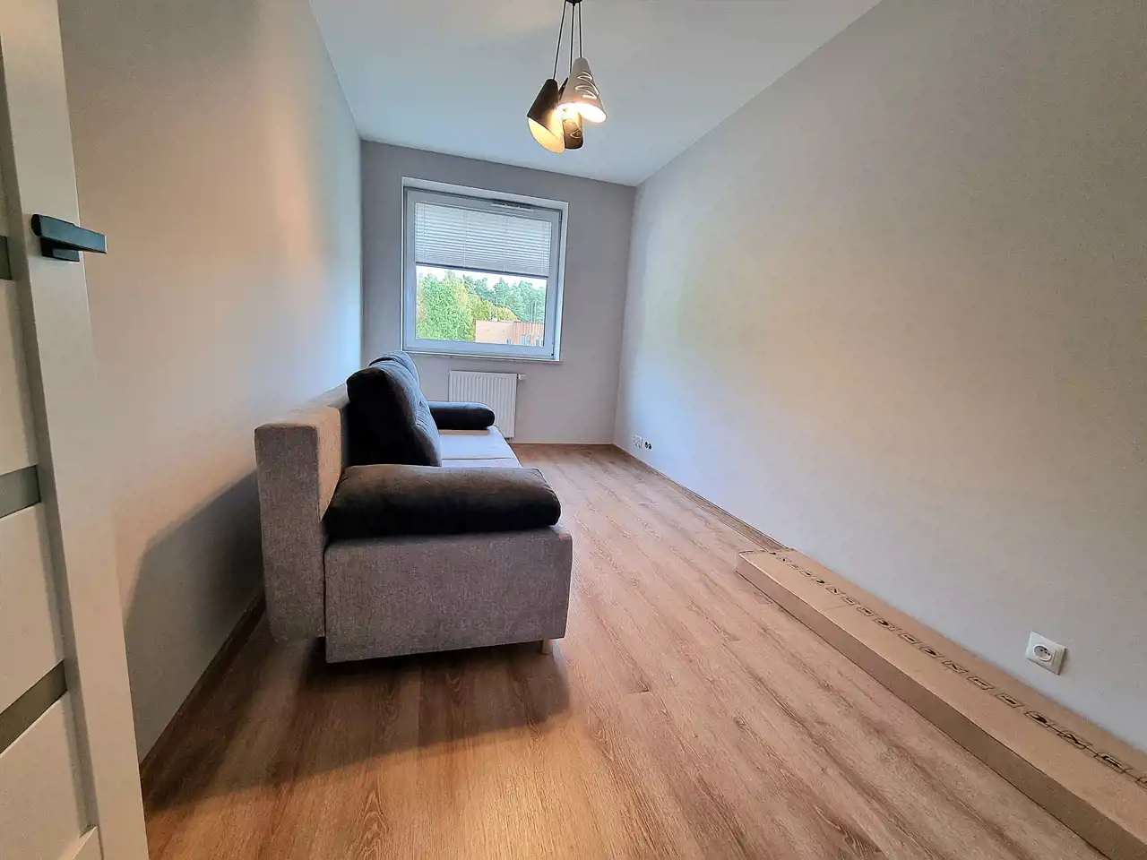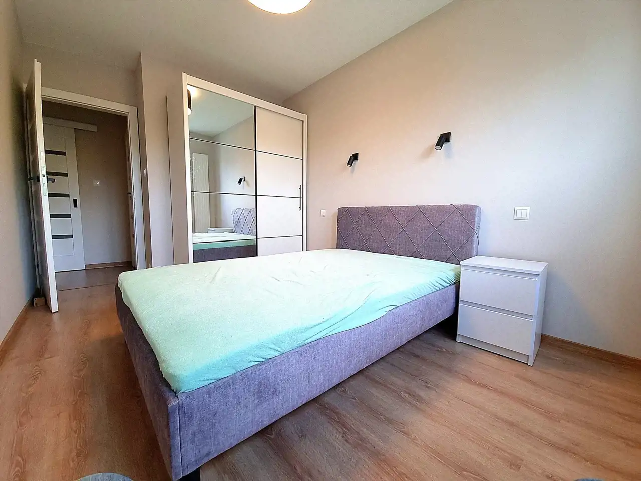 Do dyspozycji lokatora jest duży salon z kanapą, stołem i telewizorem w salonie, wyposażonym w sprzęt AGD aneksem kuchennym, łazienka z wanną i pralką, korytarz z garderobą, duży balkon z widokiem na tereny zielone, piwnica oraz miejsce postojowe w podziemnym garażu.