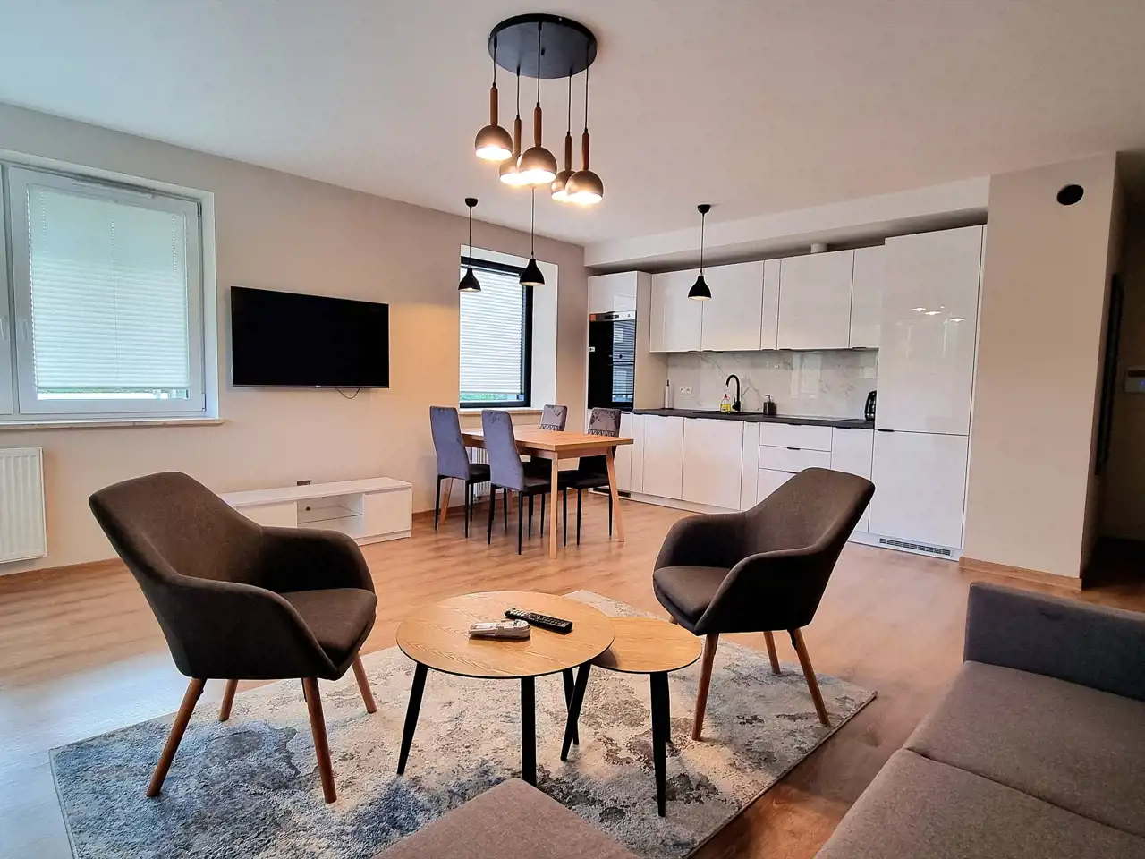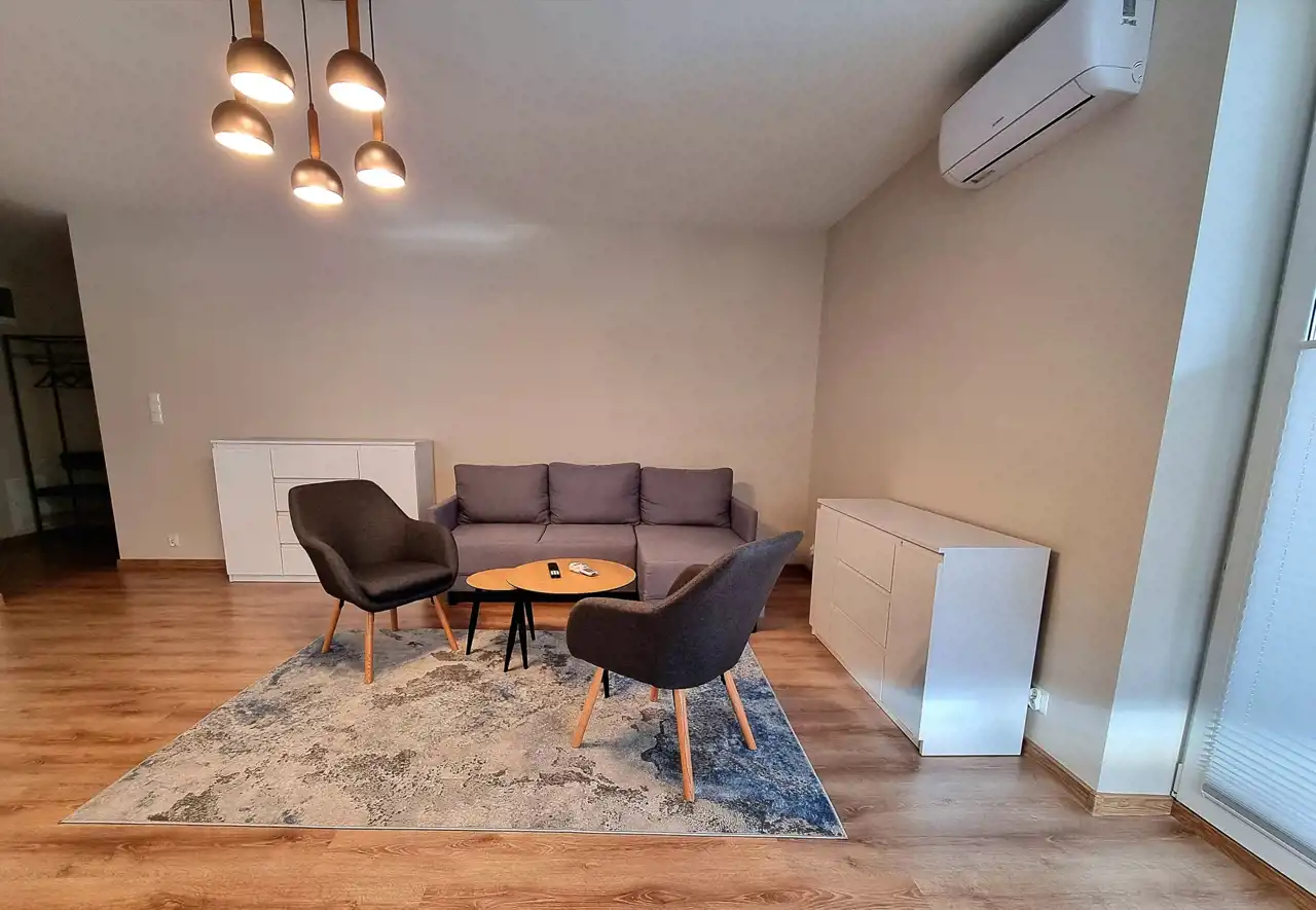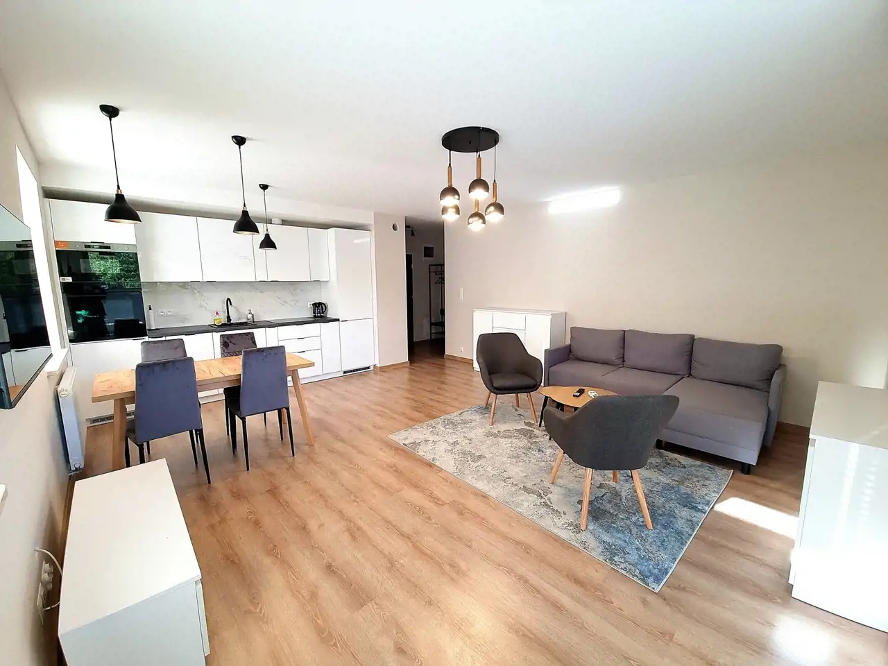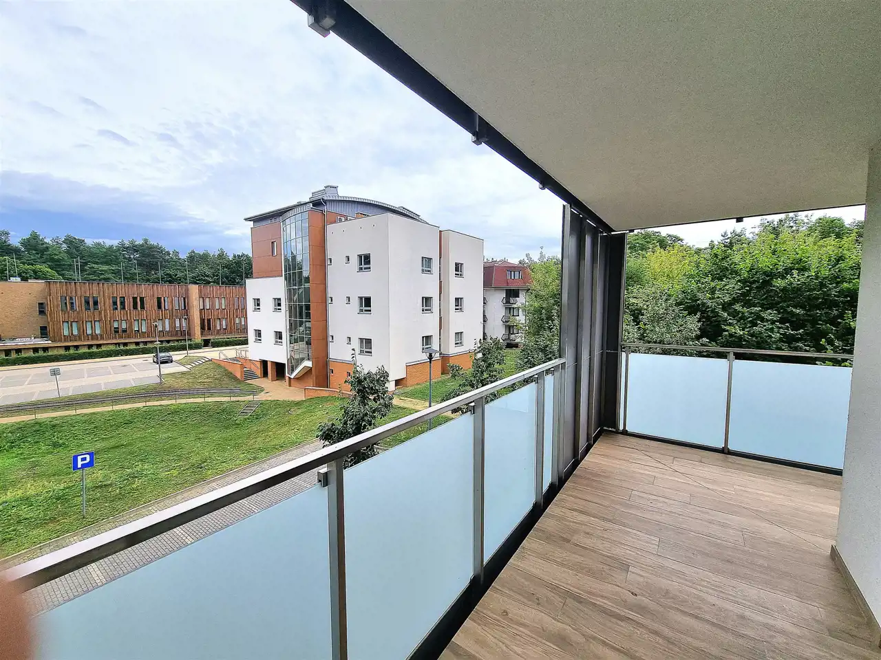 Do dyspozycji lokatora jest duży salon z kanapą, stołem i telewizorem w salonie, wyposażonym w sprzęt AGD aneksem kuchennym, łazienka z wanną i pralką, korytarz z garderobą, duży balkon z widokiem na tereny zielone, piwnica oraz miejsce postojowe w podziemnym garażu.