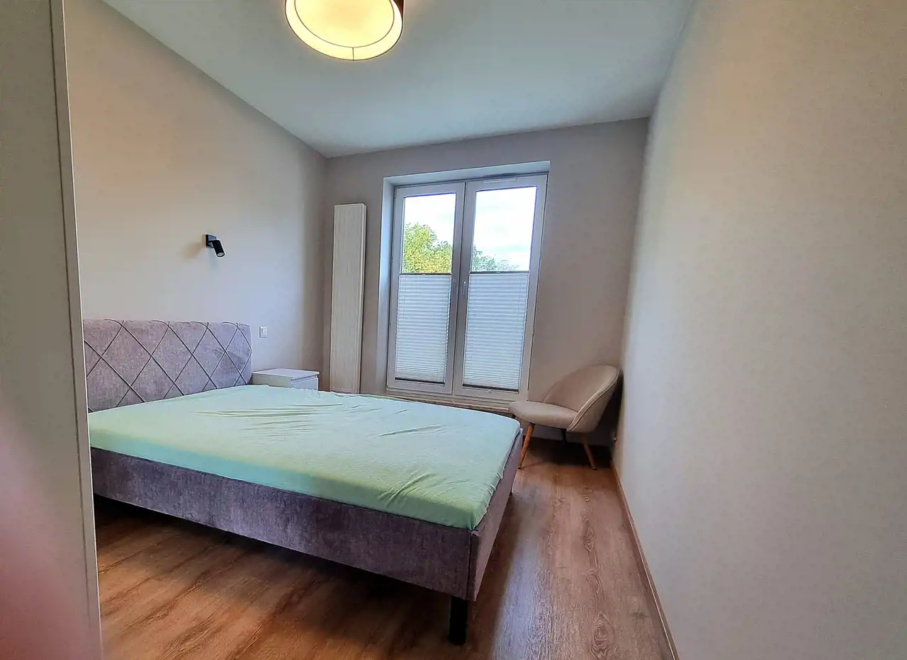 W większej sypialni łóżko dwuosobowe oraz szafa. W mniejszej sypialni - rozkładana kanapa.