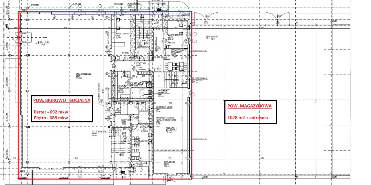 - FUNKCJA: handlowo-usługowa połączona z magazynem wysokiego składowania. Na parterze przewidziano część ekspozycyjną wraz z działem handlowym i częścią socjalną oraz magazyn wysokiego składowania z dobudowaną antresolą o nośności 500kg/m2. Piętro użytkowane jest na cele biurowe.