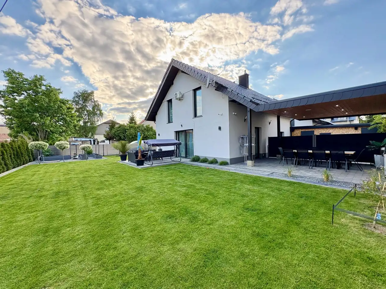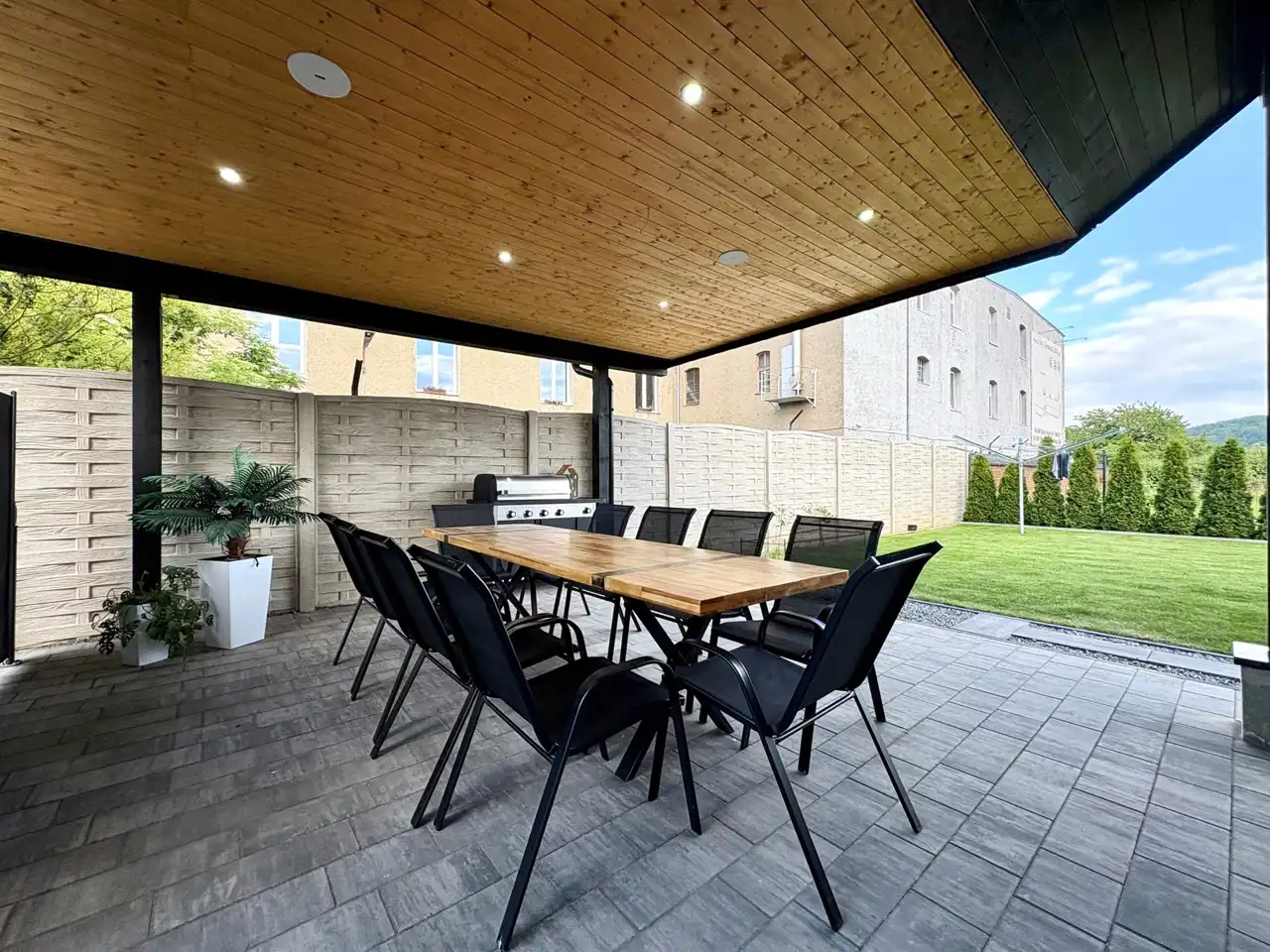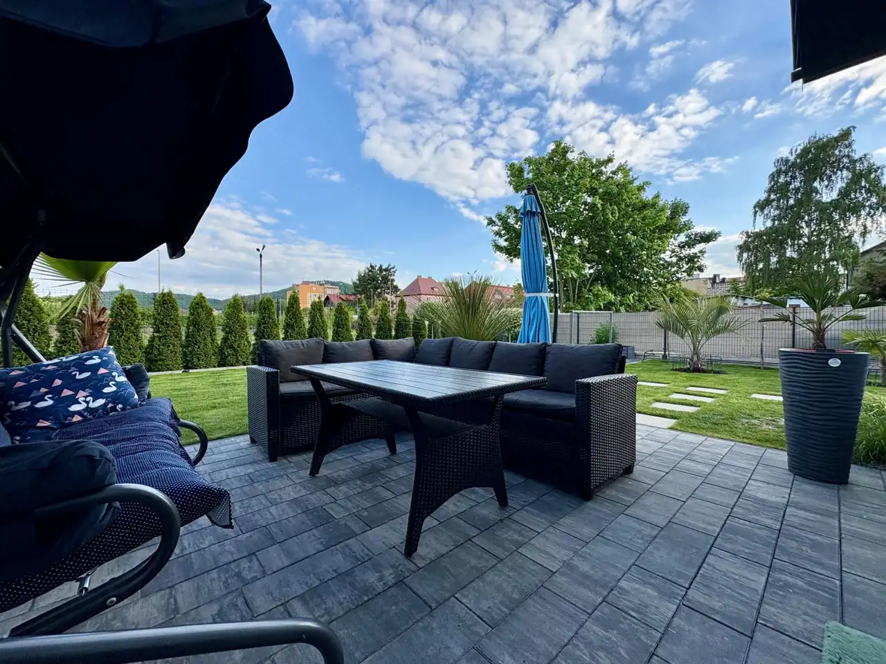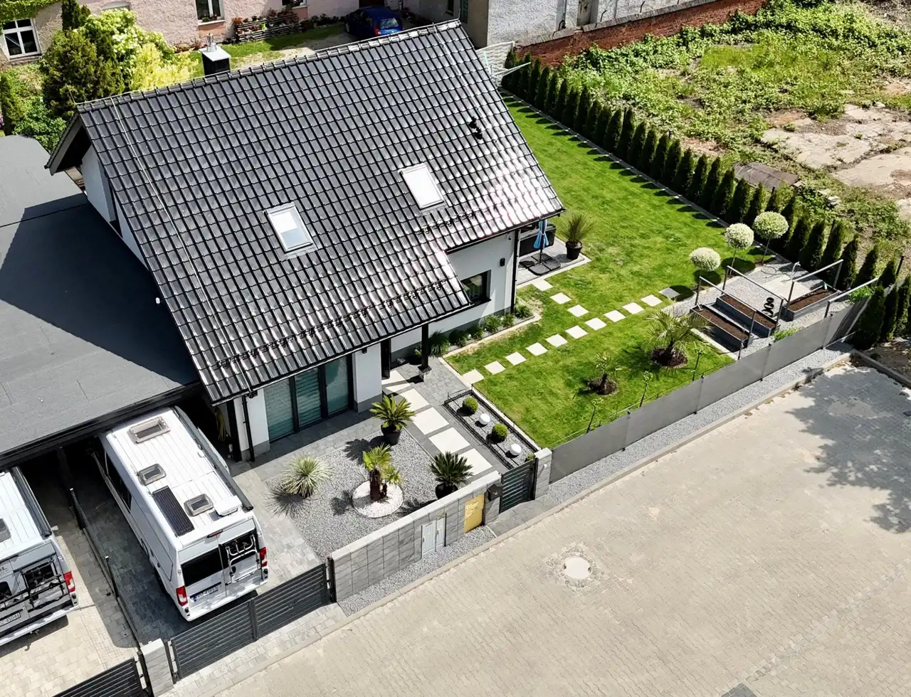 Pięknie zaprojektowany i utrzymany ogród wraz z dwiema strefami relaksu, w tym zadaszonym tarasem z miejscem do grillowania, gdzie znajdziemy duży stół dla 10 osób.