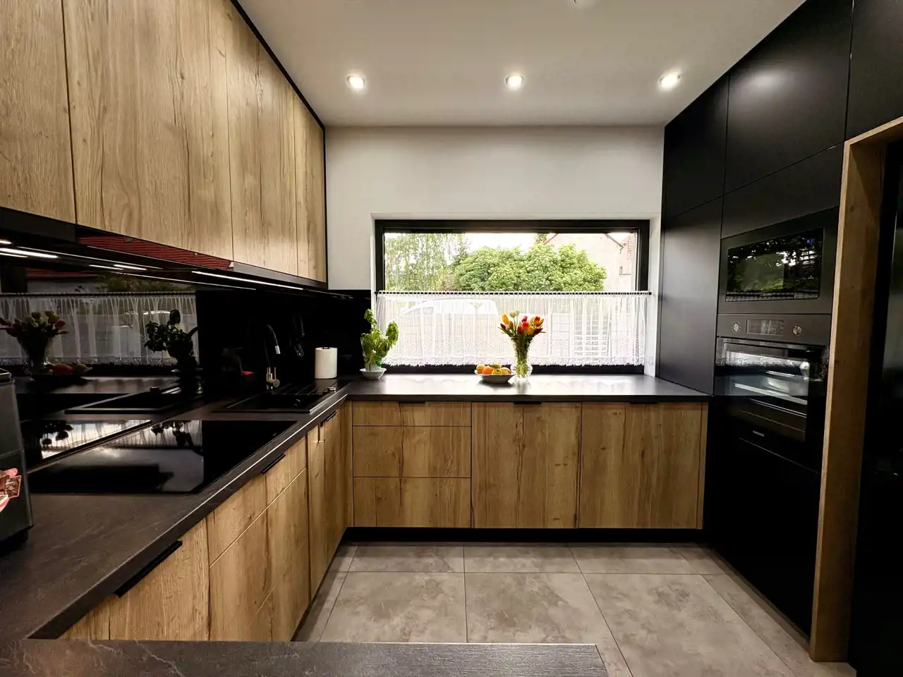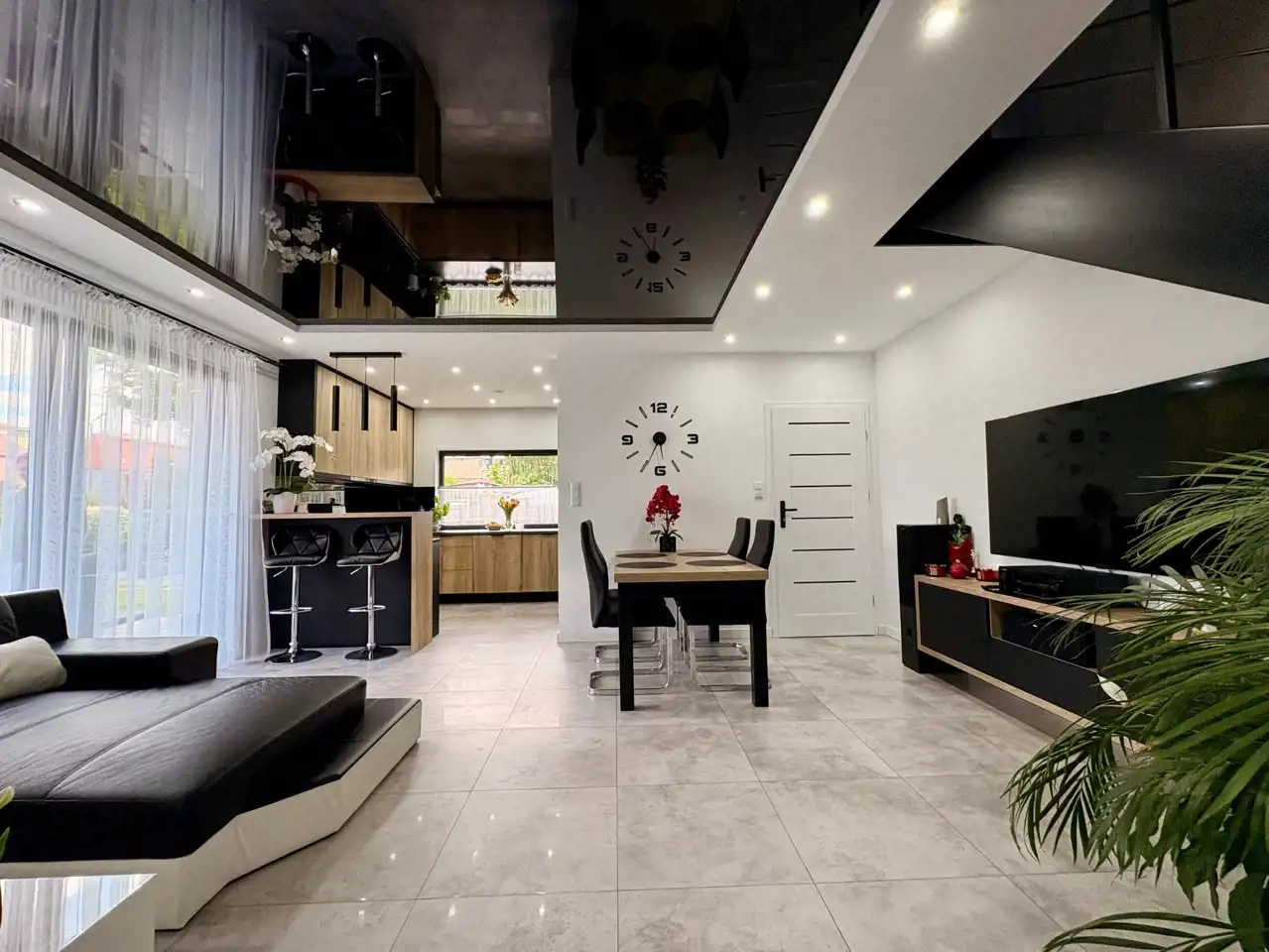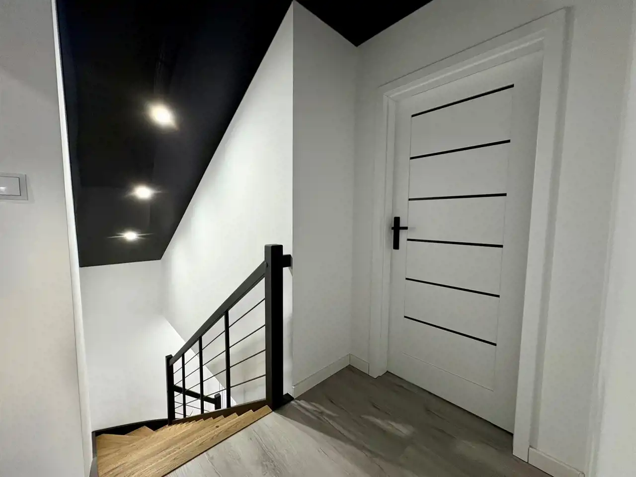 Standard wykończenia: wnętrza domu wykonane z materiałów wysokiej jakości. Znajdziemy tu między innymi napinany sufit w salonie oraz nad schodami i górnym korytarzu. Na parterze na podłogach kafle gresowe, na piętrze panele winylowe. Na ścianach gładzie. Główna sypialnia posiada klimatyzacje. Drzwi wewnętrzne w kolorze białym zestawione z białą listwą przypodłogową. Drzwi wejściowe antywłamaniowe. Schody dębowe olejowane, wykonane na wymiar. Praktyczna kuchnia posiada wszystkie niezbędne sprzęty AGD w zabudowie. Funkcjonalne łazienki wykonane mają również liczne schowki i szafki, wykończone są z dużą dbałością.