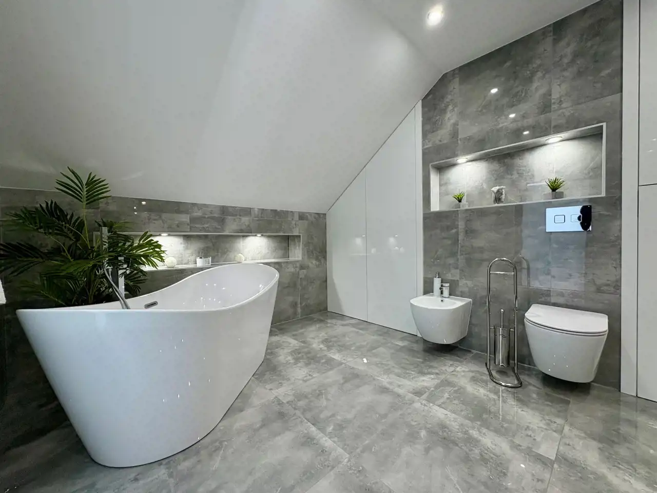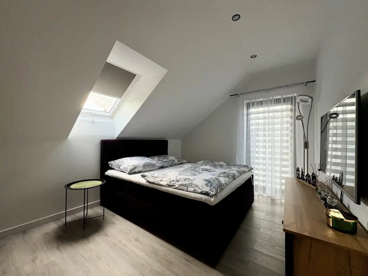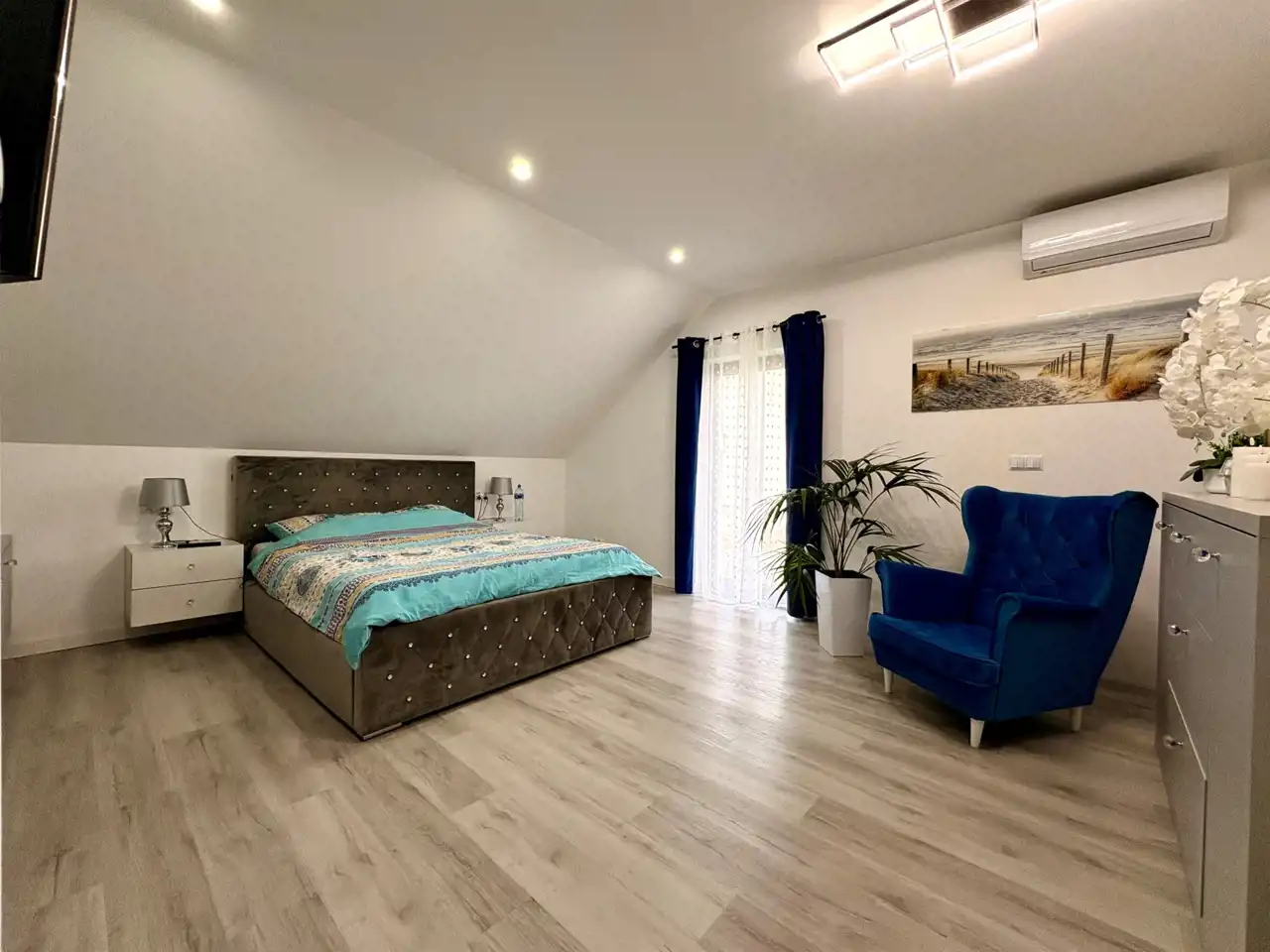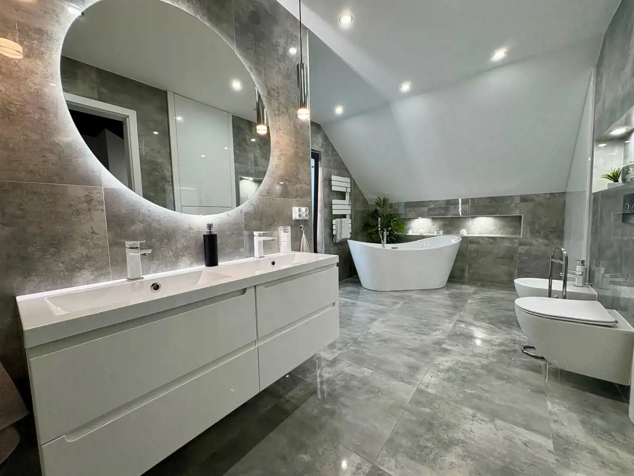 - PIĘTRO: główna łazienka wyposażona między innymi w wolnostojącą wannę oraz natrysk, dwie sypialnie, pokój pełniący aktualnie funkcje garderoby, przedpokój.