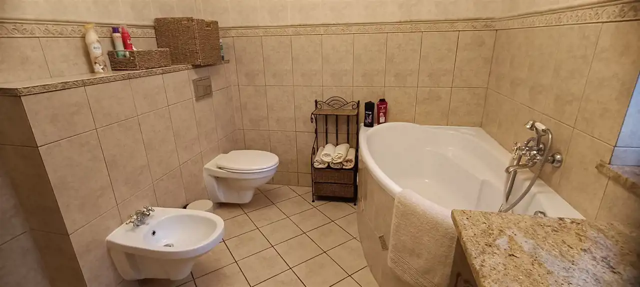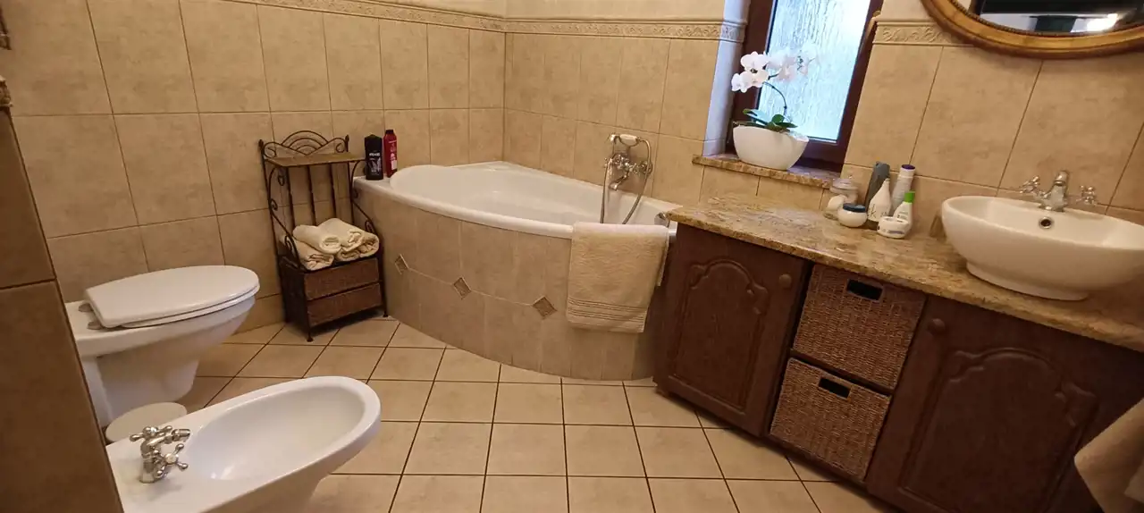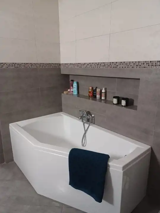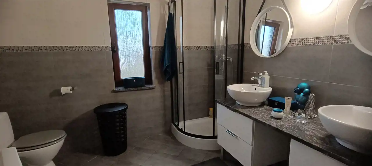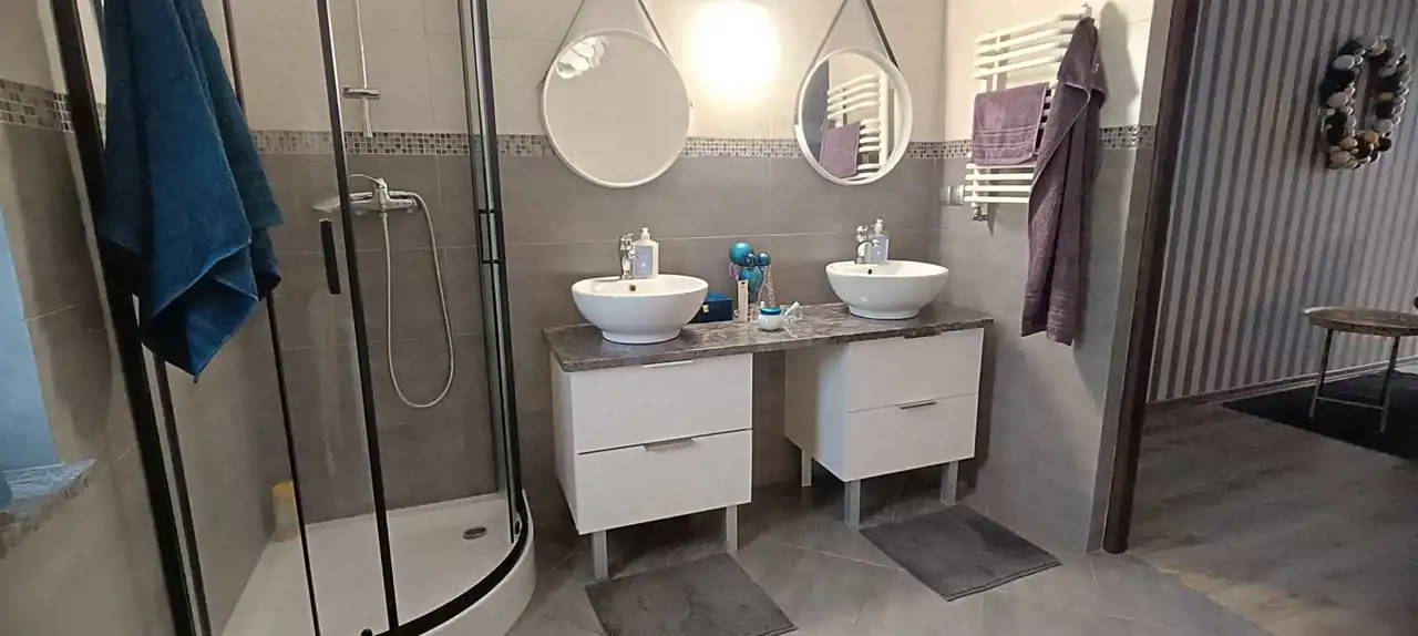 - duża nowoczesna łazienka wyposażona w wannę, kabinę prysznicową, umywalki