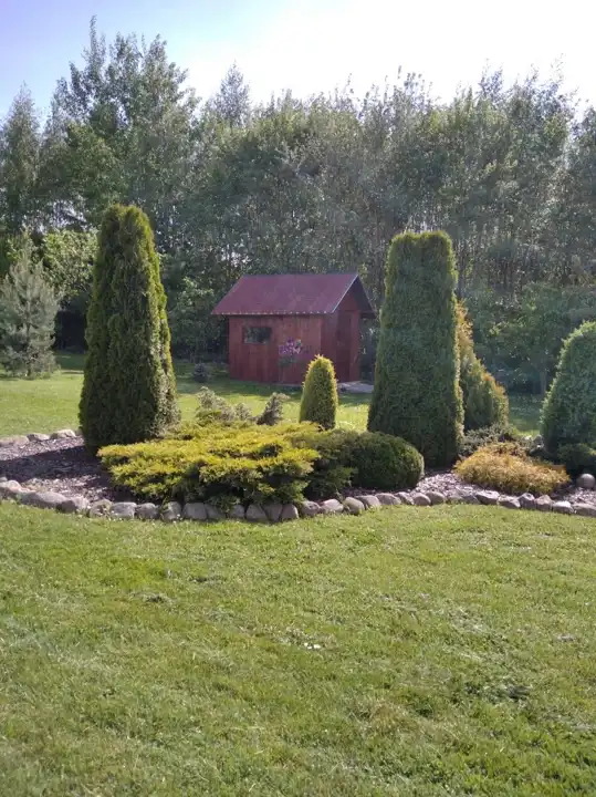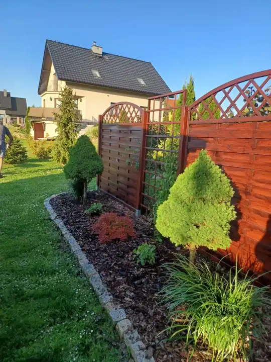 Zagospodarowana działka z licznymi nasadzeniami, altanką i zadaszonym miejscem do przechowywania drewna i domkiem ogrodnika.