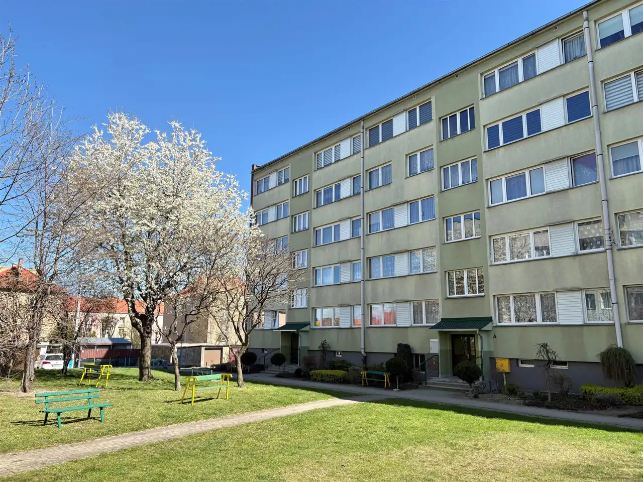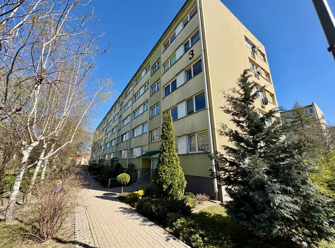 -Zadbany budynek po termomodernizacji z liczną zielenią w najbliższym otoczeniu