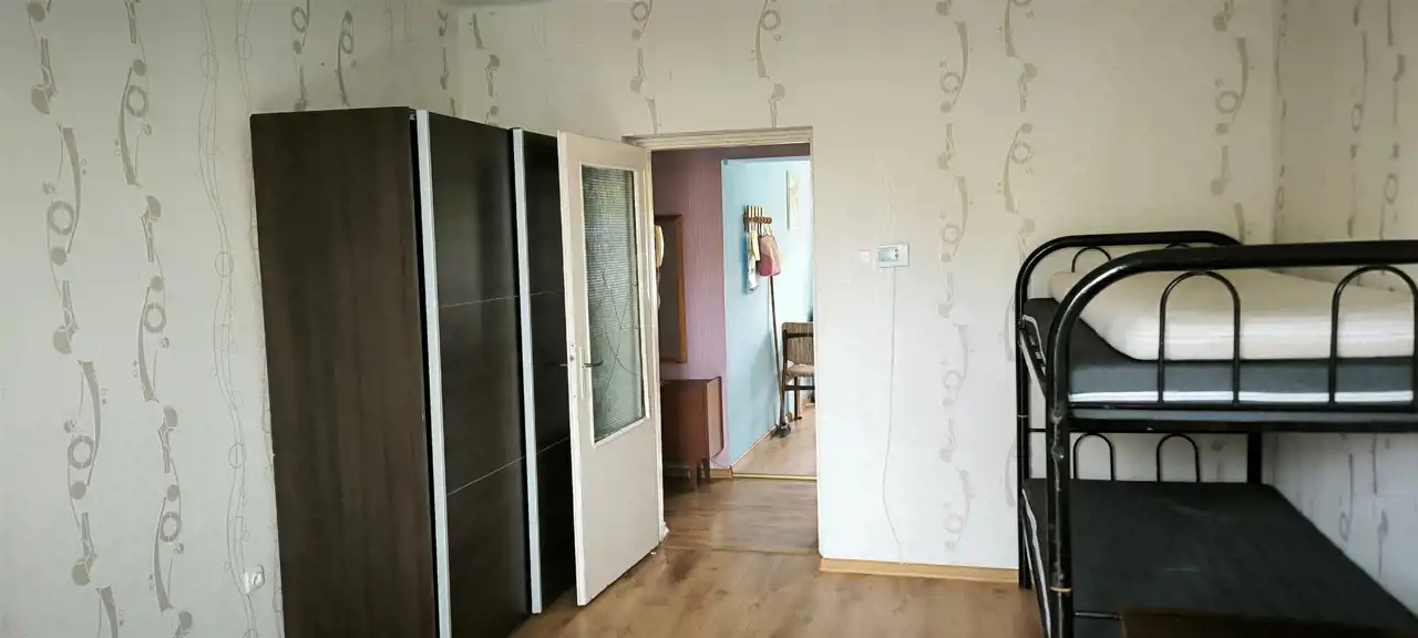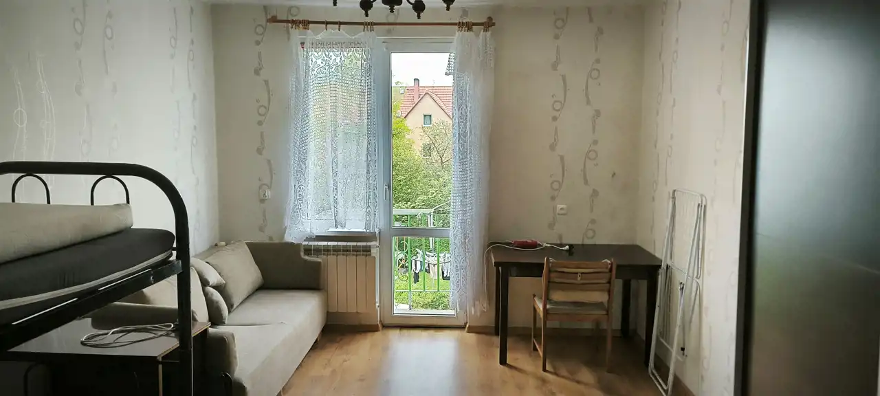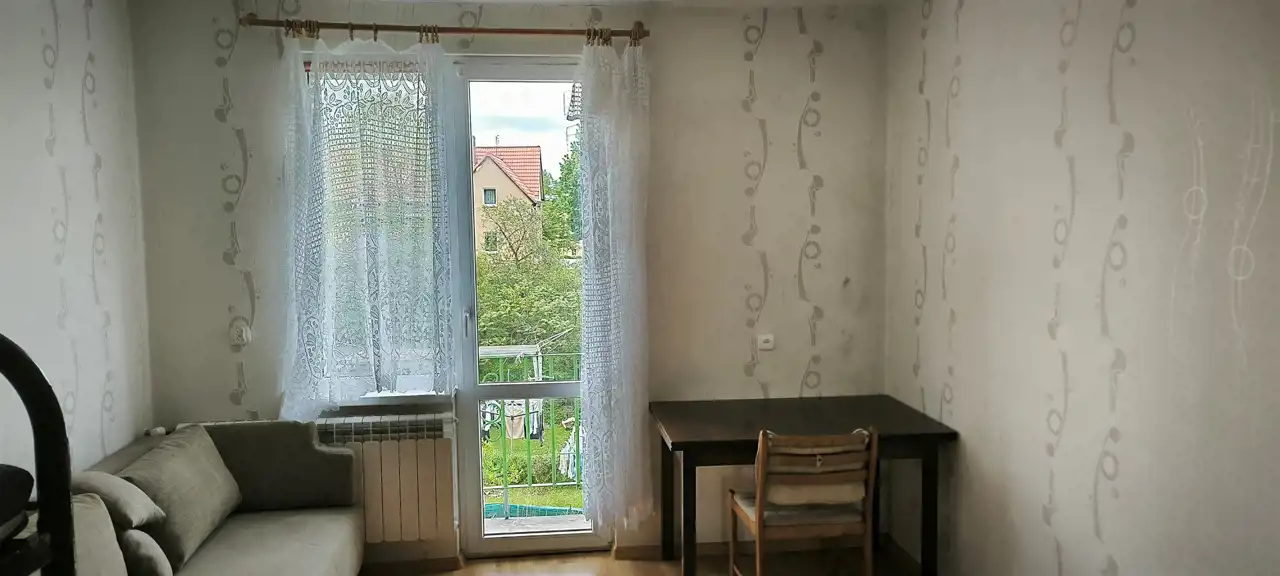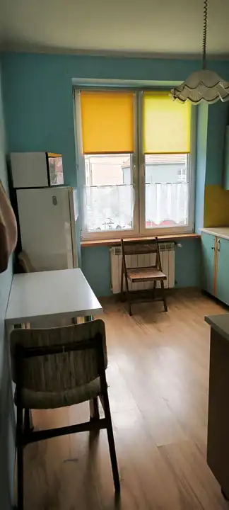 Dwa pokoje, oddzielna kuchnia, łazienka i przedpokój, pełny rozkład pomieszczeń. Do mieszkania przynależy piwnica. Właściciele dzierżawią od gminy ogródek mieszczący się przy budynku. Mieszkanie dwustronne, wystawa okien - pd-wsch, płn-zach.