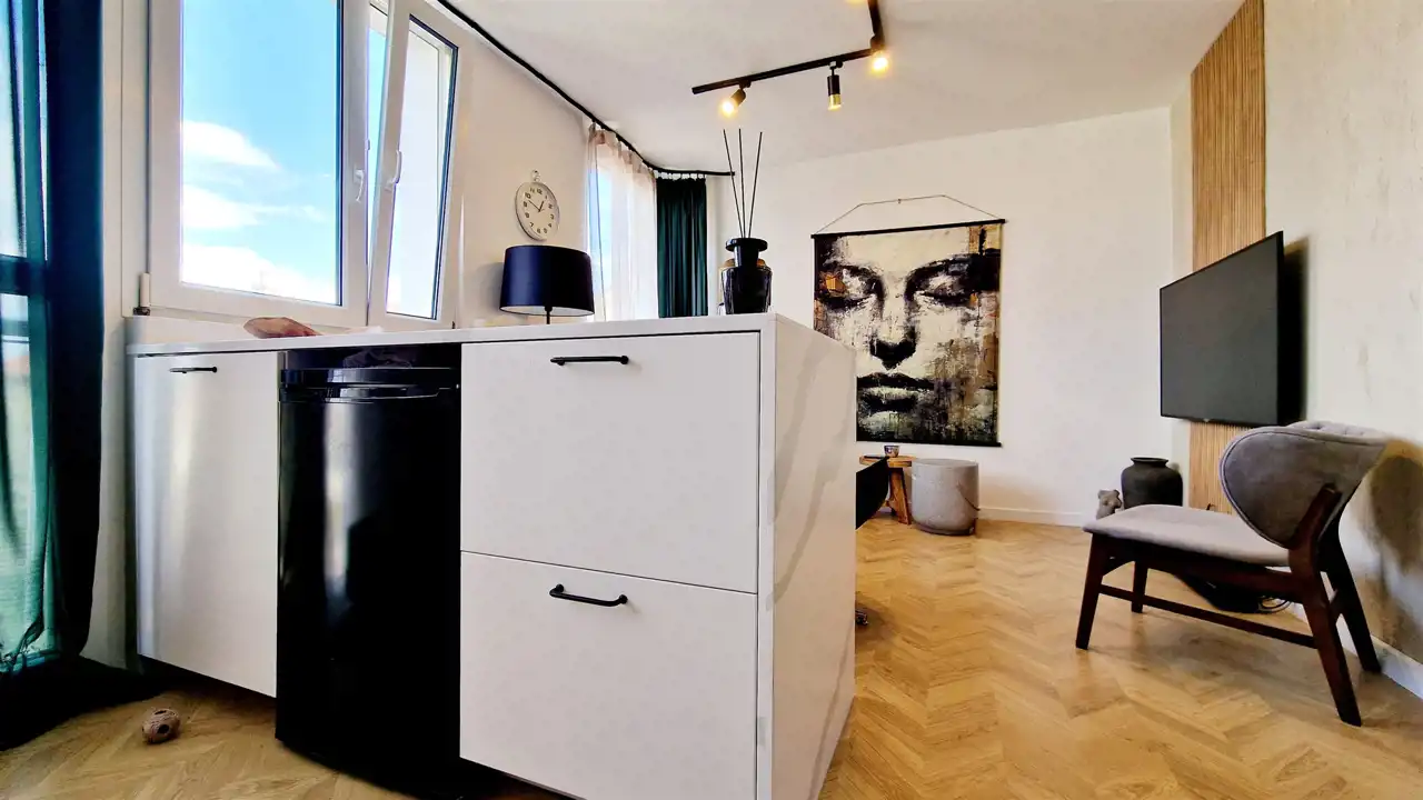 ✅ Przestronny salon z aneksem kuchennym – wyposażony w elegancką, nowoczesną zabudowę kuchenną oraz nowy sprzęt AGD (zmywarka, piekarnik, płyta indukcyjna, okap, lodówka). Centralnym punktem strefy kuchennej jest stylowa wyspa kuchenna z wytrzymałymi blatami z konglomeratu.