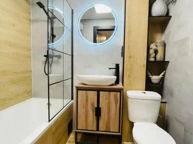 ✅ Nowoczesna łazienka – wyposażona w wannę z deszczownicą oraz elegancki parawan, zapewniające komfort zarówno miłośnikom relaksujących kąpieli, jak i zwolennikom szybkich pryszniców.