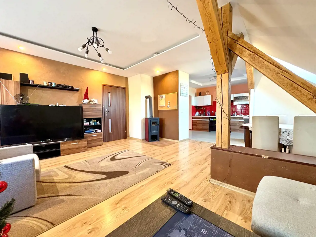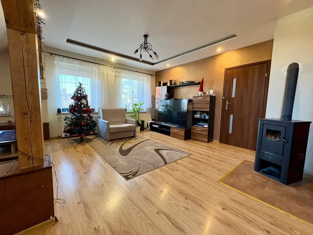 Centralne ogrzewanie oraz ciepła woda z dwufunkcyjnego pieca gazowego. Dodatkowym atutem jest kominek w części dziennej.