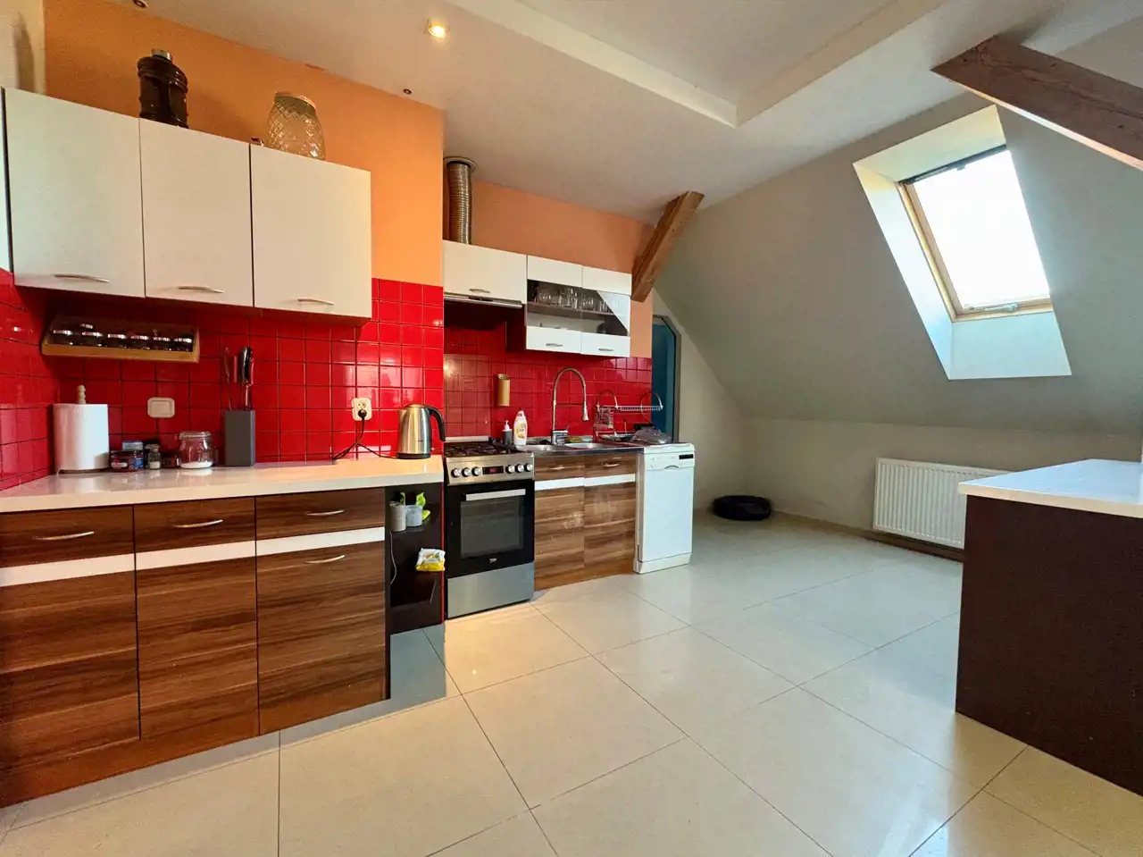 Kuchnia otwarta na salon, wyposażona we wszystkie niezbędne sprzęty.