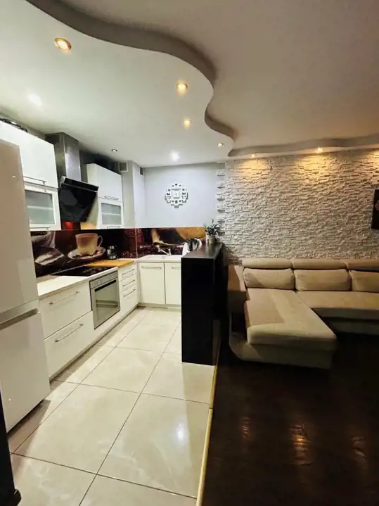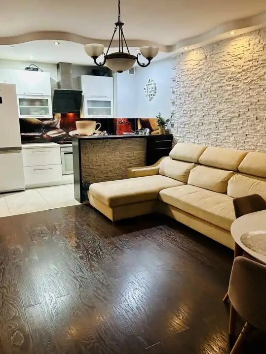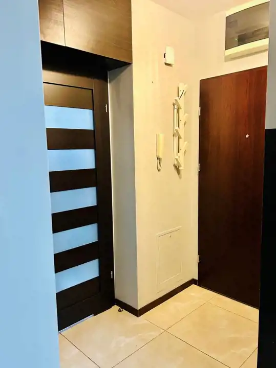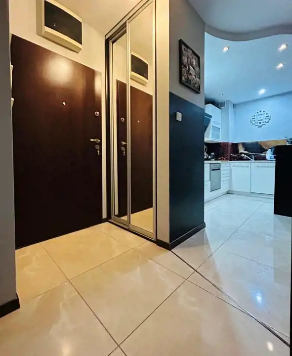 Mieszkanie posiada wyposażoną kuchnię wykonaną na wymiar, z niezbędnymi sprzętami AGD w zabudowie. Przestronna łazienka z wanną oraz miejscem na pralkę. W przedpokoju – szafa na wymiar z lustrem. W salonie znajduje się narożny wypoczynek, stół z krzesłami oraz zabudowa mebli pod TV. Całości dopełnia podwieszany fotel oraz podświetlona ściana wykończona kamieniem dekoracyjnym. W sypialni – szafa w zabudowie, rozkładane łóżko, biurko i regały. Na podłogach – panele, w kuchni i przedpokoju – kafle