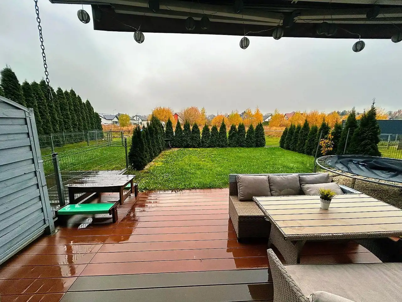 Wyjście na ogród zarówno z salonu, jak i z sypialni. Taras wykończony deską.