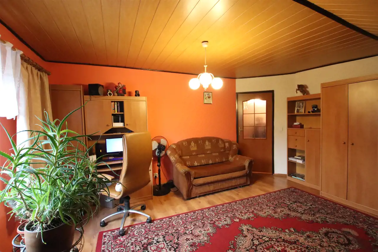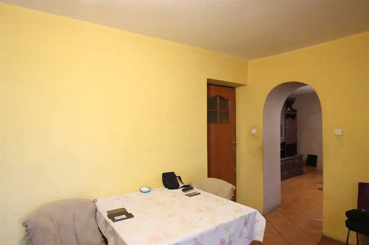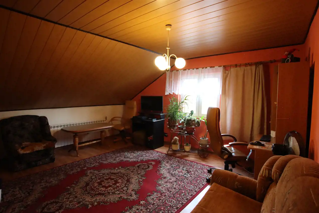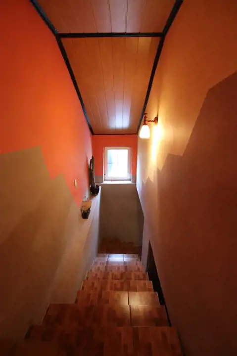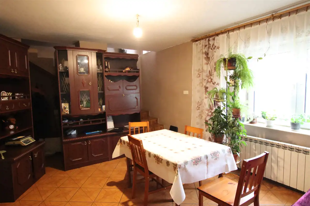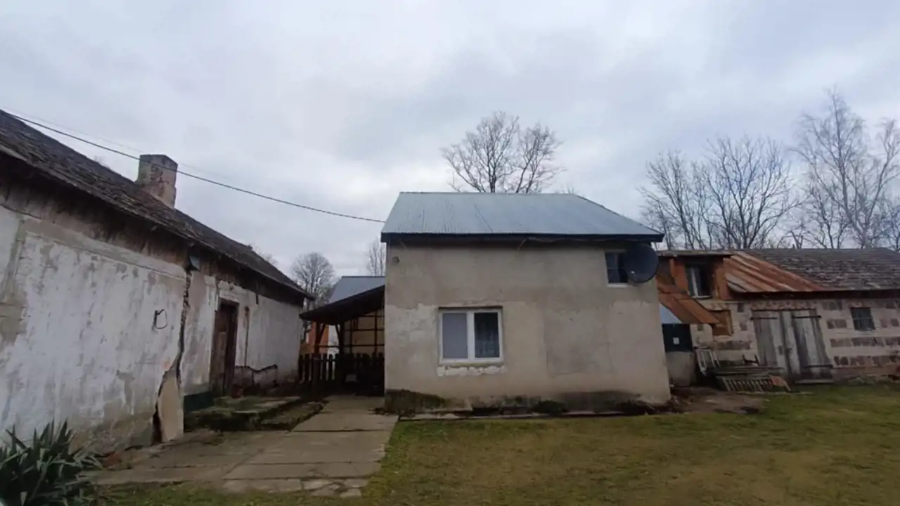 Na całość nieruchomości składa się: parter - jadalnia, gdzie znajduję się główne wejście do domu, kuchnia, łazienka, pokój oraz wejście do kotłowni. W kotłowni znajduję się piec, z którego rozprowadzone zostało centralne ogrzewanie (możliwość palenia zarówno węglem jak i drzewem). Na piętrze znajdują się kolejne pokoje oraz niewykończona łazienka. Dodatkowo na piętrze znajdują się schody prowadzące na strych. Okna PCV, wszystkie instalacje sprawne, centralne ogrzewanie, szambo (brak kanalizacji w drodze). Całość nieogrodzona. Dom wymaga odświeżenia/remontu.