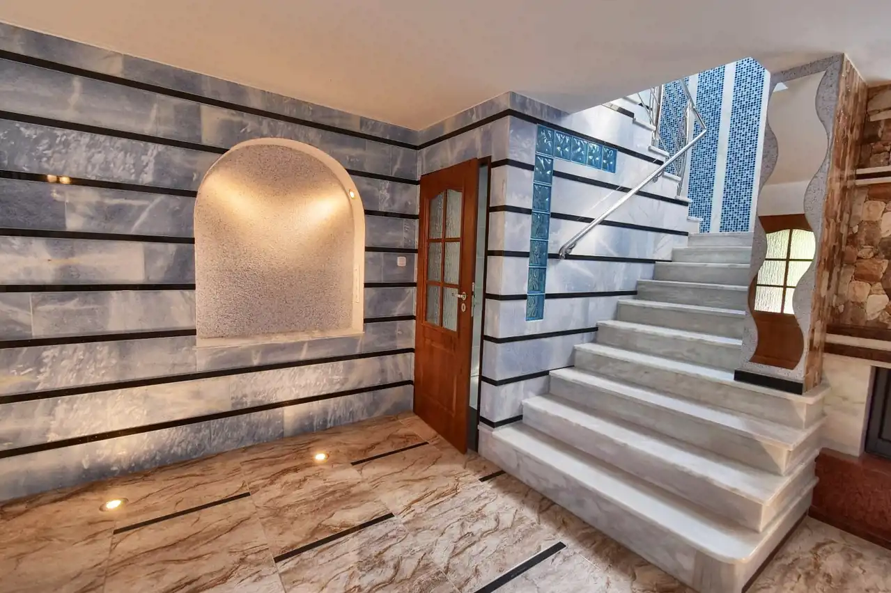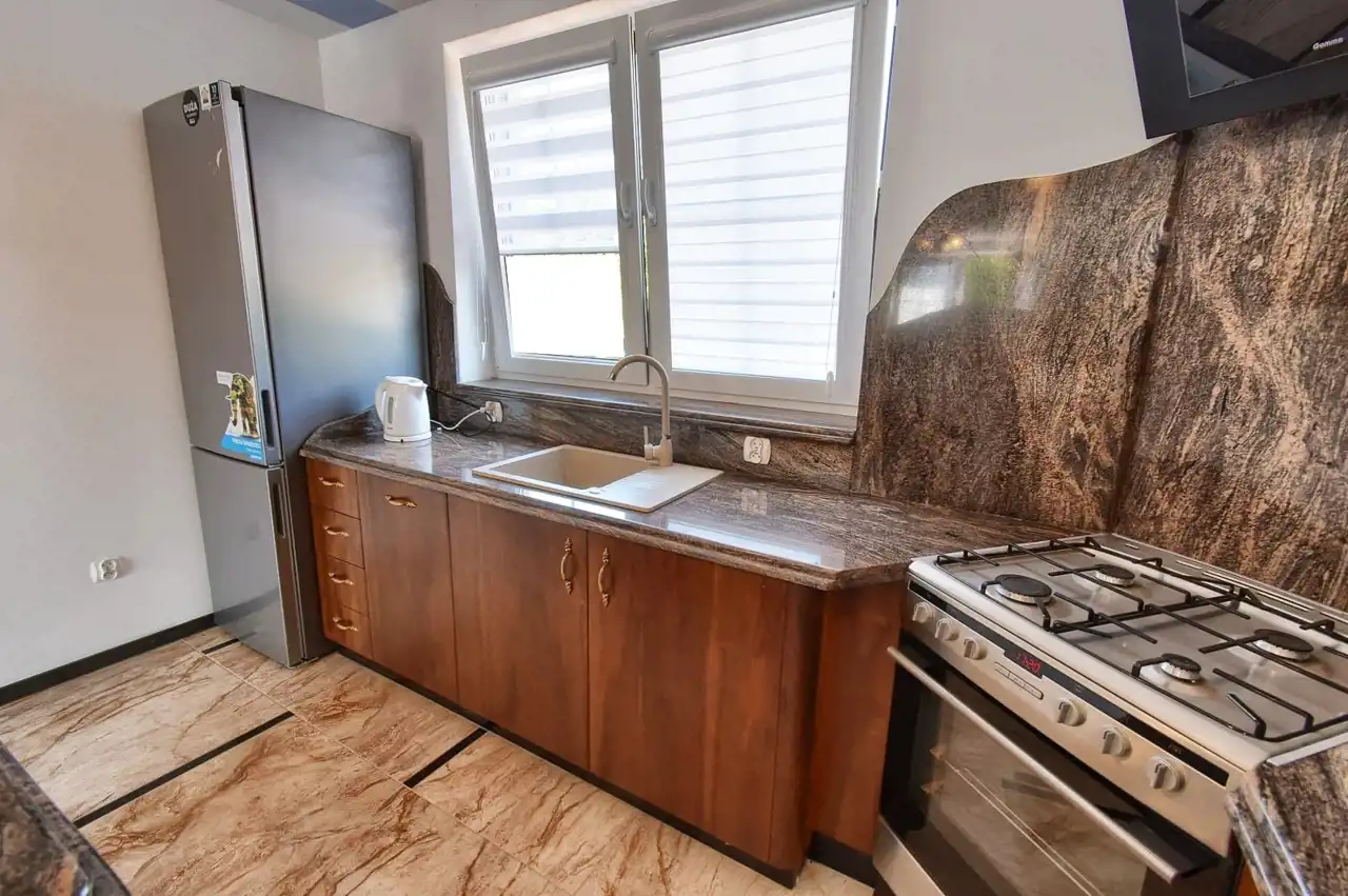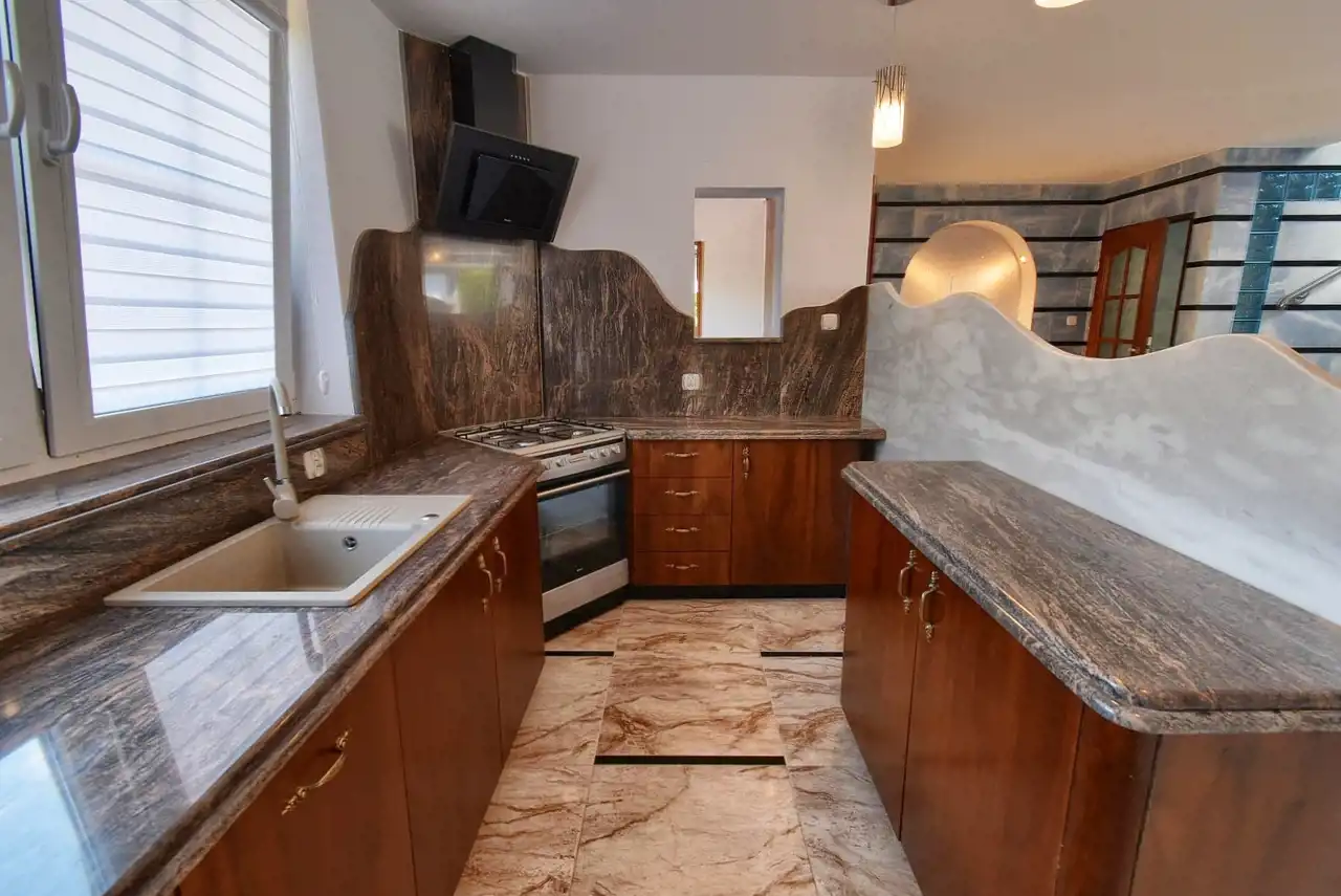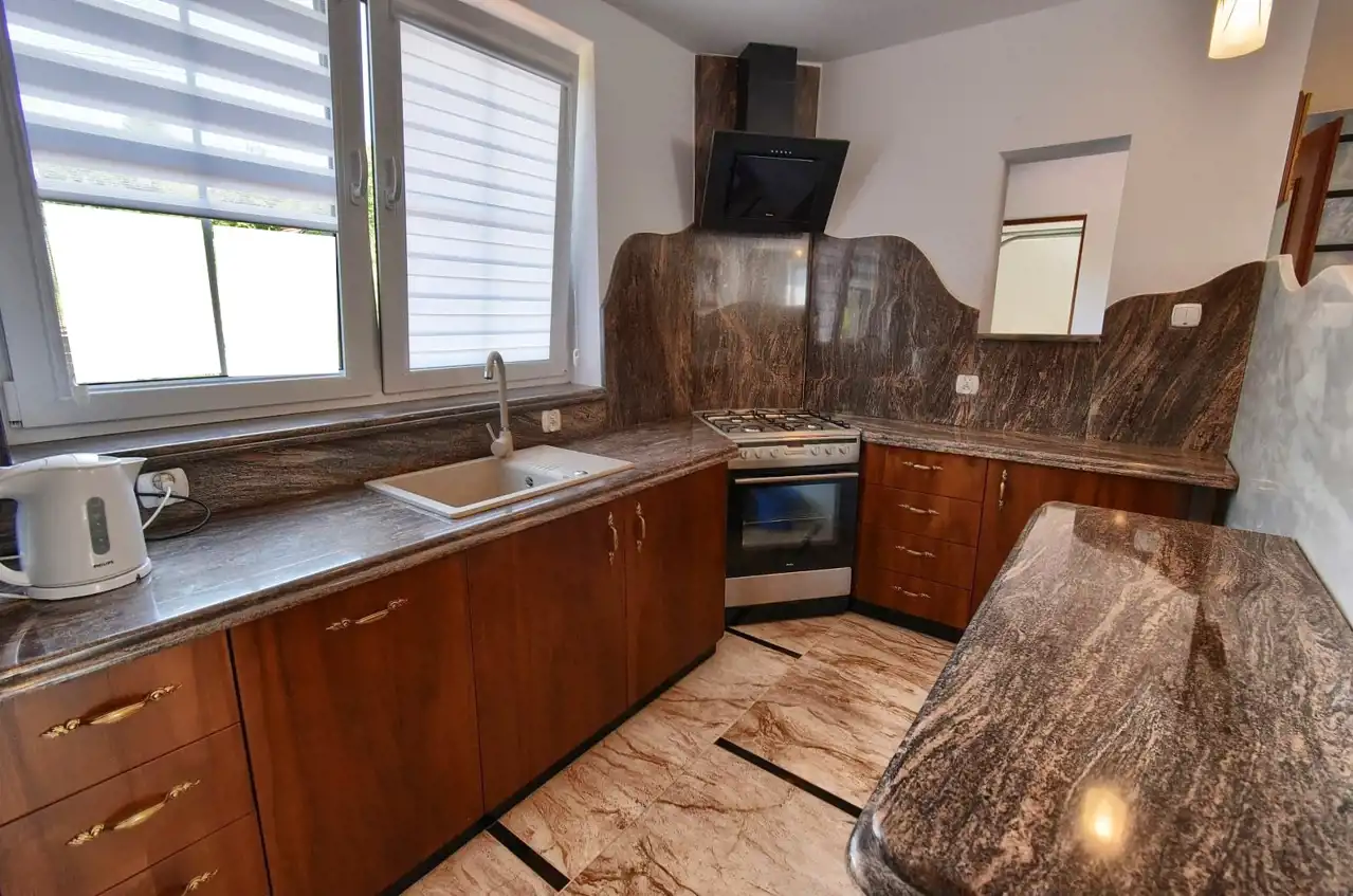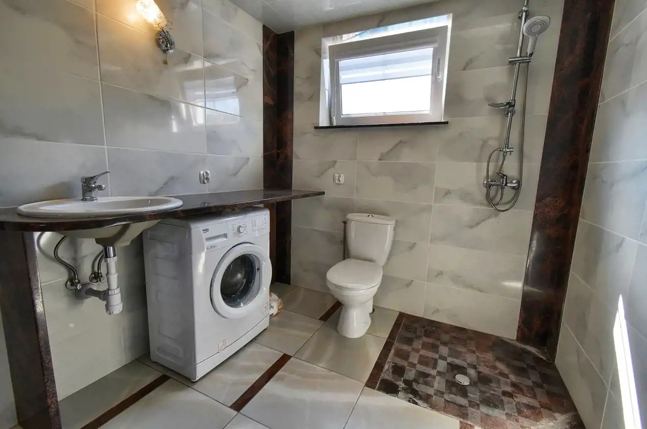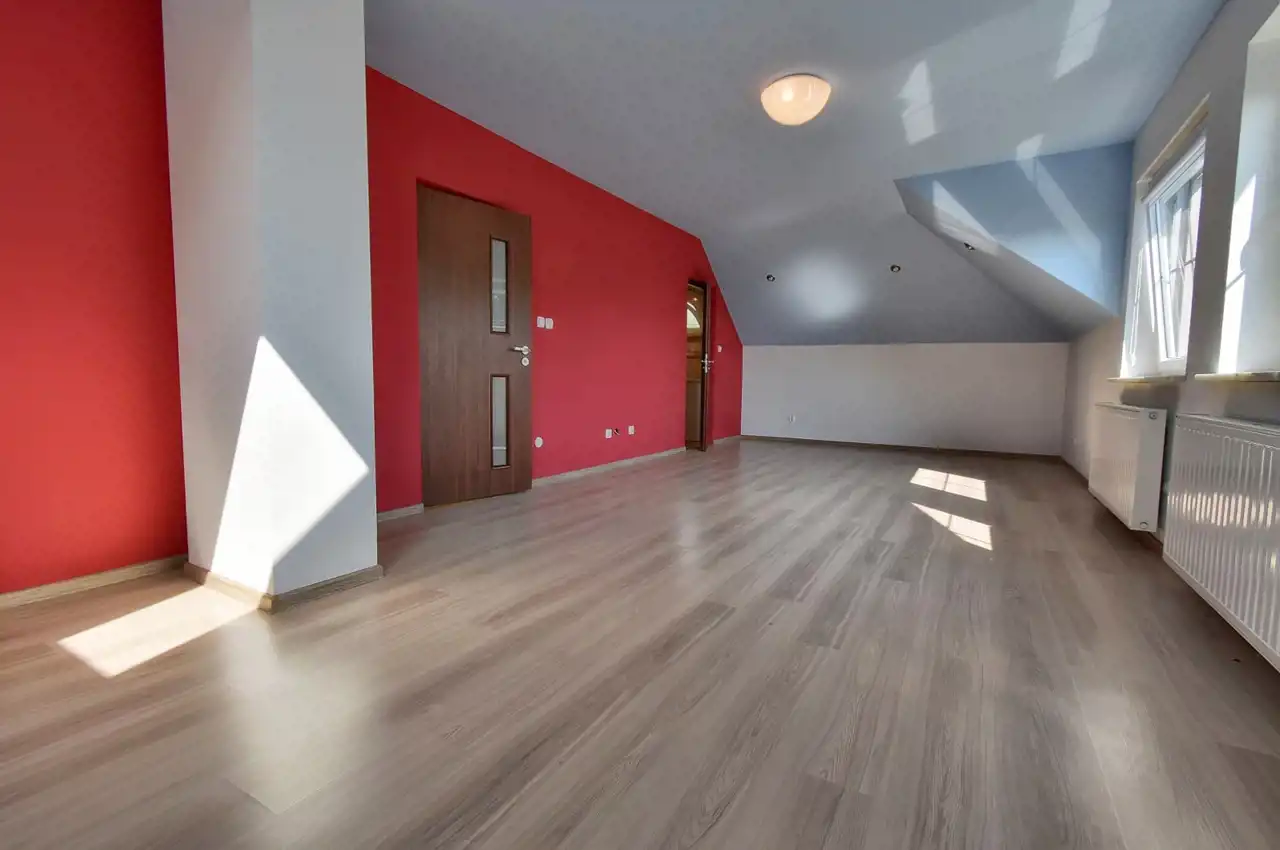 The rectangular-shaped plot measures about 20 x 30 m. Front width is 20 m. The plot is fenced and landscaped. There is also a well with drinking water at a depth of approximately 10 meters on the plot. The house is constructed with red MAX bricks, insulated with approximately 12 cm of styrofoam. The building includes a single-car garage. The roof is covered with metal roof tiles and insulated with wool and styrofoam. PVC windows are installed. The heating is provided by a fireplace, but there are also provisions for a heat pump and a solid fuel stove. Underfloor heating is installed on the entire ground floor, while radiators are installed upstairs.