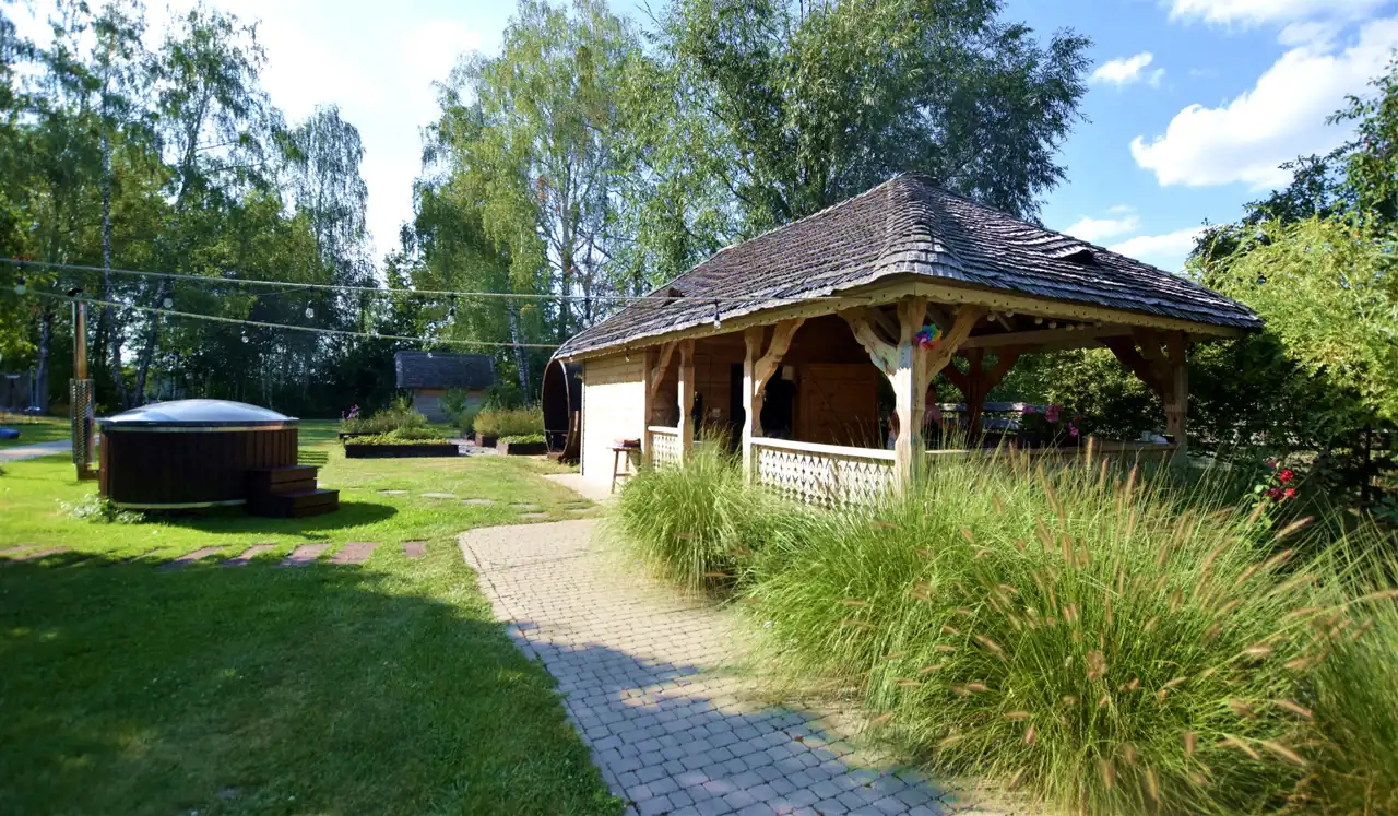 Na terenie ogrodu znajduję się sauna, duży basen, bania, prysznic ogrodowy. Wydzielone są również dodatkowe miejsca wypoczynkowe - leżaki, stolik kawowy, hamak w lasku.