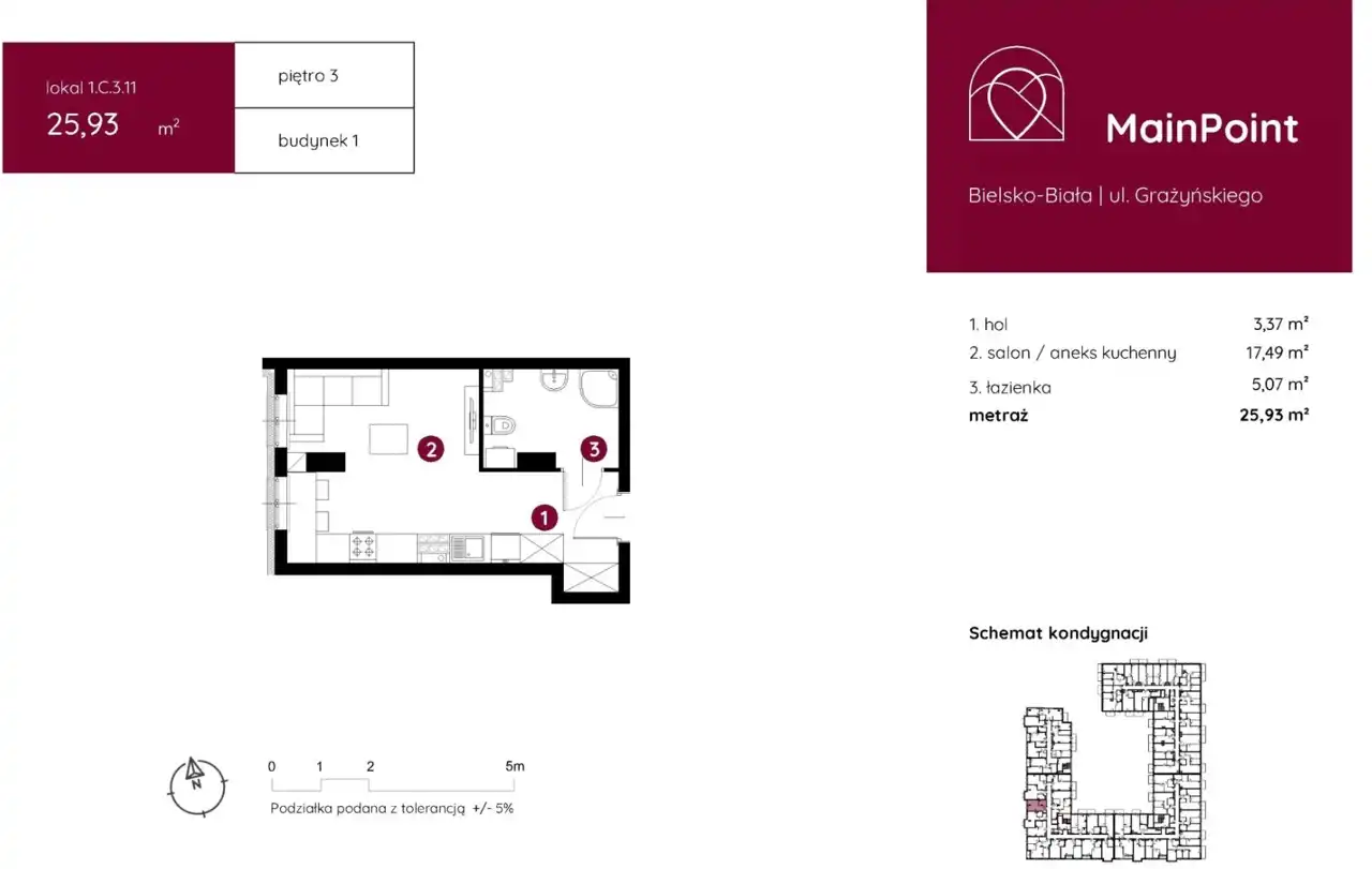 MainPoint to nowoczesna inwestycja powstająca w samym sercu Bielska-Białej – przy ul. Grażyńskiego. To lokalizacja, która łączy miejski styl życia, wygodę codziennego funkcjonowania oraz doskonałą komunikację. W zasięgu krótkiego spaceru znajdują się sklepy, restauracje, punkty usługowe, urzędy, uczelnie, tereny rekreacyjne oraz przystanki komunikacji miejskiej. To idealne miejsce zarówno do zamieszkania, jak i pod inwestycję pod wynajem.