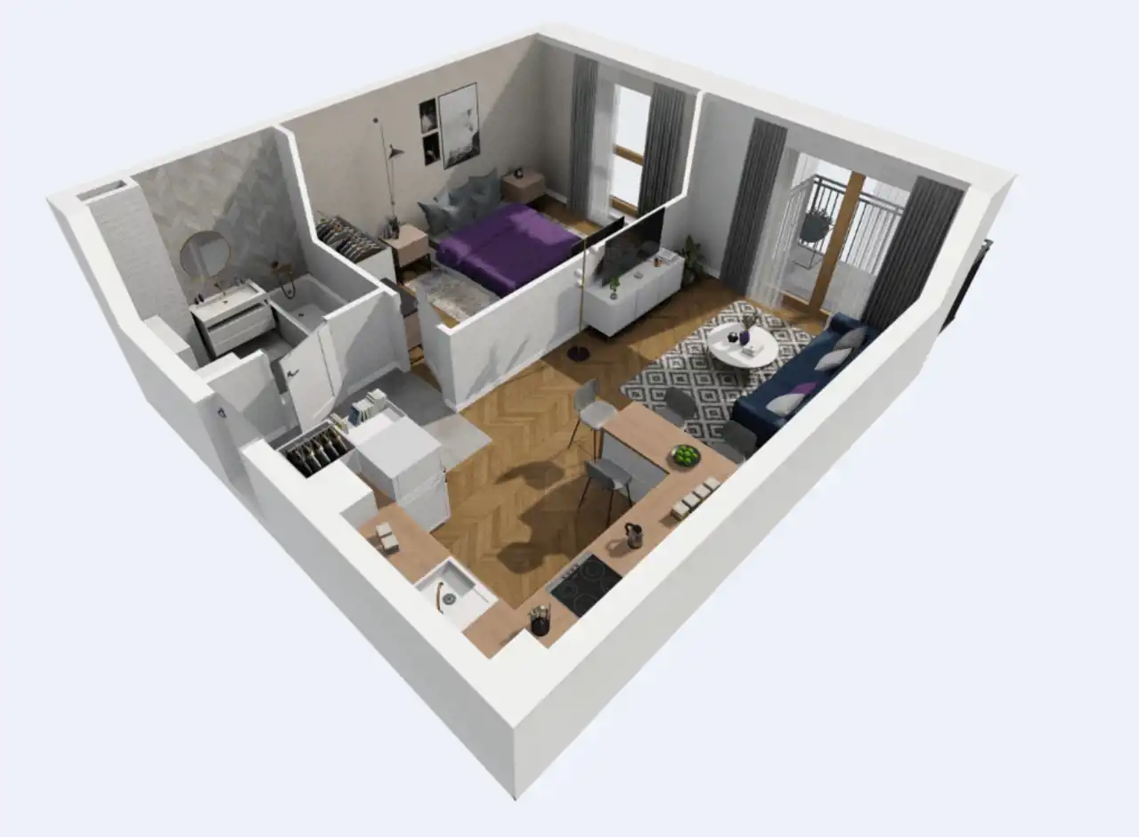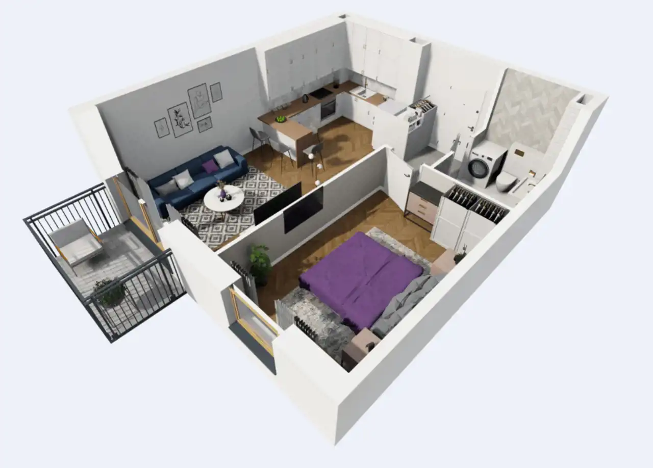 Salon z aneksem (20,72 m²): To serce domu. Przestrzeń jest tak ustawna, że swobodnie zmieścisz tu wygodną kanapę, stół jadalniany i w pełni funkcjonalną kuchnię. A co najważniejsze – stąd wychodzisz bezpośrednio na balkon. Idealne przedłużenie salonu w ciepłe dni.