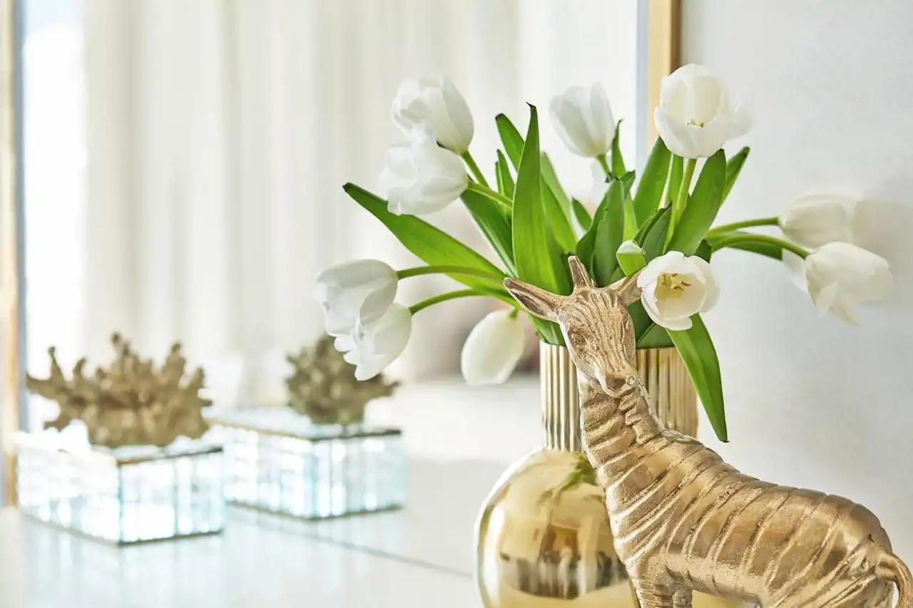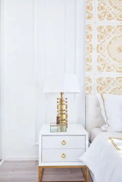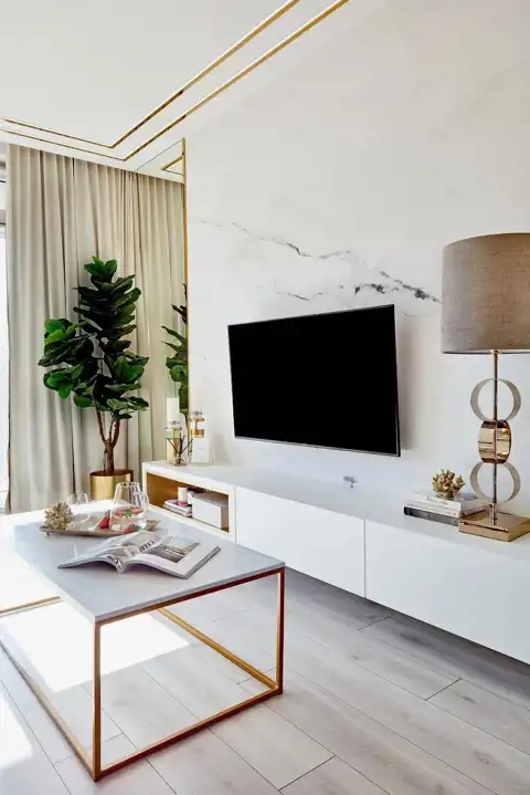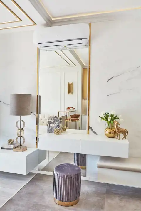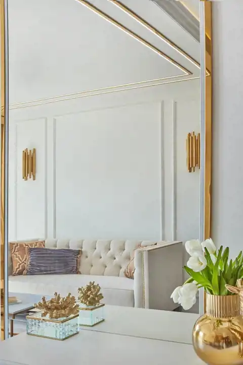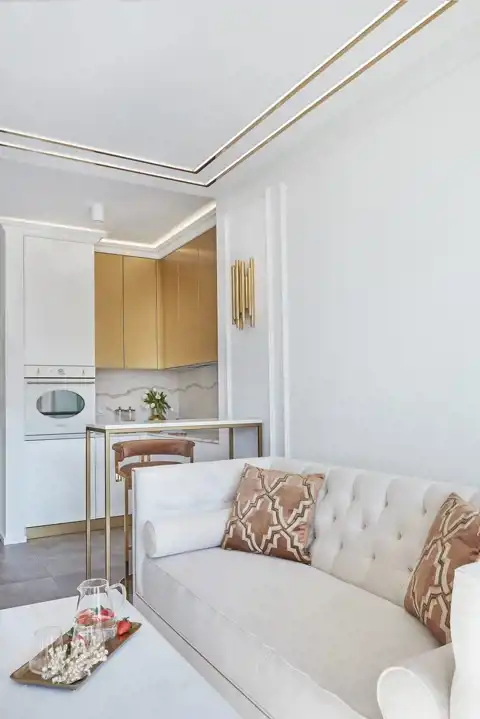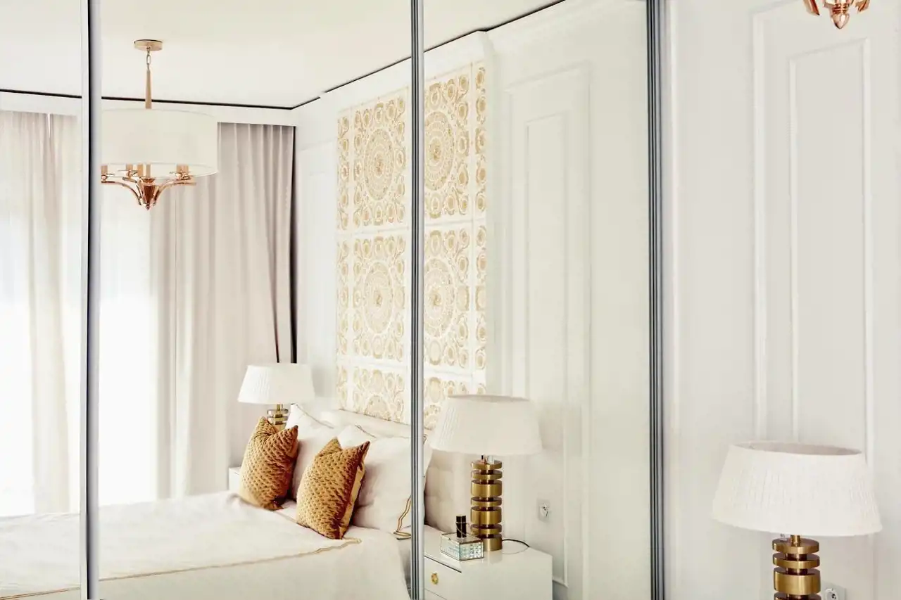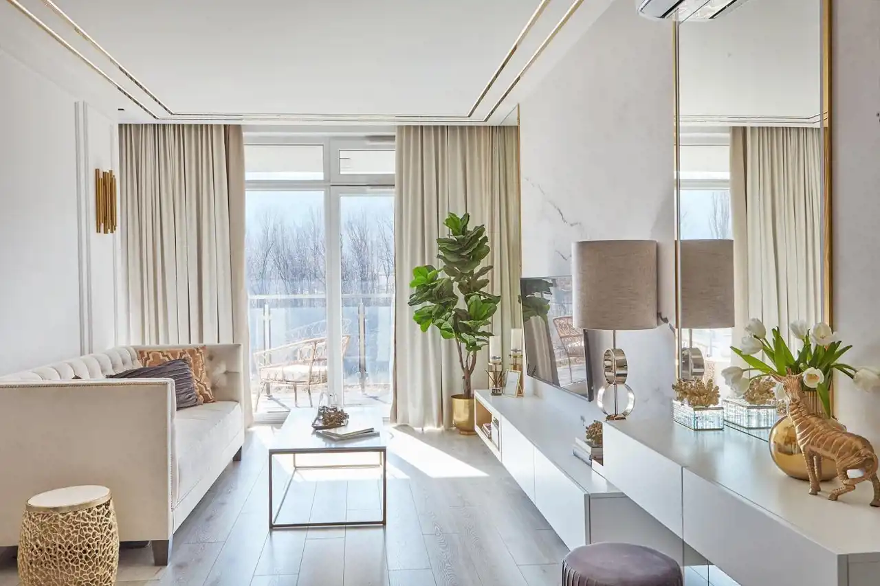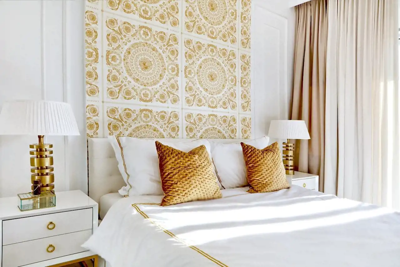 Przestronnego salonu z ekskluzywną sofą, zasłonami premium oraz najwyższej jakości oświetleniem LEDowym sufitowym. Na ścianach znajdują się lustra na wymiar, które optycznie powiększają przestrzeń oraz tapeta z kolekcji Versace z Milano, dodająca prestiżu i unikalnego charakteru.
