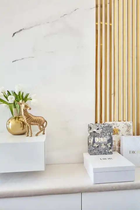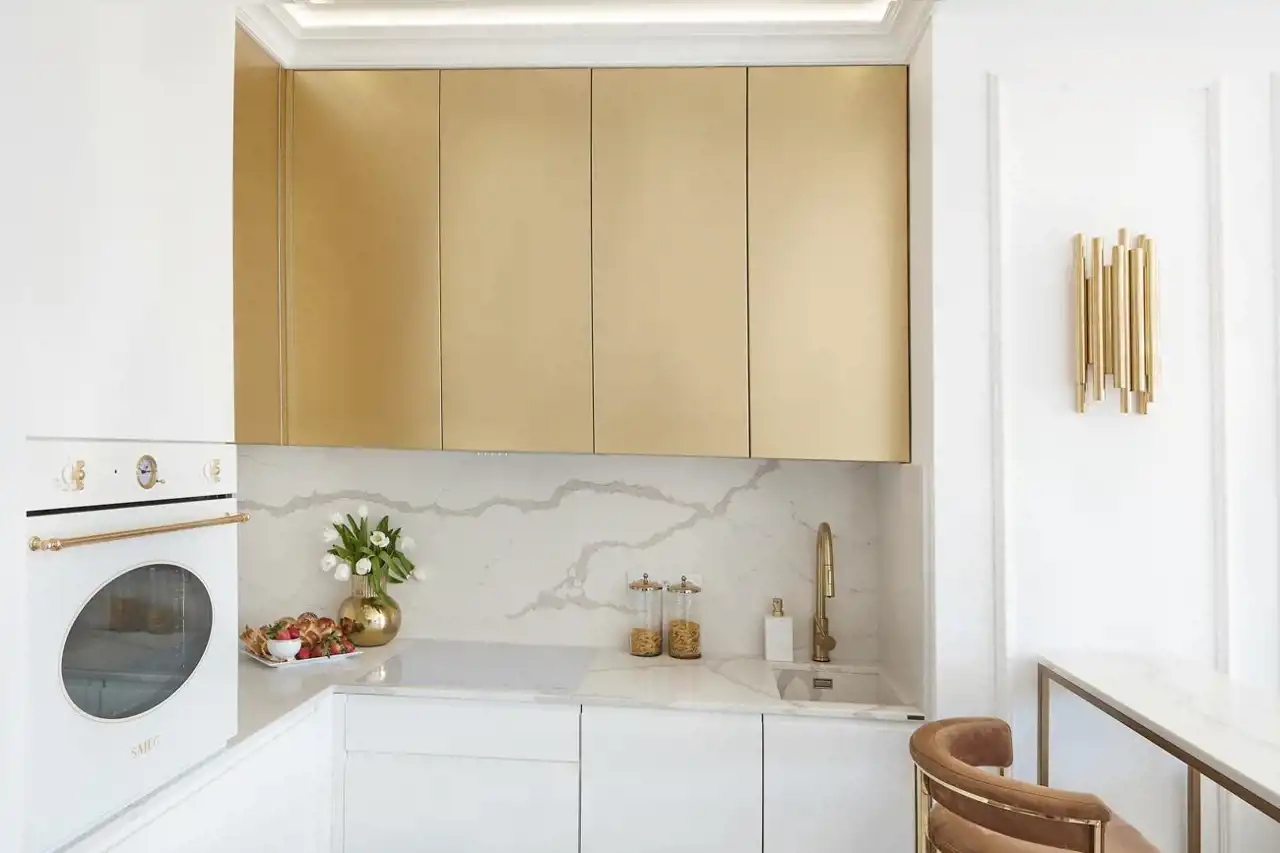 W pełni wyposażonej kuchni na wymiar z najwyższej klasy sprzętem AGD, w tym pozłacanym piekarnikiem SMEG, płytą indukcyjną oraz kuchenką. Blat kuchenny wykonany z ekskluzywnego glomeratu sprowadzanego na zamówienie z Włoch, stworzonego z wulkanicznej skały magmowej, gwarantującego unikalny wygląd i wyjątkową trwałość.
