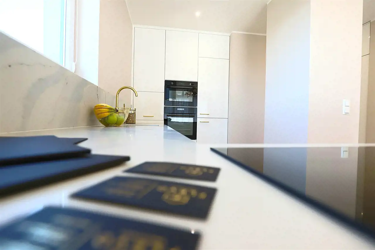 Nowoczesna kuchnia na wymiar z blatem wykonanym z konglomeratu kwarcowego, w pełni wyposażona w sprzęt AGD: piekarnik, kuchenkę, płytę indukcyjną, okap wyspowy oraz lodówkę.