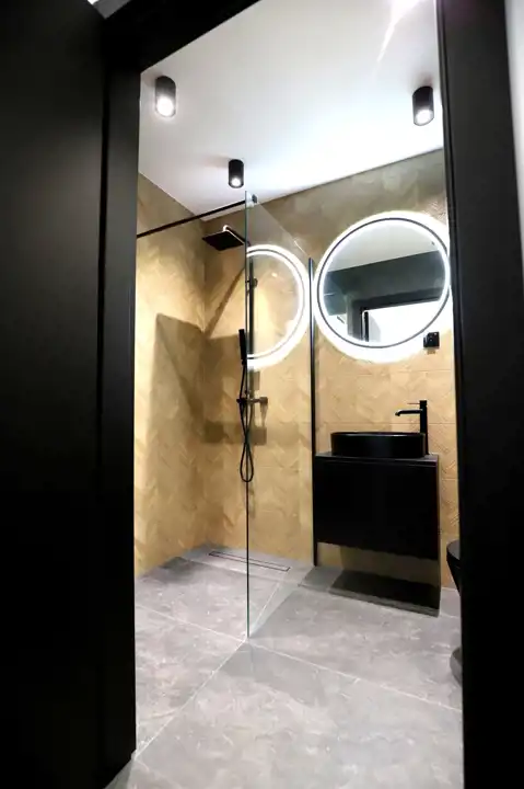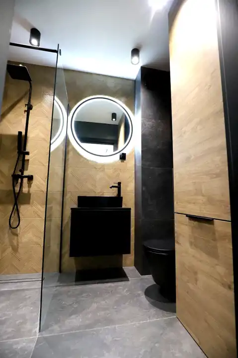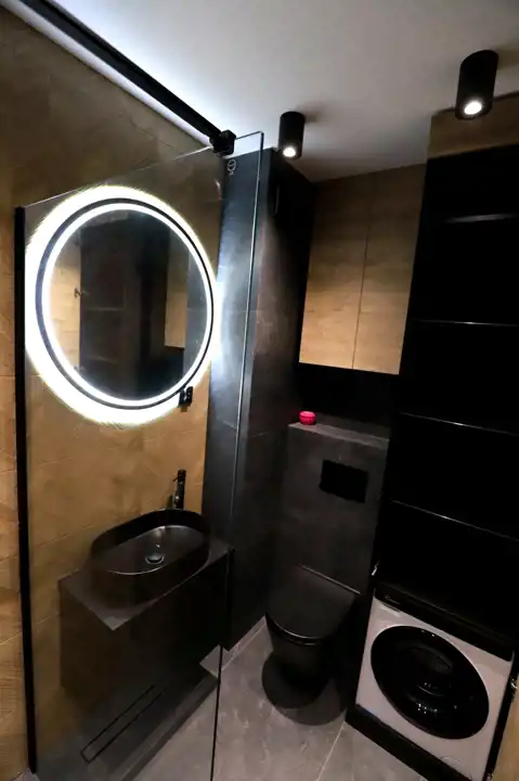 funkcjonalna łazienka z pralką oraz szafkami