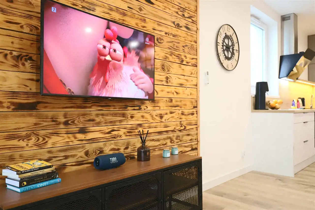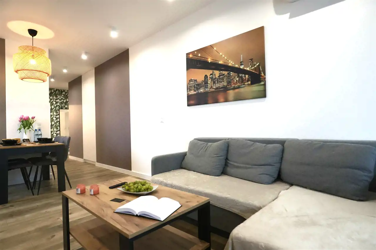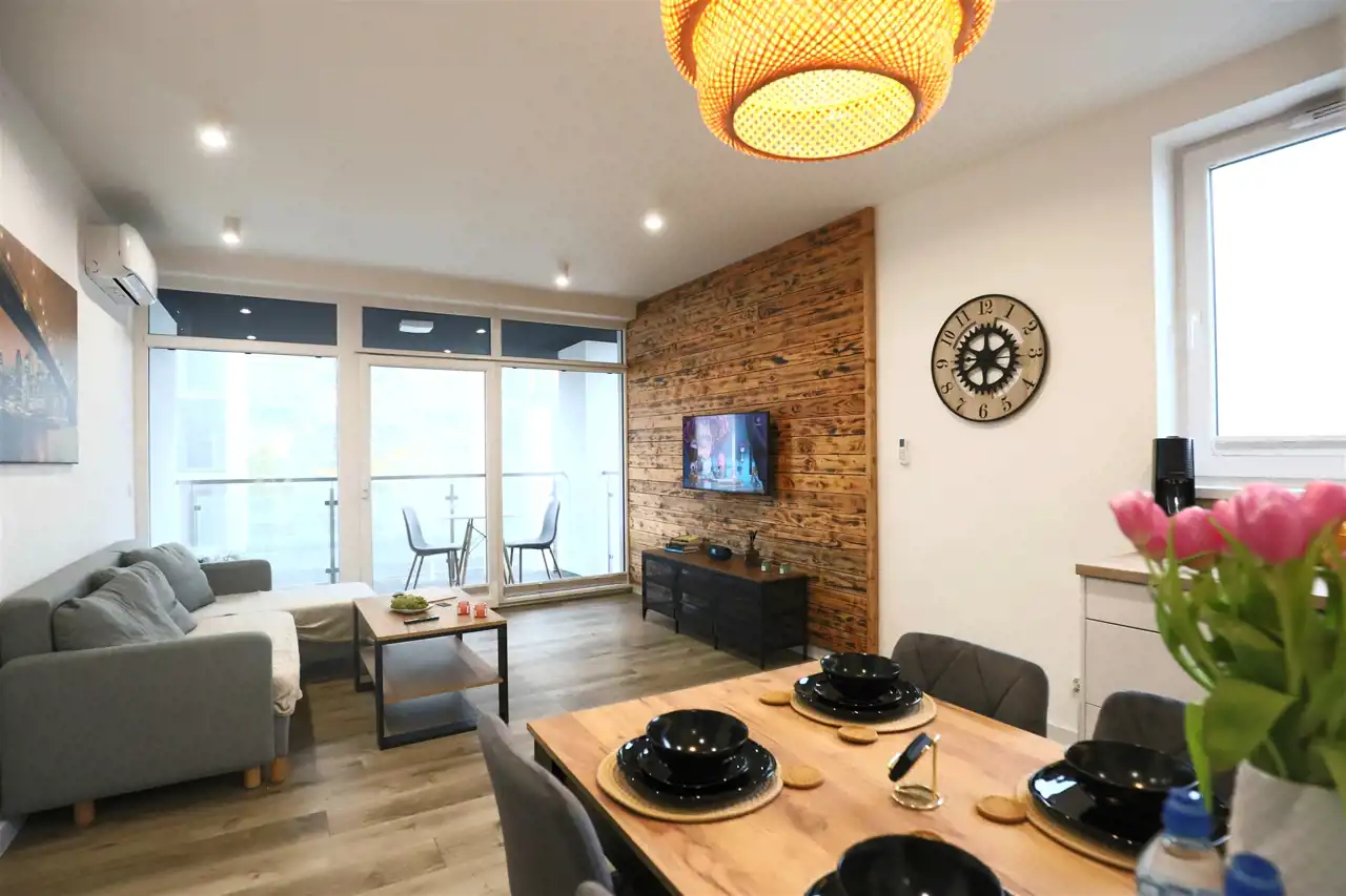 - Salon z aneksem kuchennym – przestronny, jasny salon z bezpośrednim wyjściem na balkon, połączony z w pełni wyposażonym aneksem kuchennym (lodówka, piekarnik, płyta indukcyjna, mikrofala, czajnik, zmywarka).