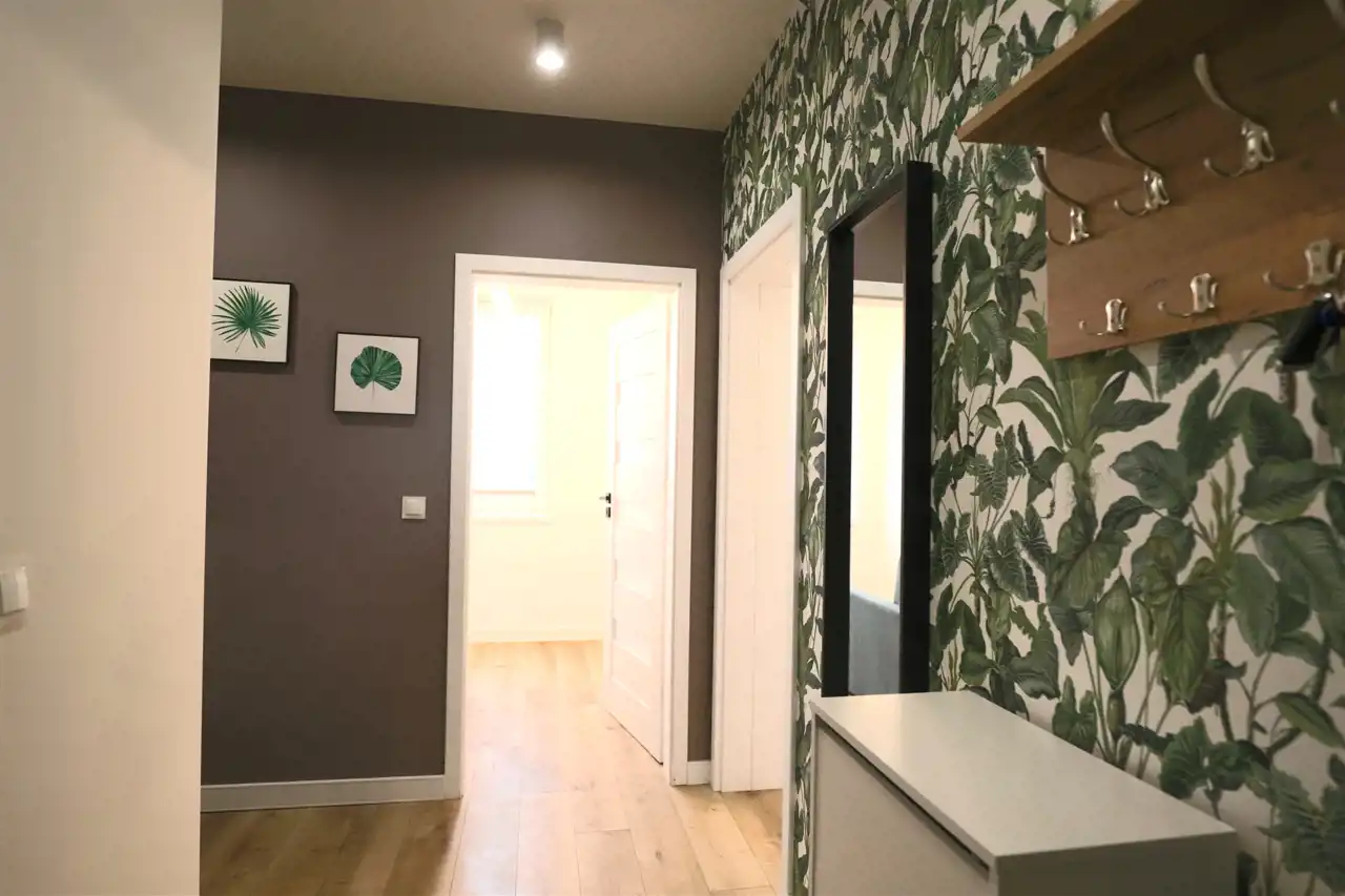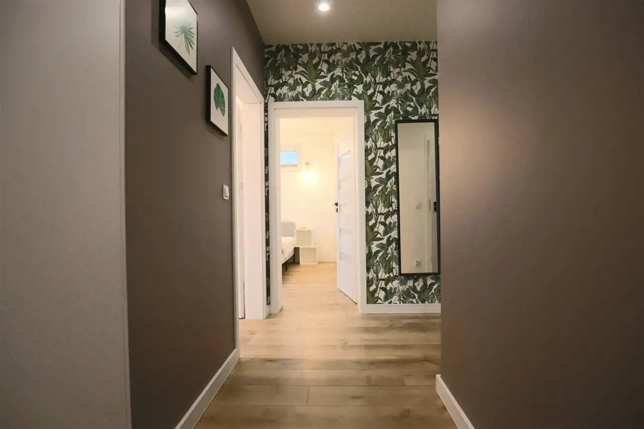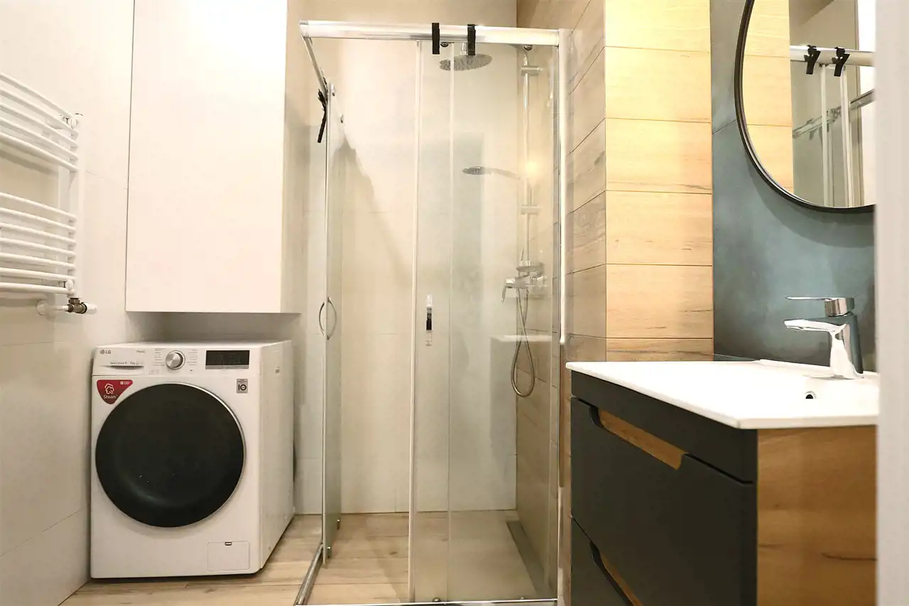 - Łazienka – nowoczesna, z prysznicem, pralką oraz eleganckimi wykończeniami.