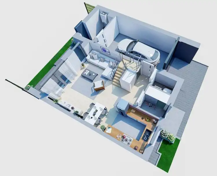Strefa dzienna na parterze to serce domu – znajduje się tu funkcjonalna kuchnia, WC oraz przestronny salon. Dzięki dużym przeszkleniom przestrzeń ta jest doskonale doświetlona i płynnie łączy się z tarasem wykończonym deską oraz ogrodem.