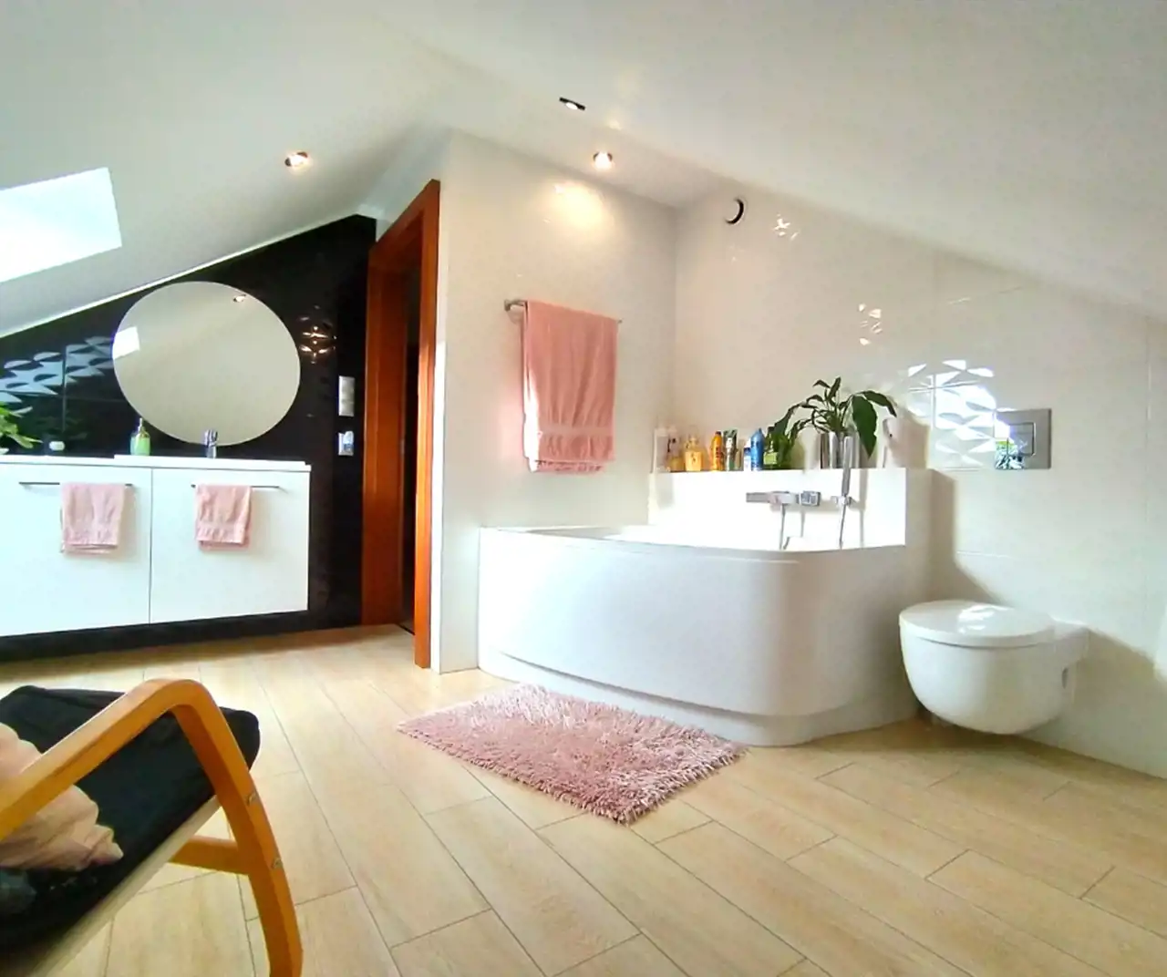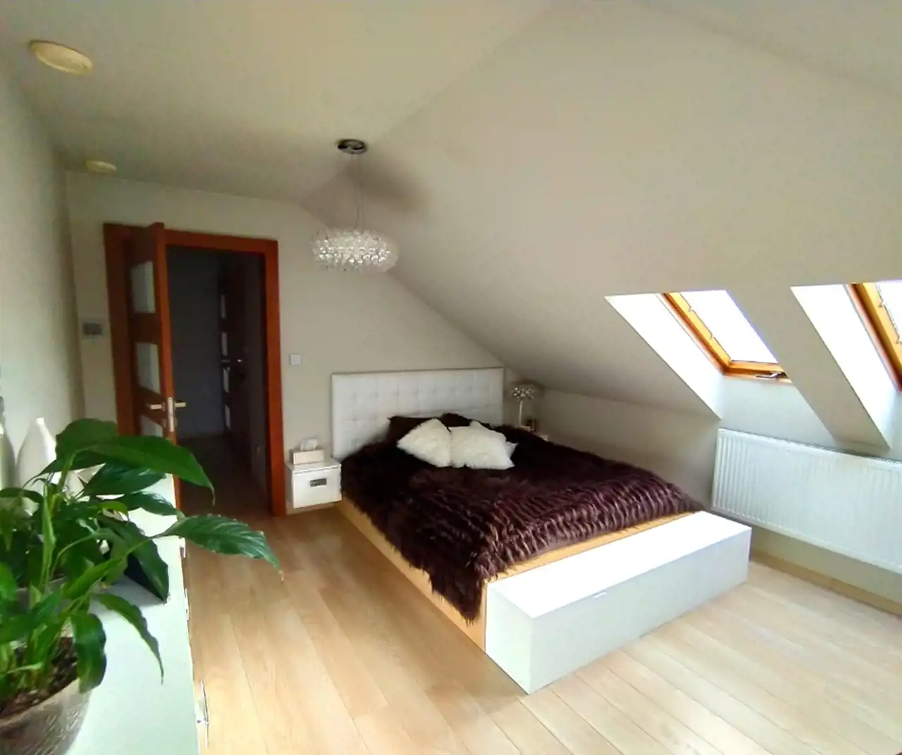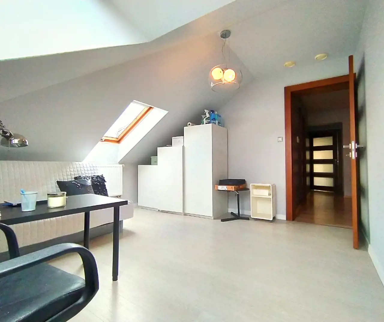 * na poddaszu zlokalizowane są 3 pokoje, z których jeden został podzielony na strefę dzienną oraz sypialnianą, przestronna łazienka z wanną, sauna, która jest prywatną strefą wellness i pozwala cieszyć się zdrowotnymi korzyściami w zaciszu swojego domu, garderoba, hall oraz pomieszczenie gospodarcze,
