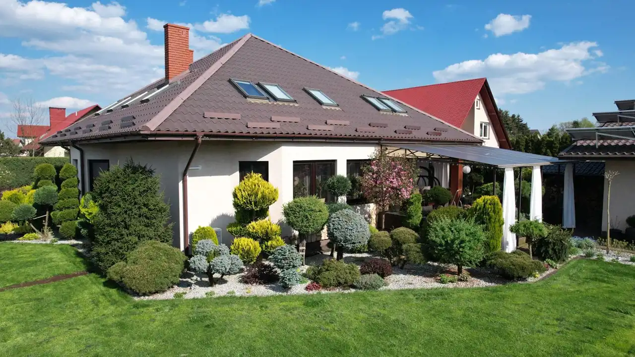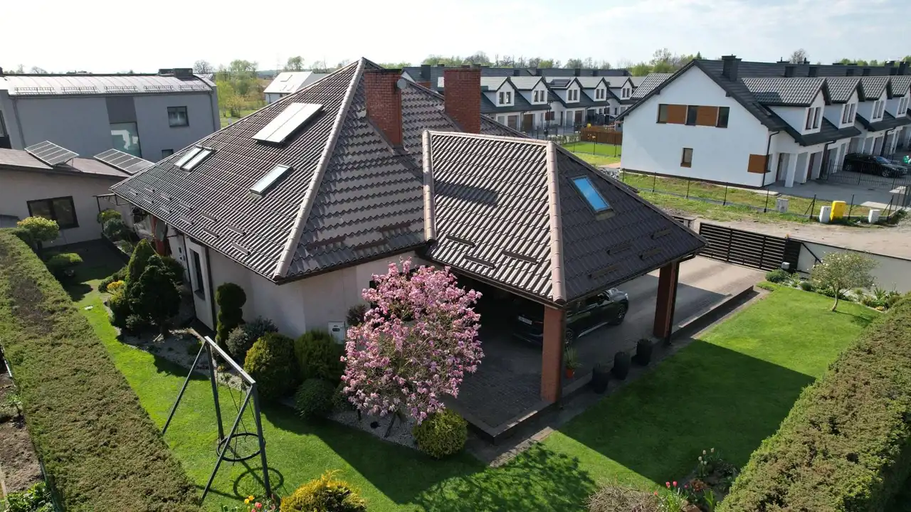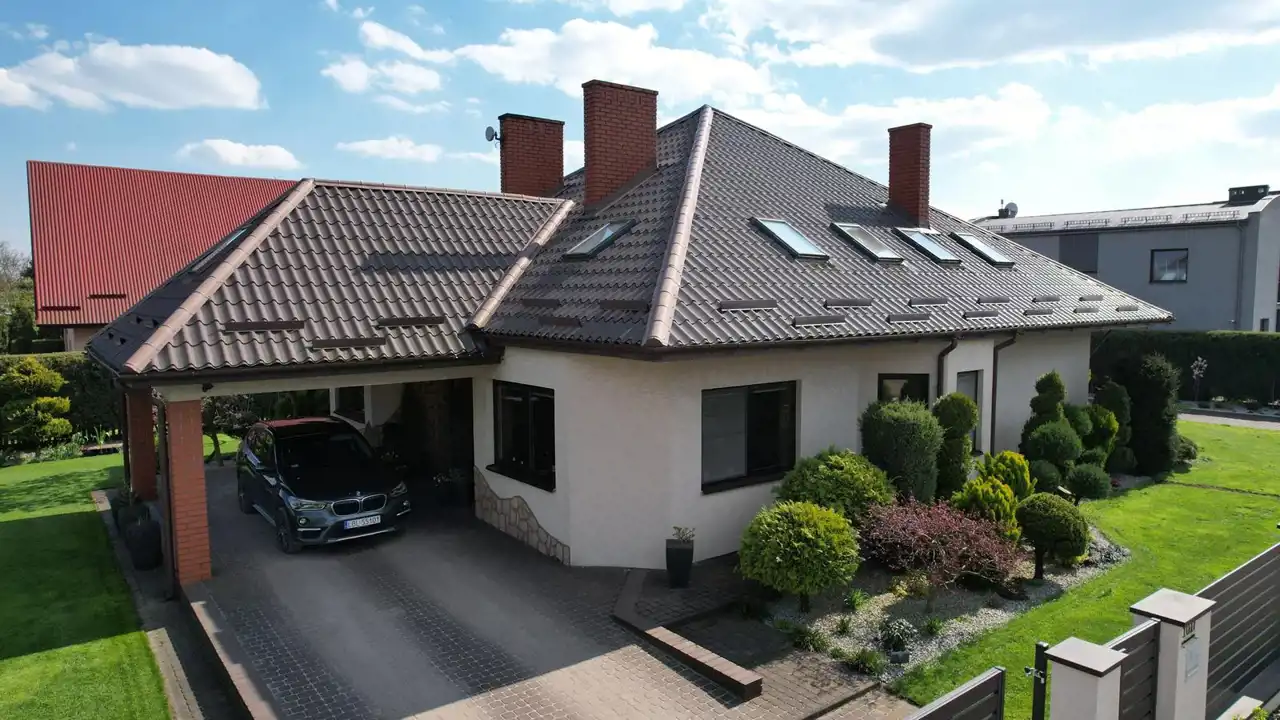 dach kryty blachodachówką, okna PCV,