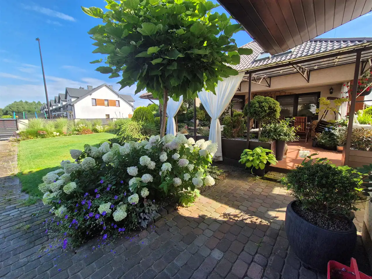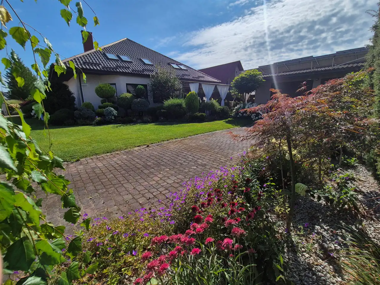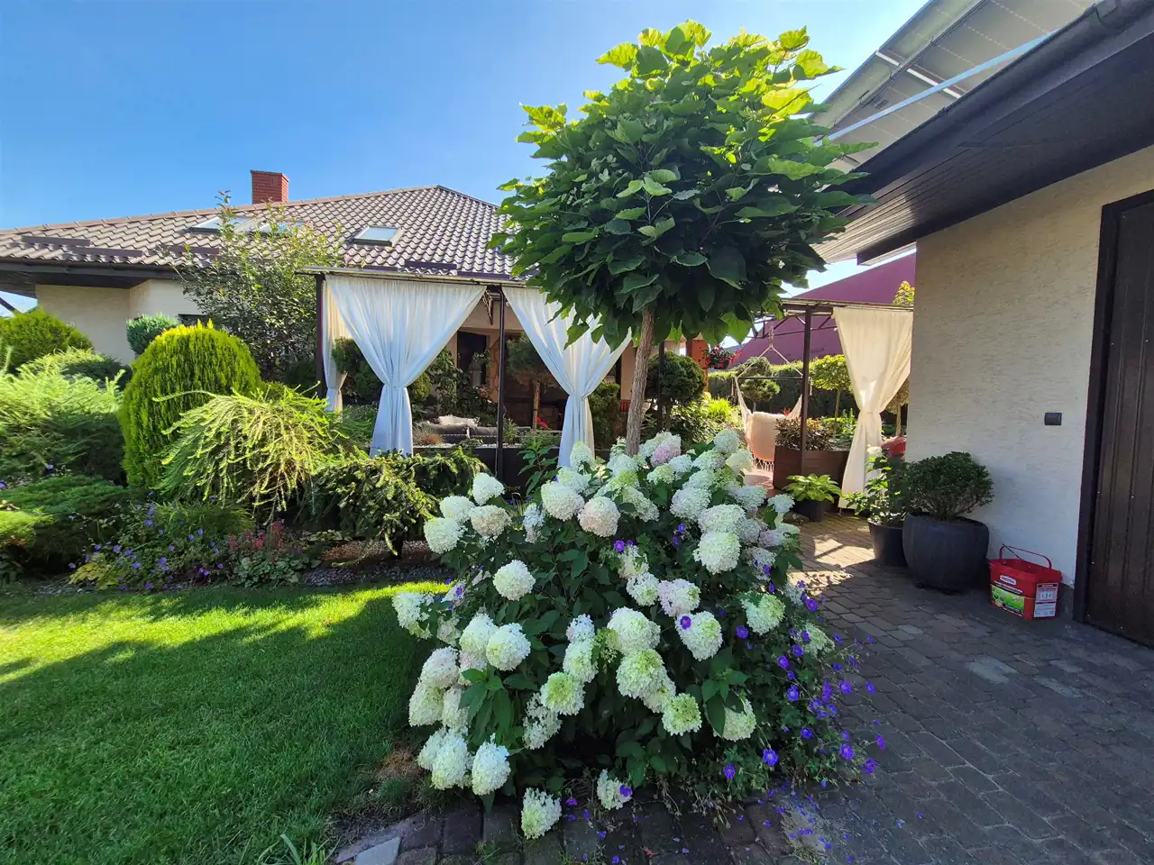 działka perfekcyjnie zagospodarowana z licznymi nasadzeniami roślin całorocznych oraz z wypielęgnowanymi krzewami kwitnącymi,