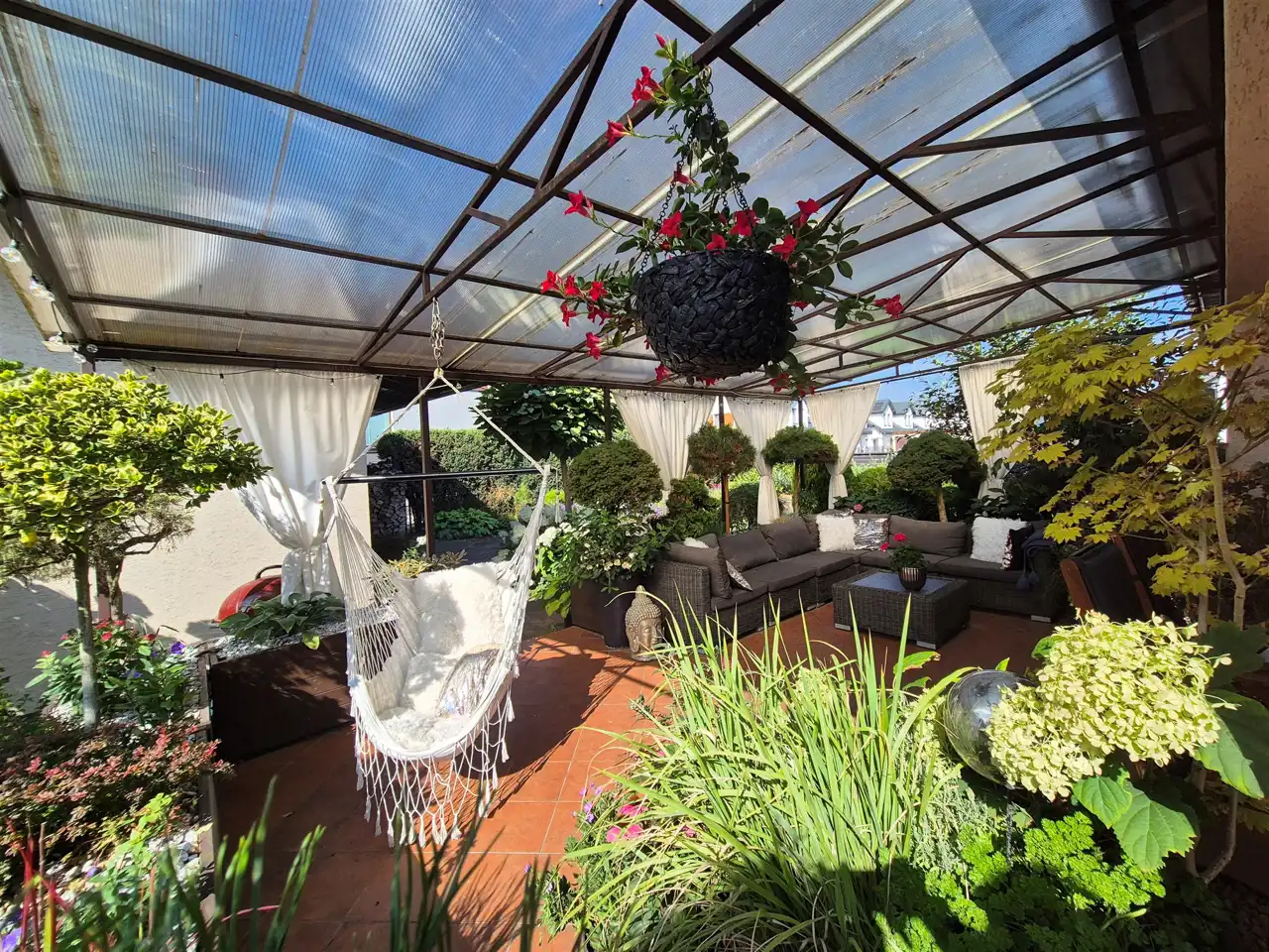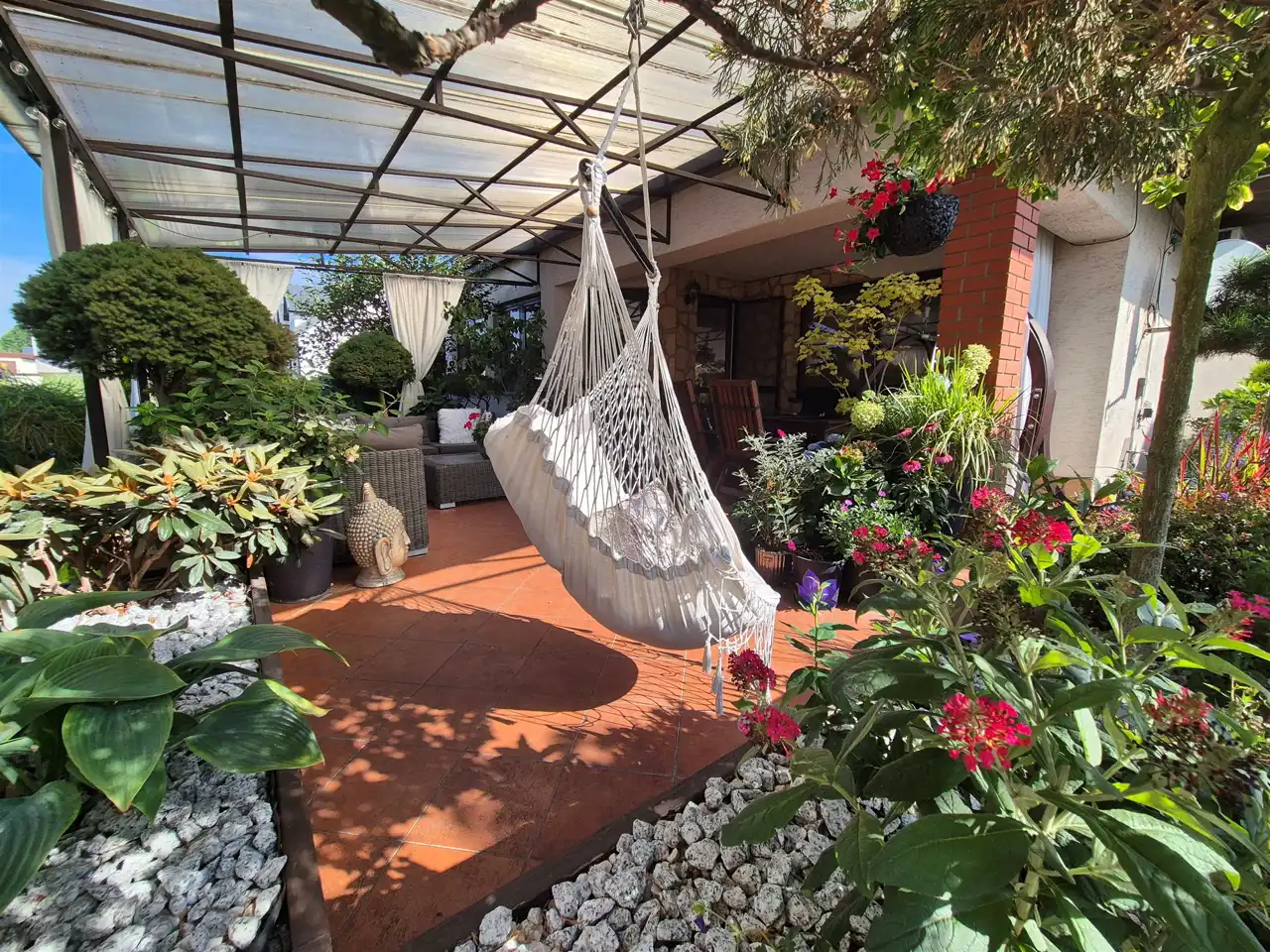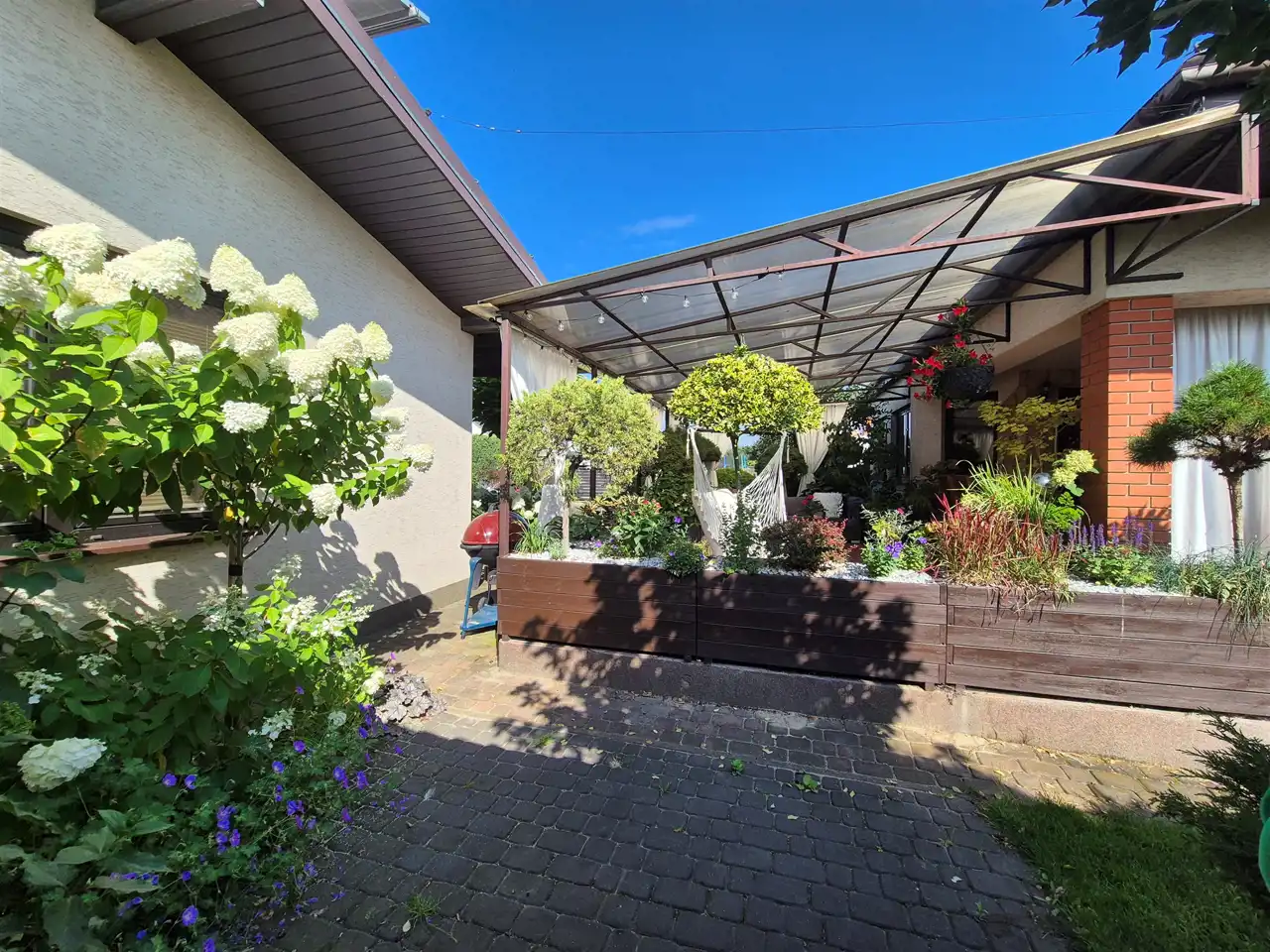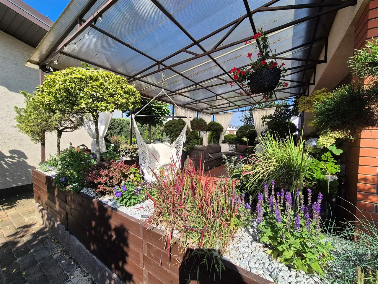 działka perfekcyjnie zagospodarowana z licznymi nasadzeniami roślin całorocznych oraz z wypielęgnowanymi krzewami kwitnącymi,