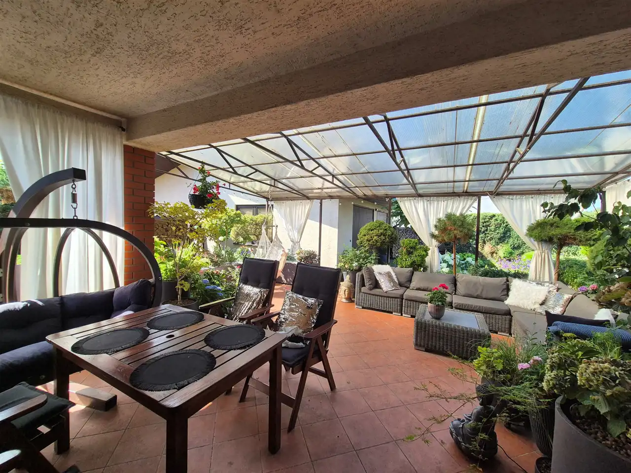 do budynku przylega rozległy, zadaszony taras o powierzchni ok. 40 m2 wyłożony płytkami, który może być miejscem codziennego relaksu i odprężenia, albo przestrzenią dla zorganizowania niezapomnianych spotkań rodzinnych i towarzyskich,