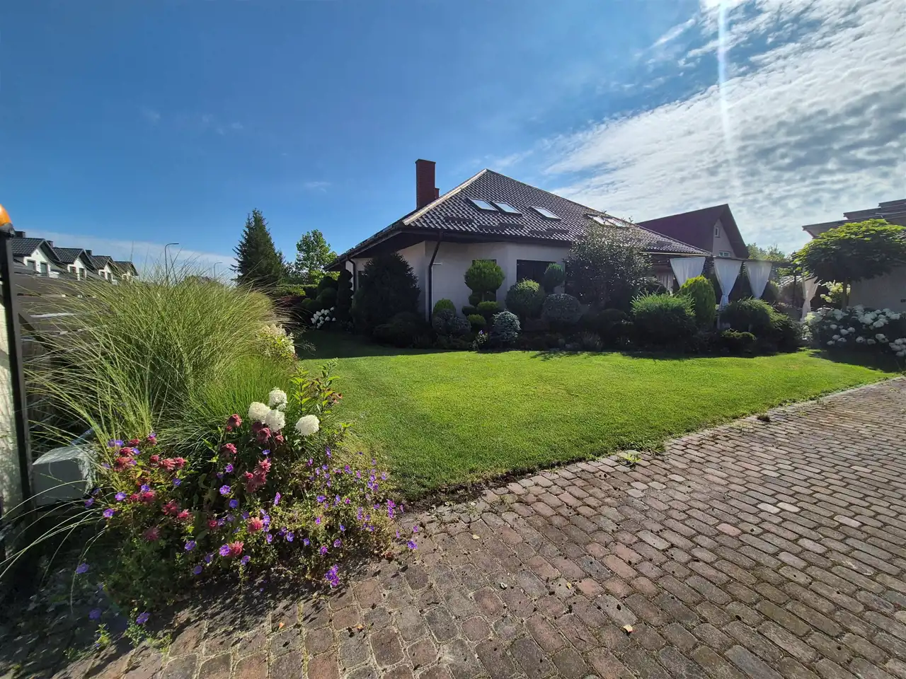 w otoczeniu zadbanego, wypielęgnowanego ogrodu