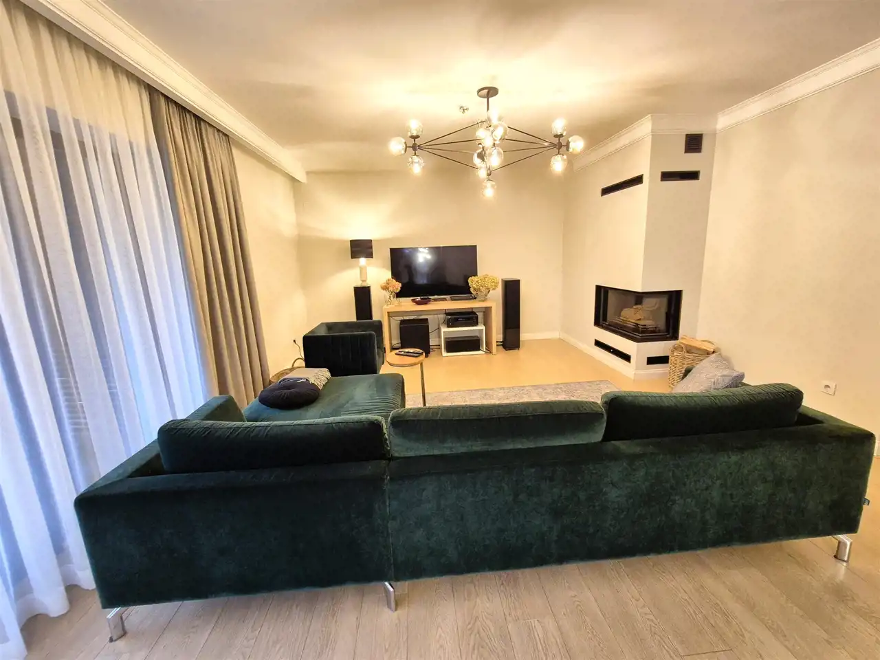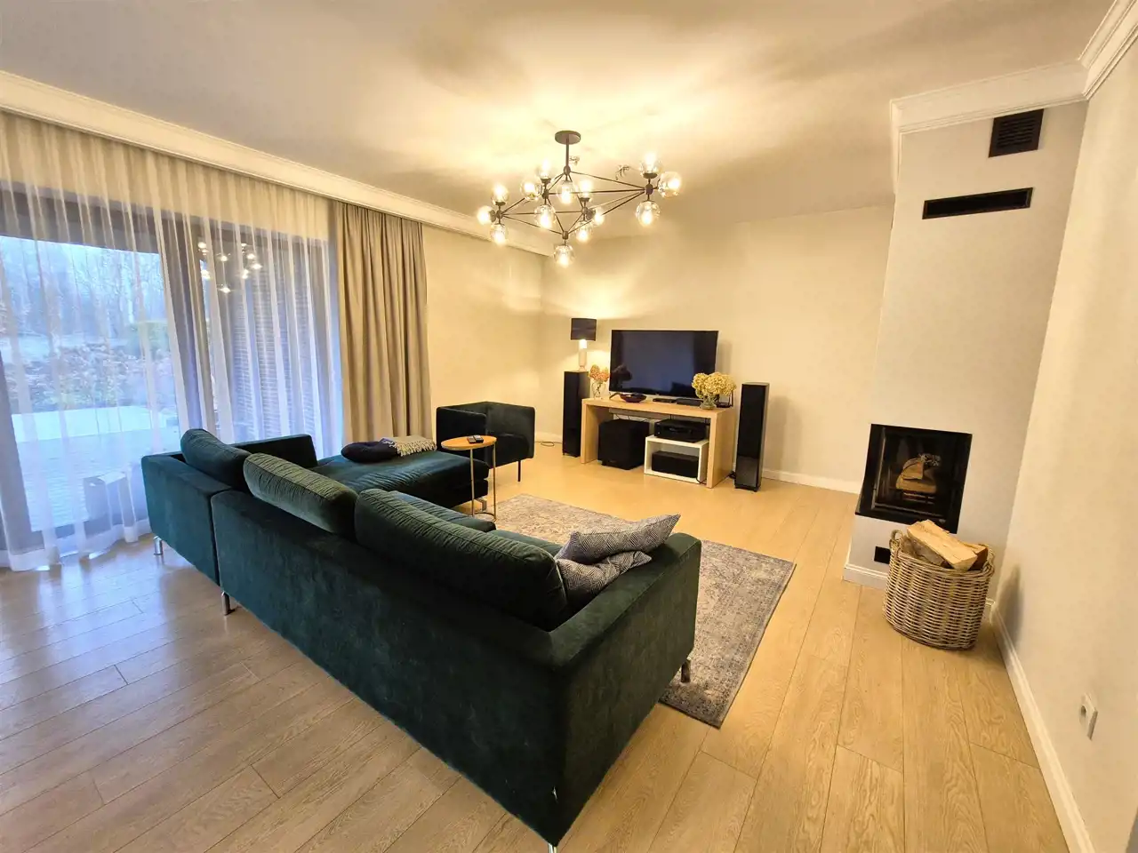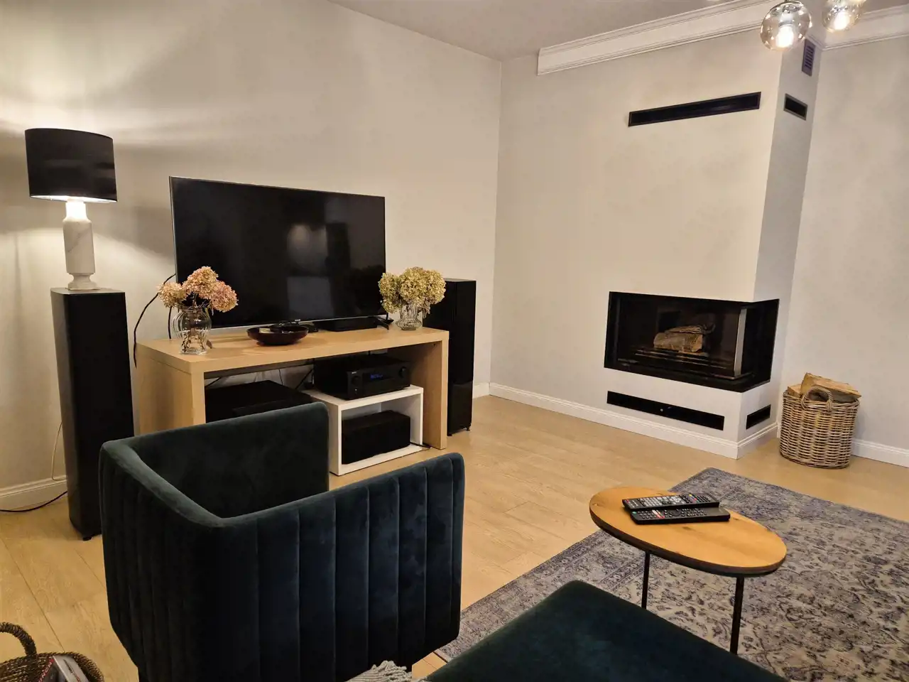 w salonie zamontowany klimatyczny kominek, który w chłodniejsze dni lub zimowe wieczory stanowi doskonałe uzupełnienie tradycyjnego ogrzewania ale także tworzy wyjątkową atmosferę,