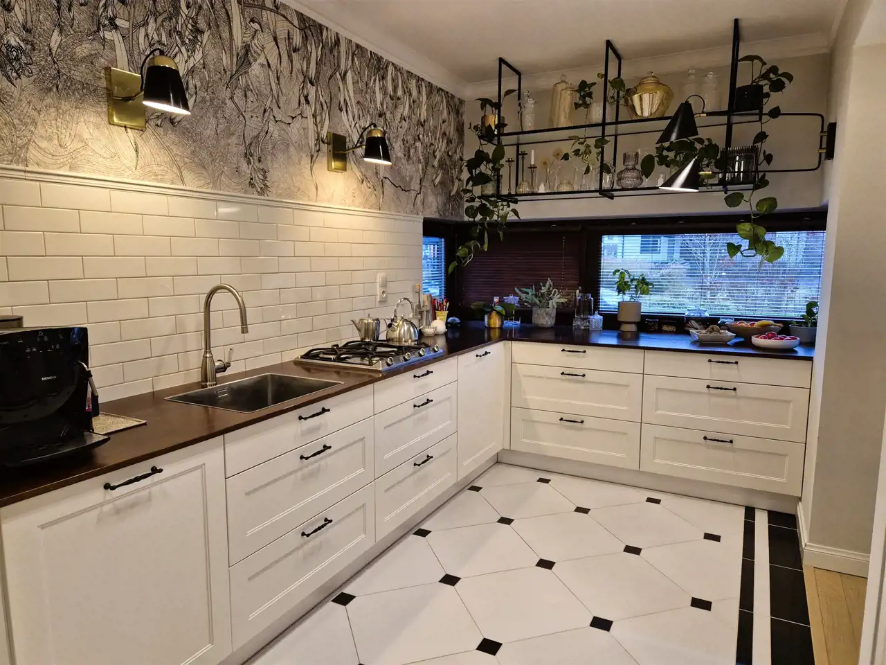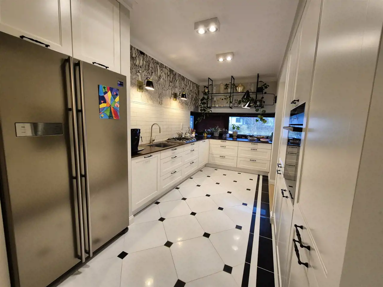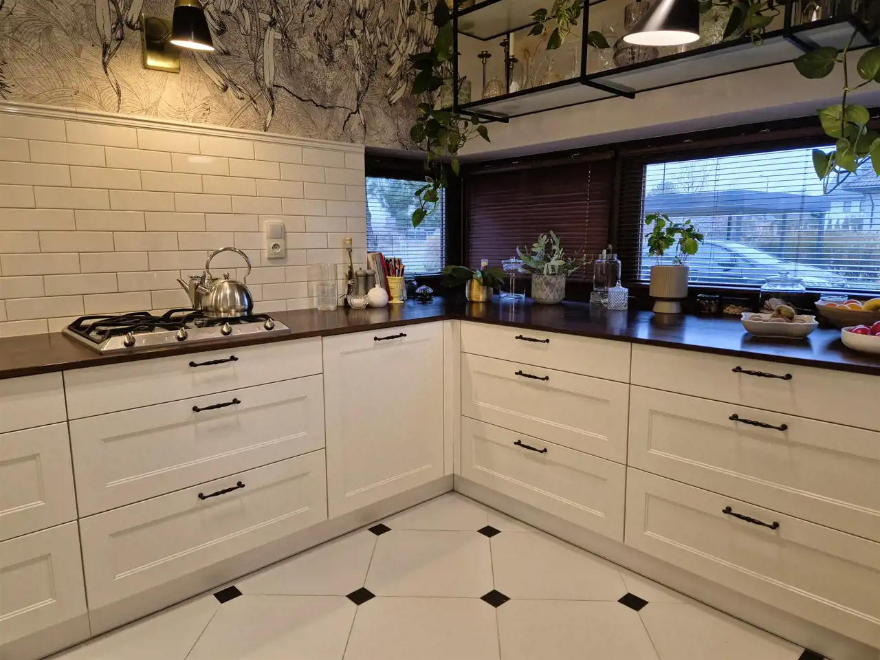 w kuchni zabudowa meblowa wraz ze sprzętem AGD- lodówka, zmywarka, płyta gazowa, piekarnik,