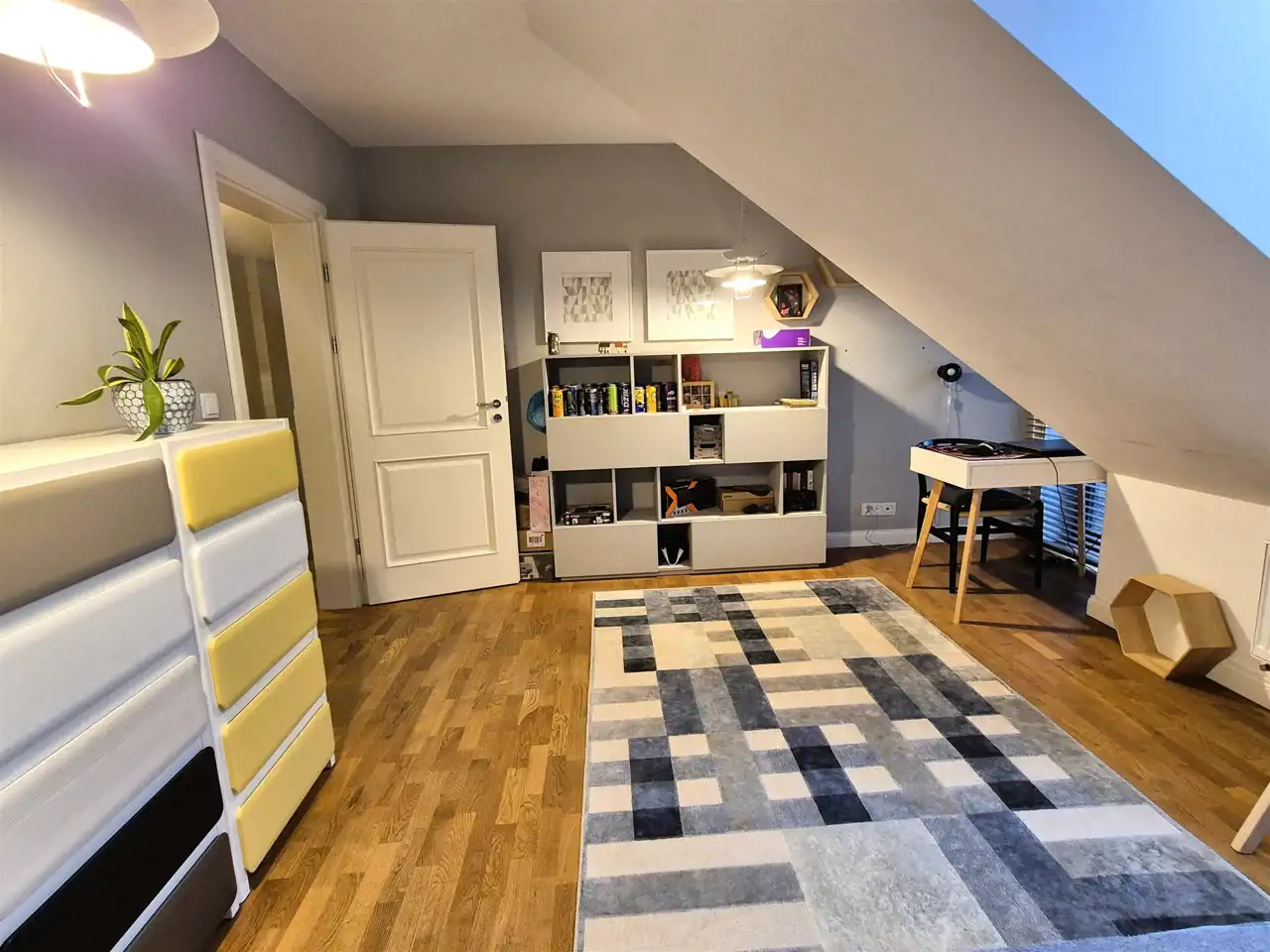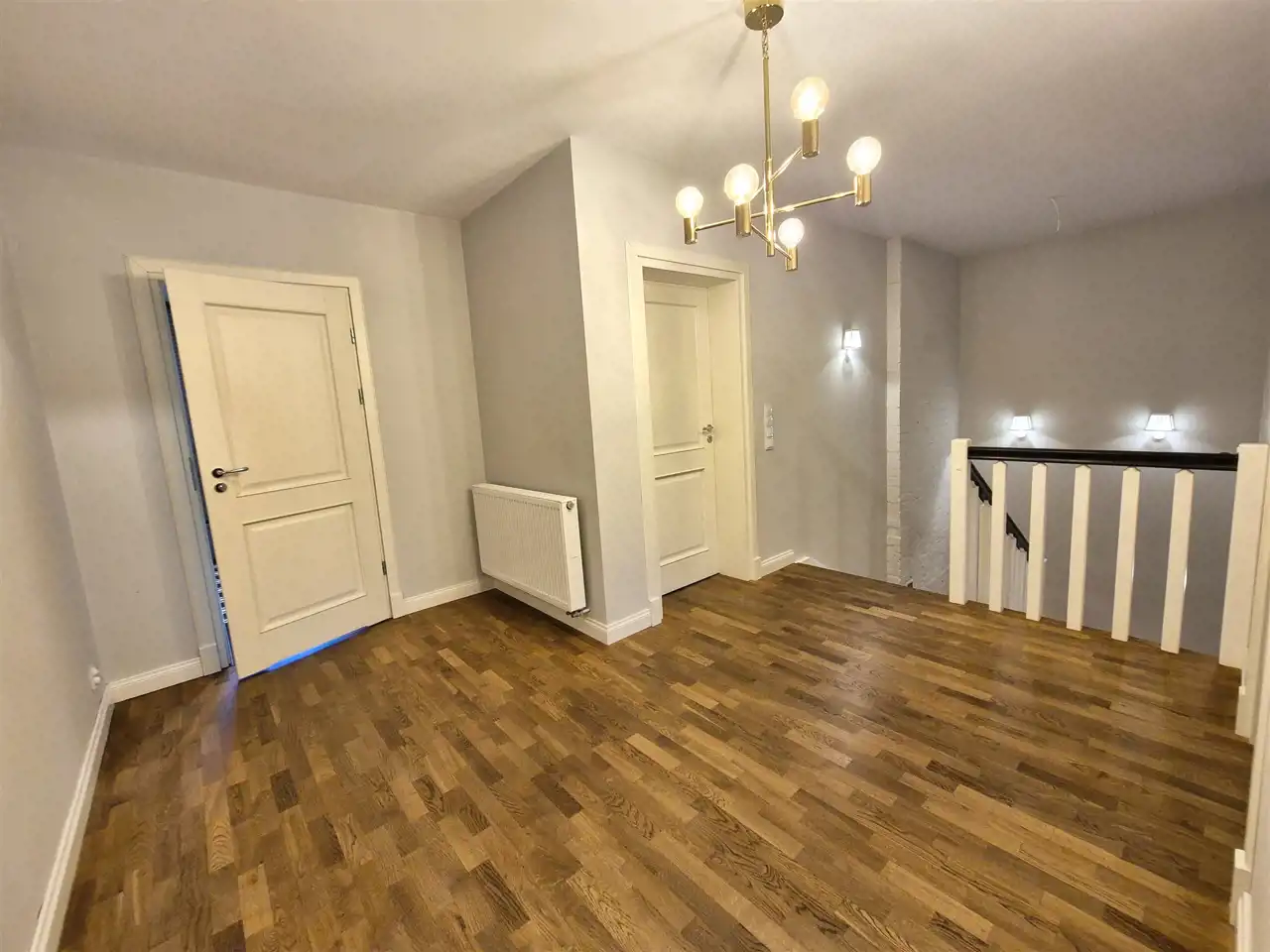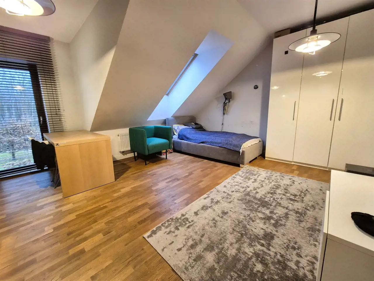 na podłogach: na poddaszu – parkiet dębowy , na parterze wysokiej klasy panele ,