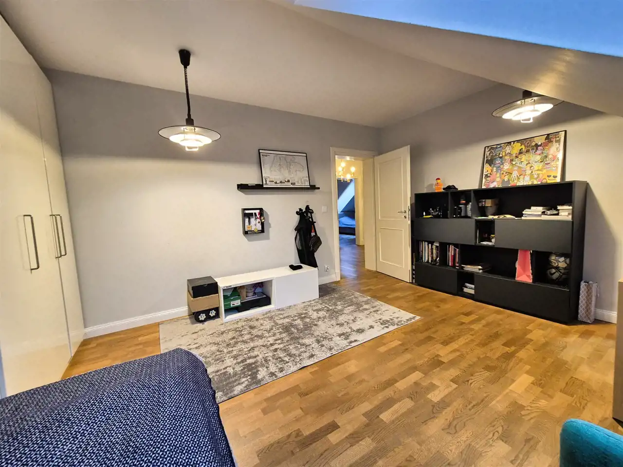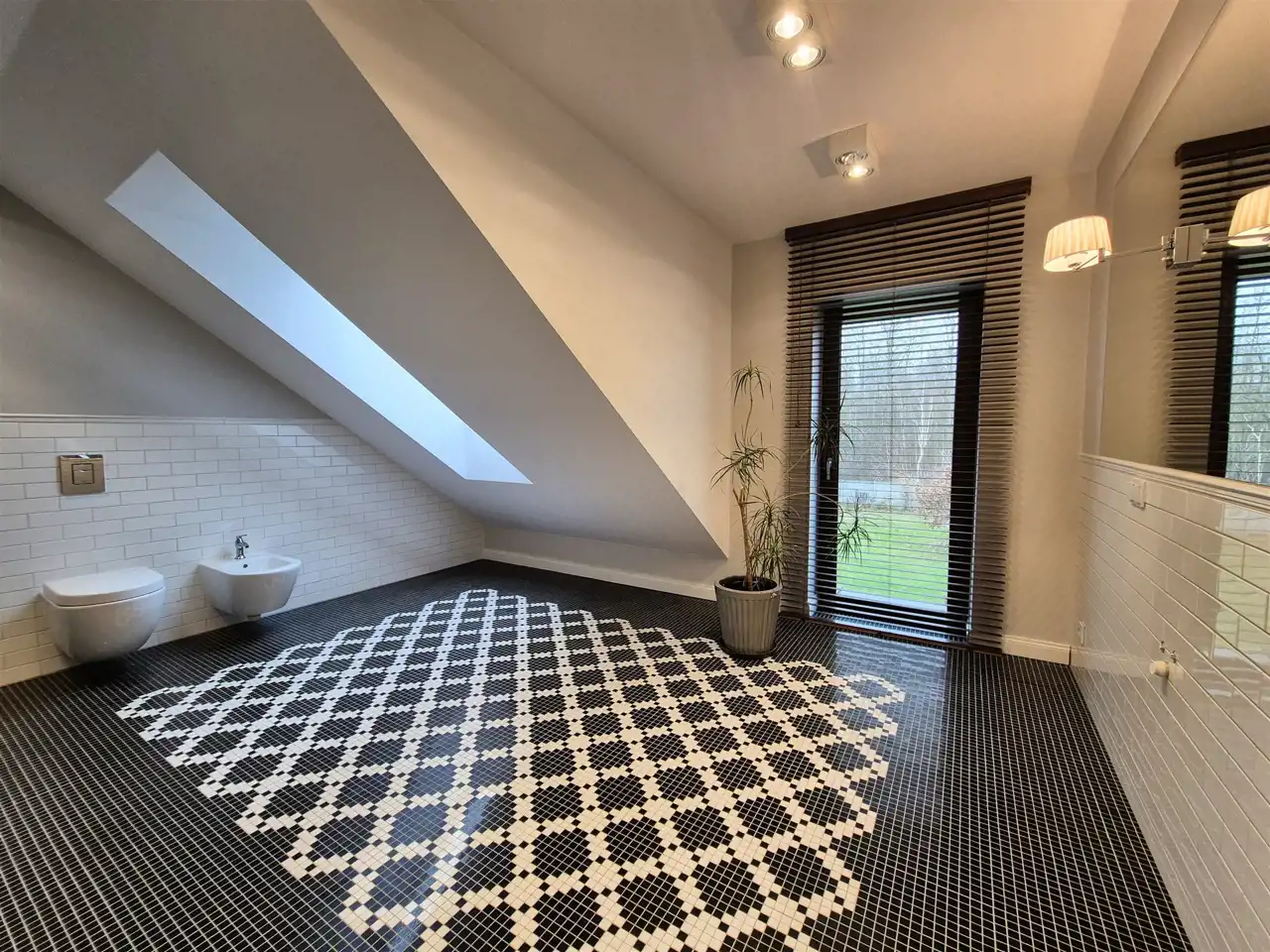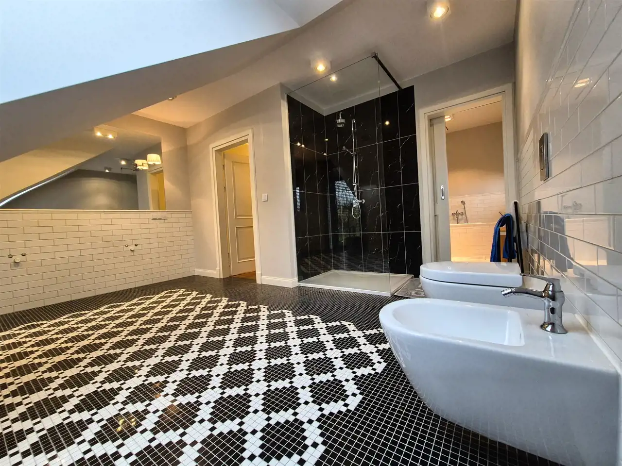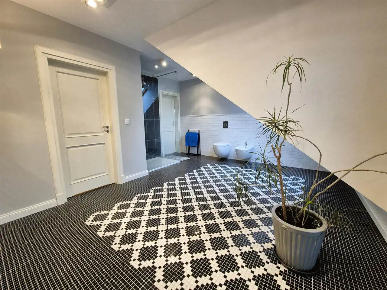 na podłogach: na poddaszu – parkiet dębowy , na parterze wysokiej klasy panele ,
