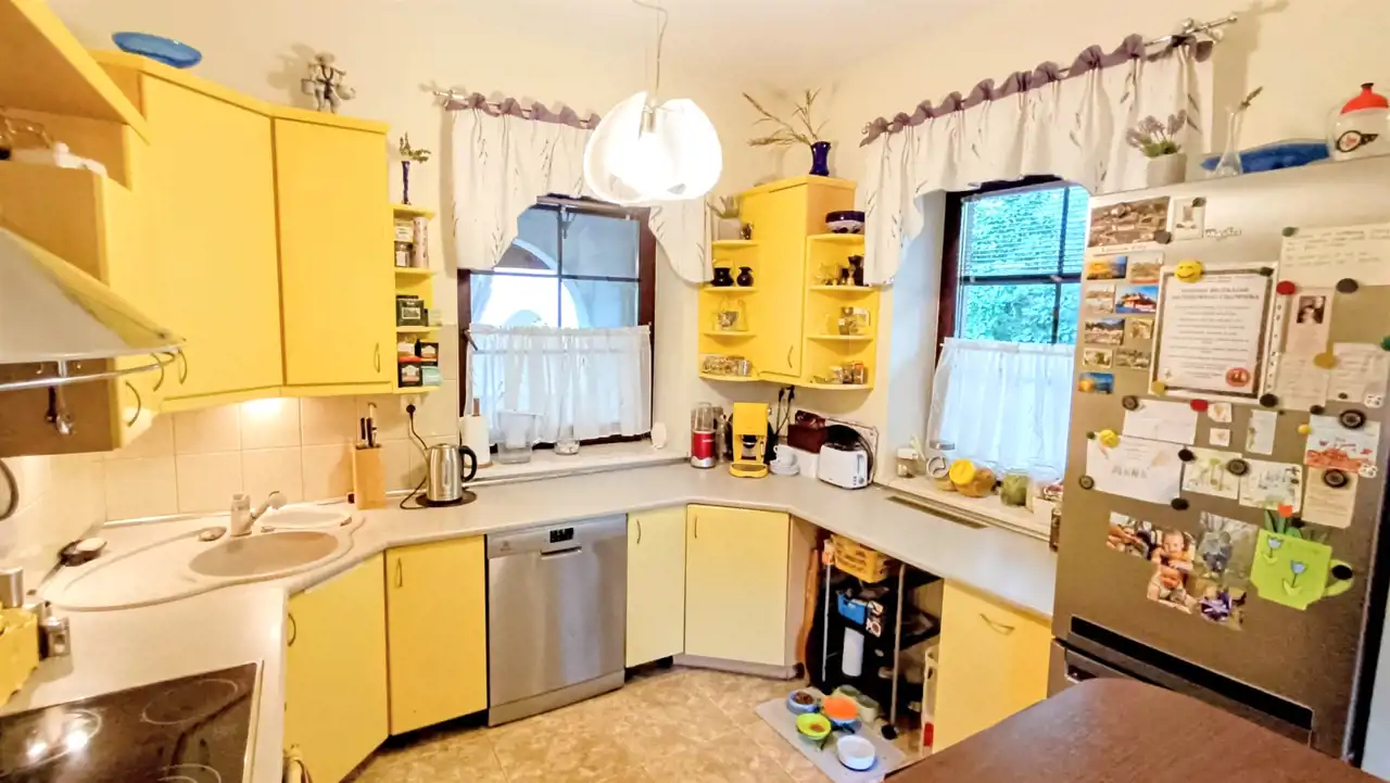 - sypialnia [21,8 m2], kuchnia [7,5 m2], łazienka z prysznicem i toaletą [6,6 m2], przedsionek [3,6 m2] umiejscowione na niższym poziomie [5 schodków] z niezależnym wejściem z zewnątrz mogące spełniać funkcję dodatkowego mieszkania dla seniora lub gości.